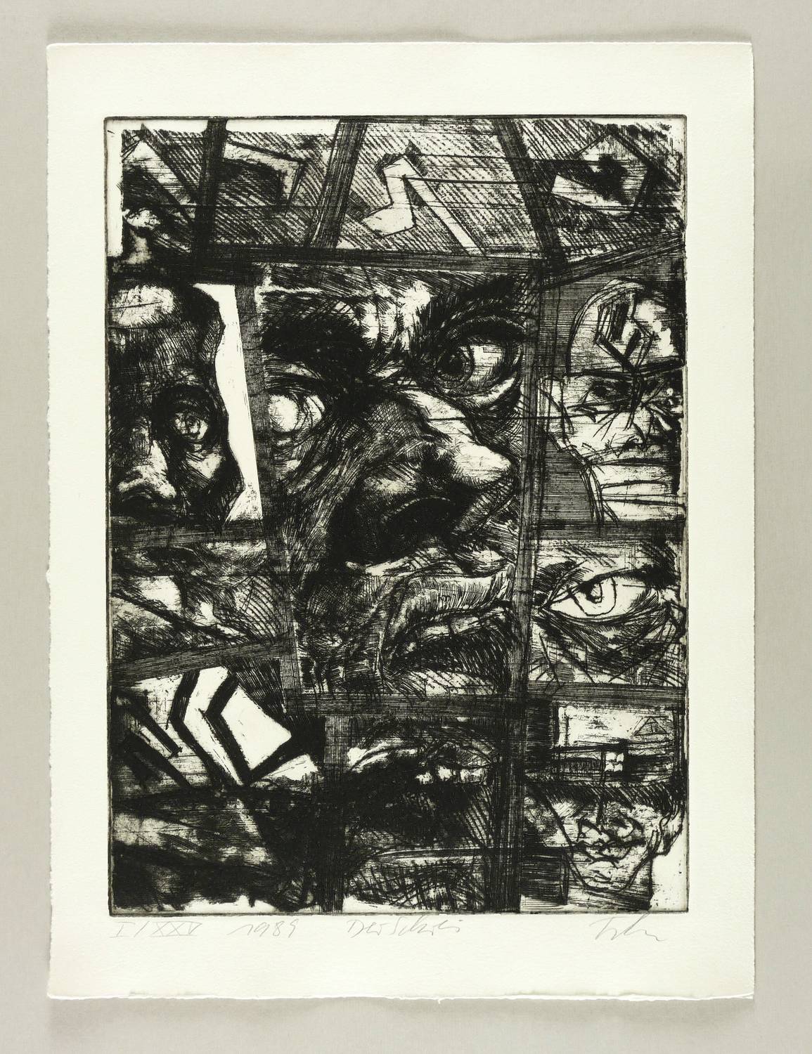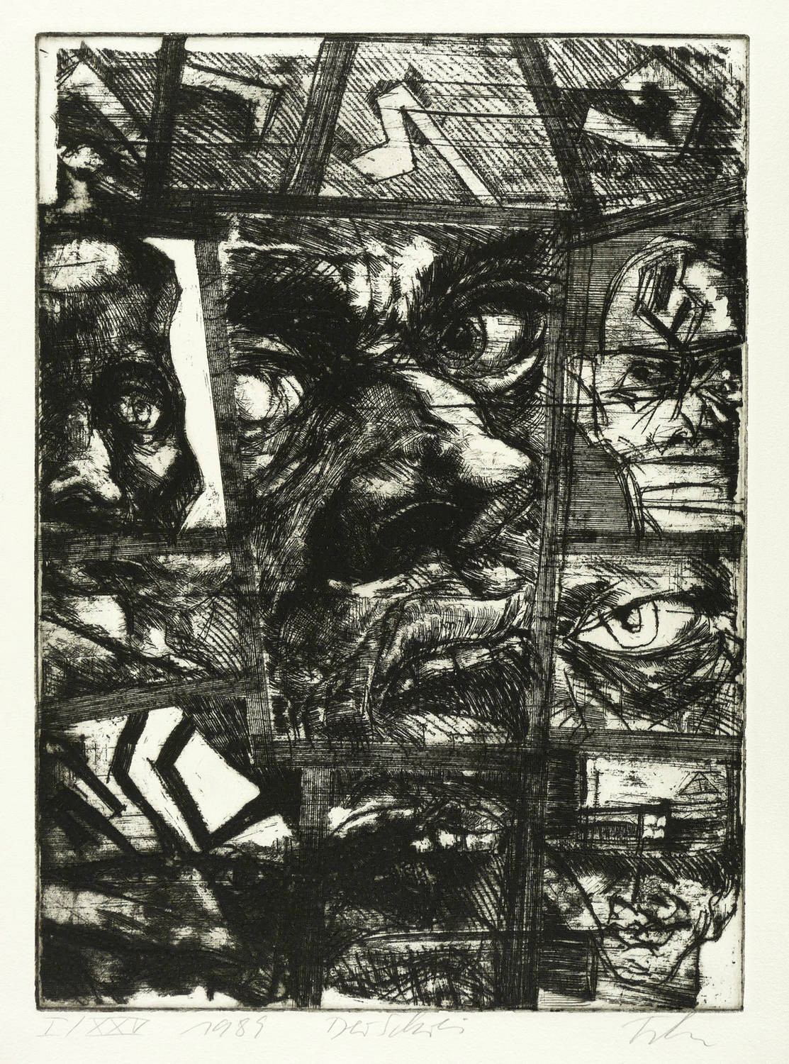 1989. Radierung / Vernis mou & Strichätzung, in Schwarz, auf schwerem hellchamois Hahnemühle. – Originale Künstlergrafik, von Hans Joachim Triebsch. – Auflage Exemplar Nr. I/XXV. – 44,5 x 32,3 cm (Darstellung / Platte), 53 x 40 cm (Blatt).