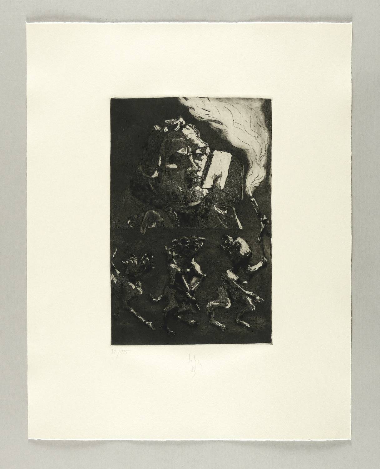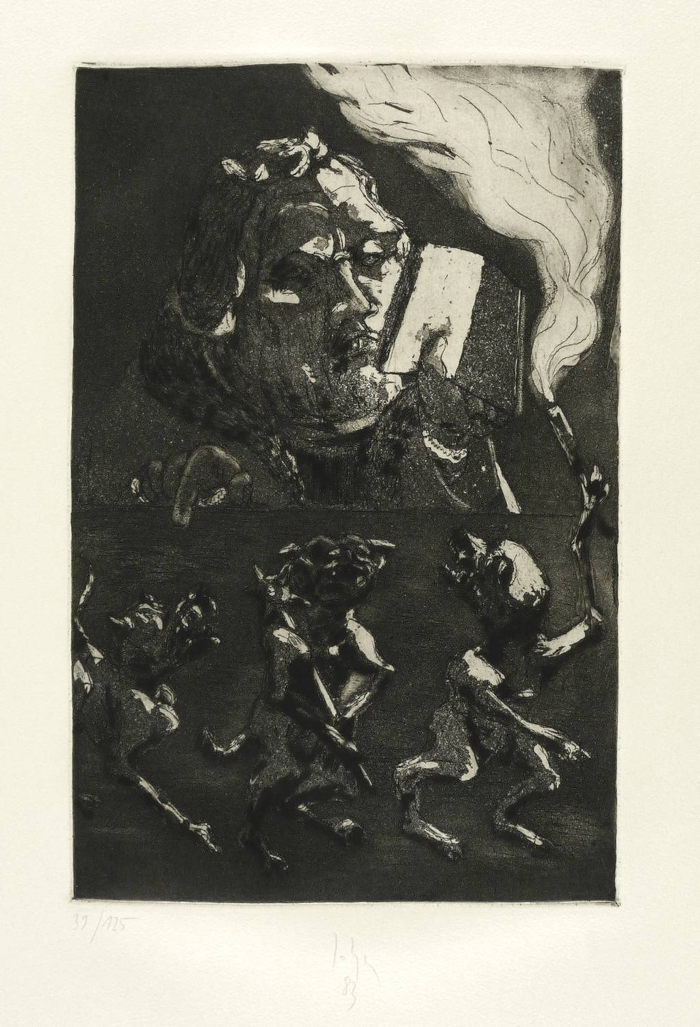 1983. Radierung / Aquatinta, in Schwarz, auf gelbem Velinkarton. – Originale Künstlergrafik, von Joachim John. – Auflage Exemplar Nr. 39/125. – 29,7 x 19,5 cm (Darstellung / Platte), 50 x 39 cm (Blatt).