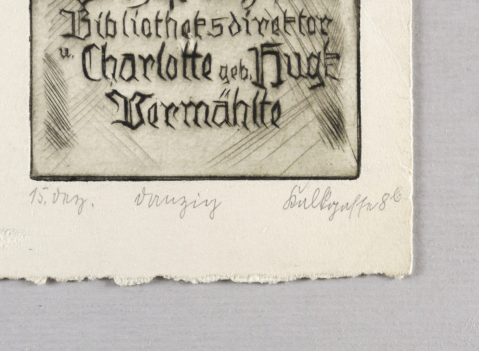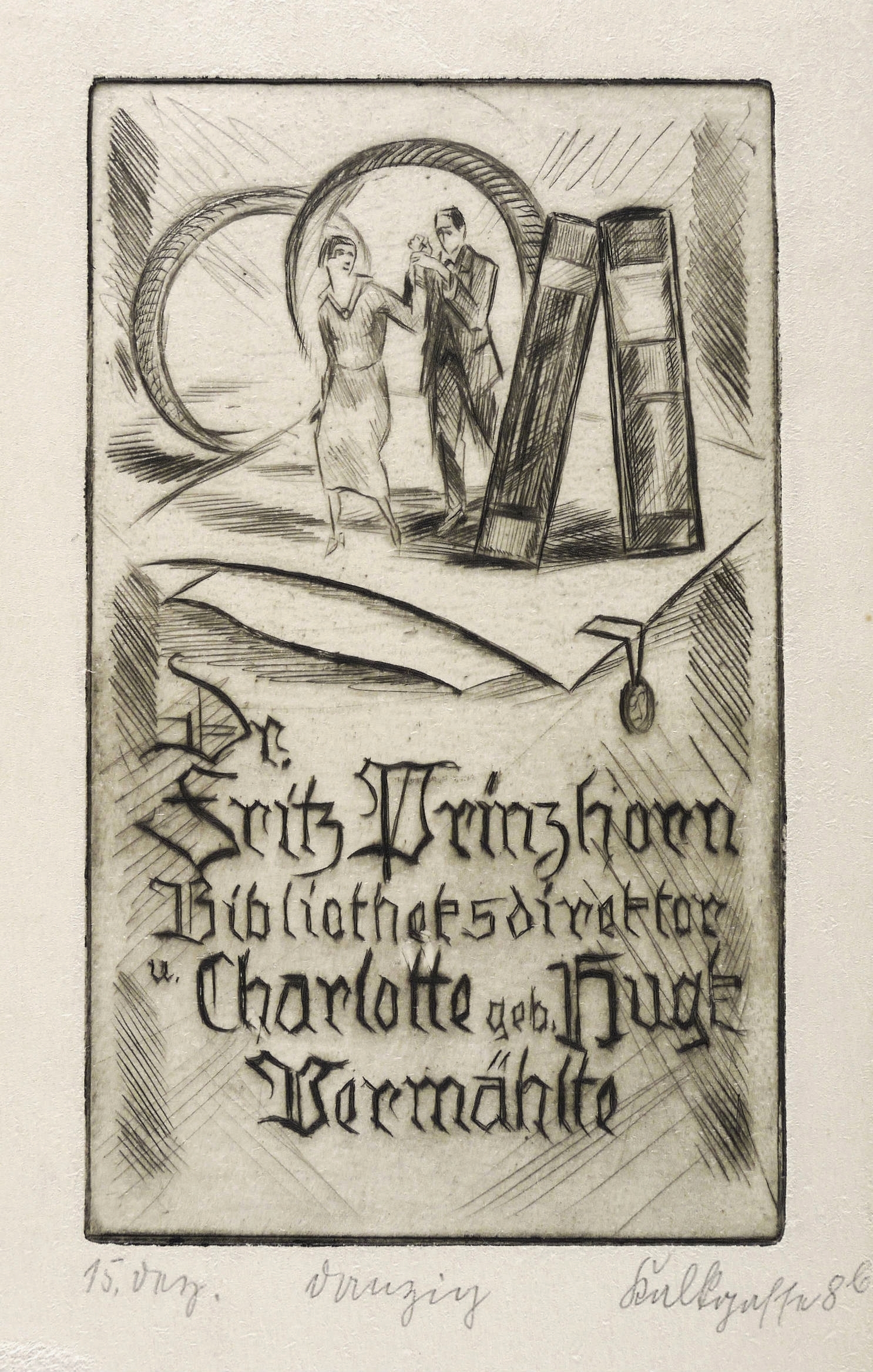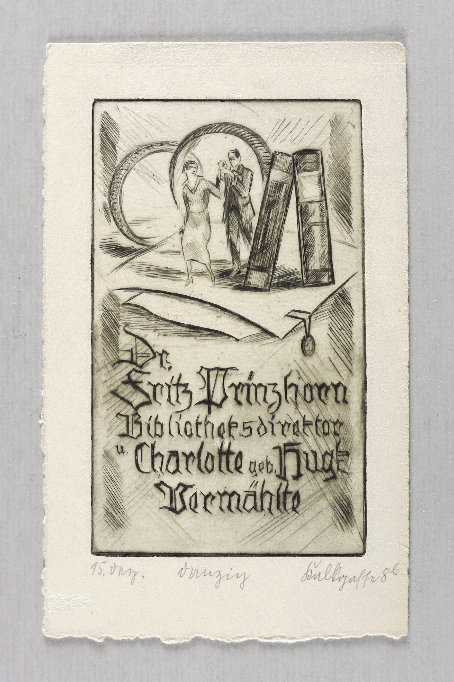 Nicht handsigniert. Unterhalb in Bleistift bezeichnet: ″15. Dez. // Danzig // Kalkgasse 8b″. In der Platte Inschrift: ″Dr. Fritz Prinzhorn Bibliotheksdirektor u. Charlotte geb. Hugk Vermählte″. – Guter Zustand.