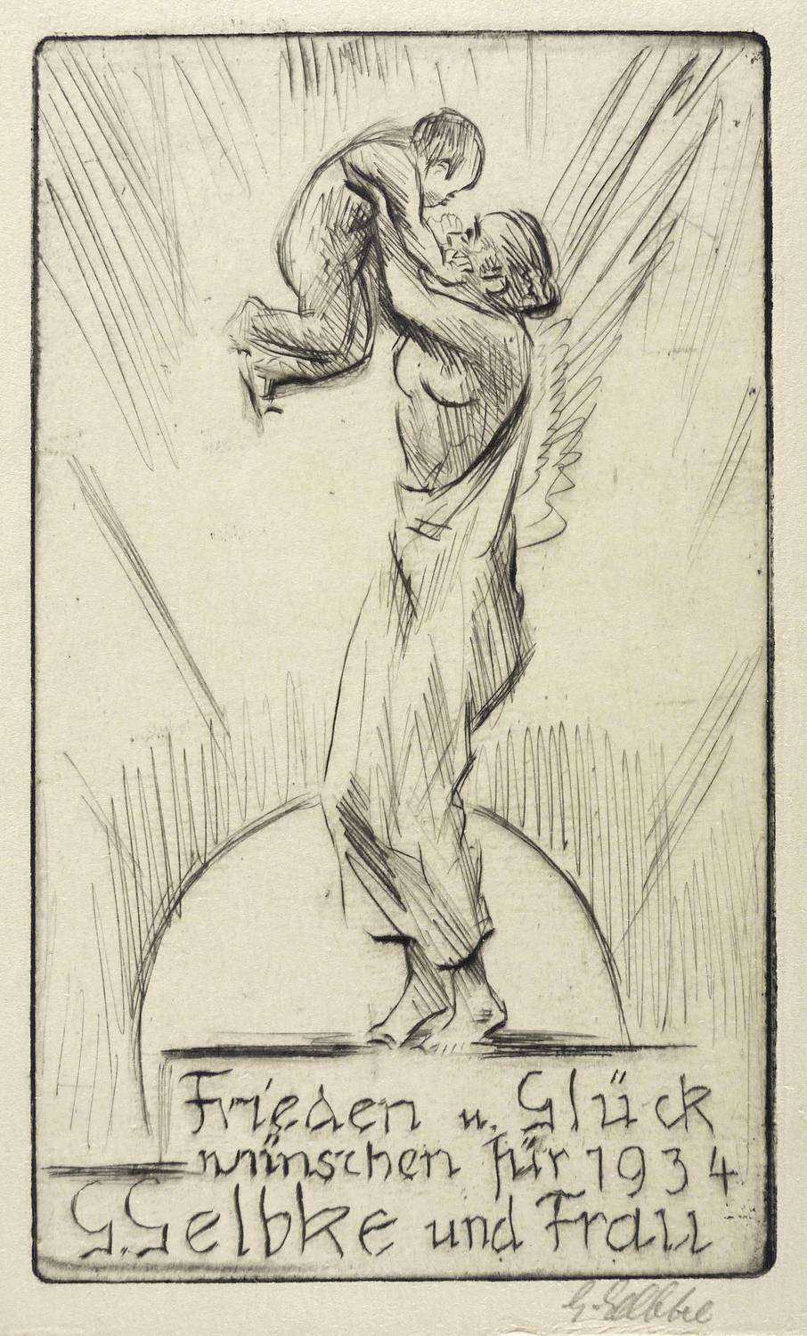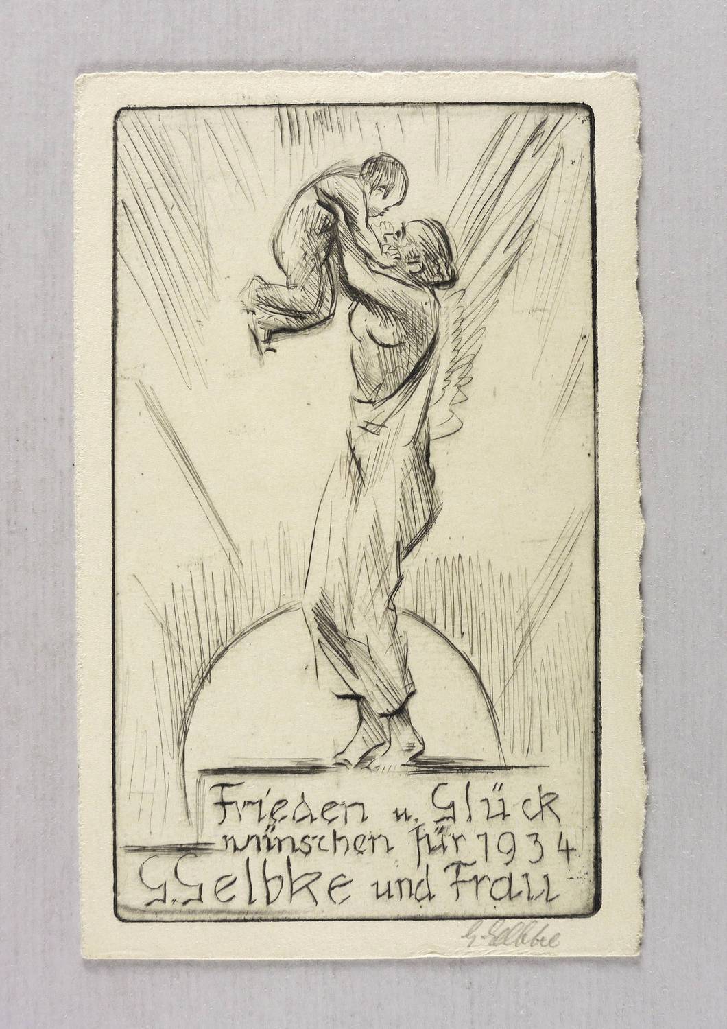Rechts unten in Bleistift signiert: ″G. Gelbke″. In der Platte Inschrift: ″Frieden und Glück für 1934 wünschen G. Gelbke und Frau″. – Tadellos. Sehr guter Zustand.