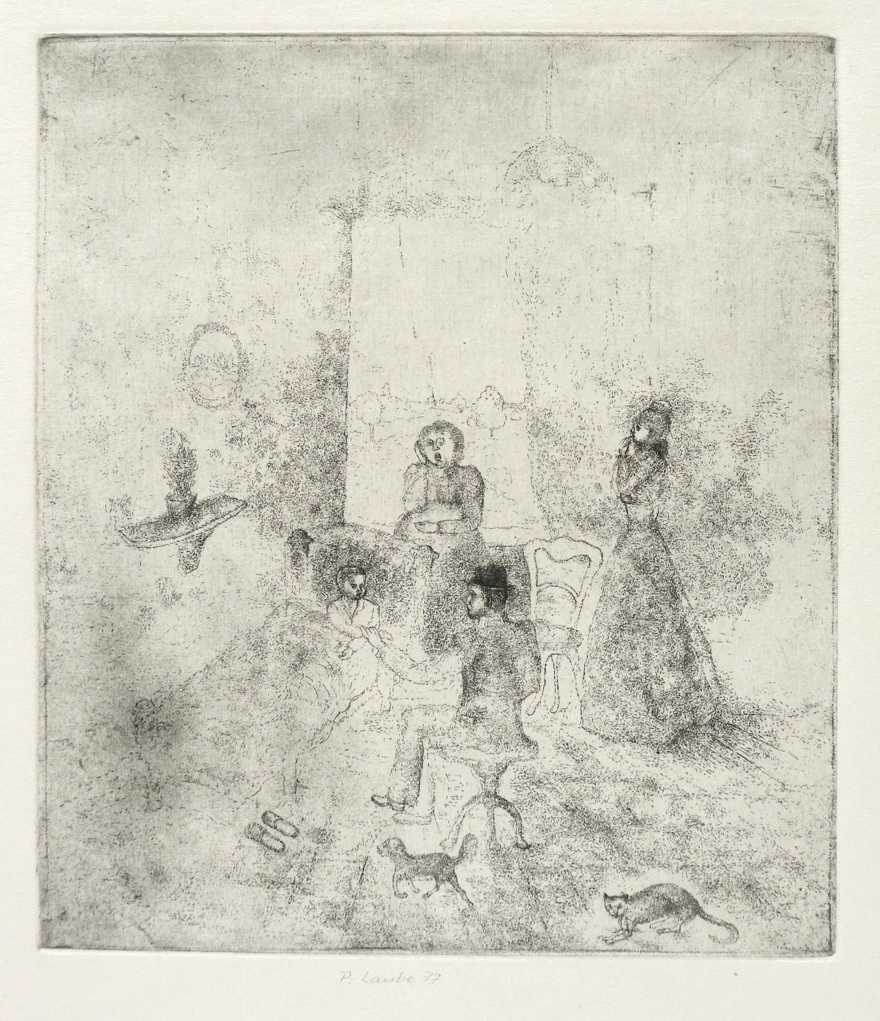 1977. Radierung / Strichätzung, in Schwarz, auf hartem hellgelbem Velin. – Originale Künstlergrafik, von Peter Laube. – 14,2 x 12,3 cm (Darstellung / Platte), 39 x 27 cm (Blatt).