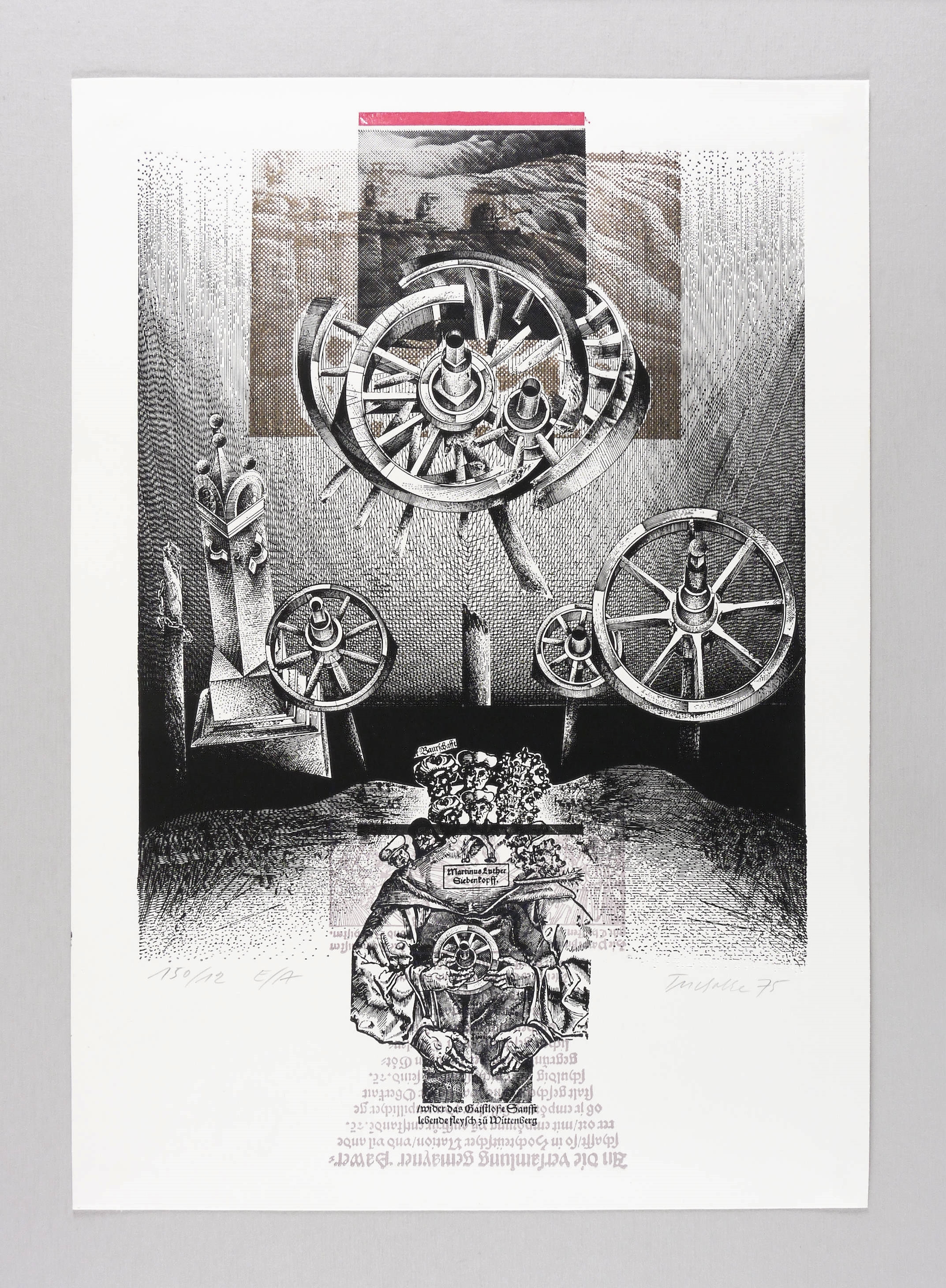 1975. Farbkombinationsdruck / Cliché, Siebdruck & Holzschnitt, in 4 Farben, auf glattem weißem Werkdruckkarton. – Originale Künstlergrafik, von Dieter Tucholke. – Auflage Exemplar Nr. 12/150. – 44,7 x 28,4 cm (Darstellung / Druckbild), 48 x 34 cm (Blatt).