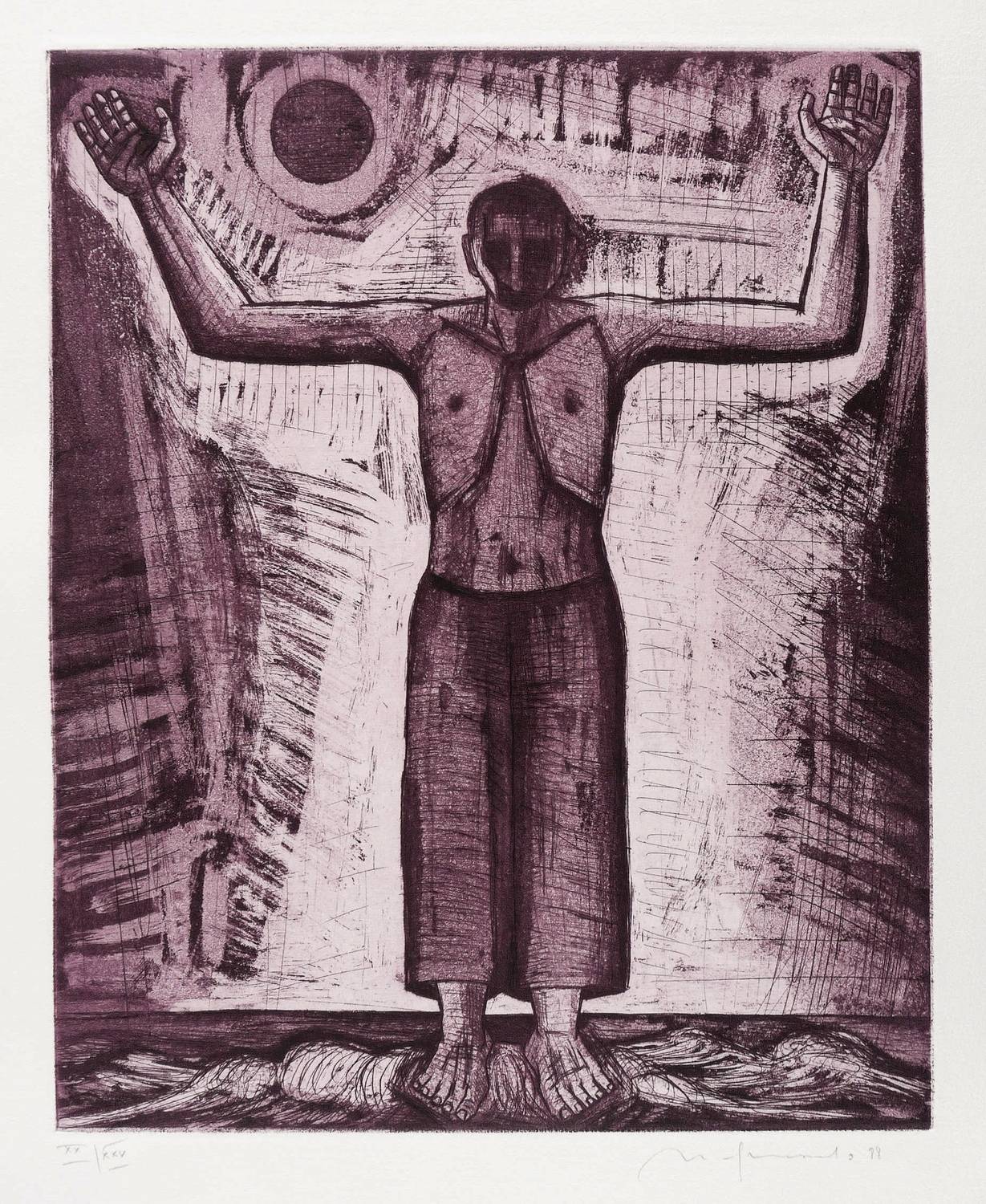 Wetterney 369 b. – Aus: Nuria Quevedo, Grafische Blätter zu Volker Braun. Der Eisenwagen (Halle/Leipzig: Mitteldeutscher Verlag 1988). – Rechts unten in Bleistift signiert und datiert: ″N. Quevedo 88″. Links Auflagenbezeichnung: ″X/XV″. Wasserzeichen der Hahnemühle. – Druck von Manfred Wolf, Berlin. - Abzug aus der römisch nummerierten Vorzugausgabe von 25 Exemplaren. – Tadelloses Exemplar. Sehr guter Zustand.