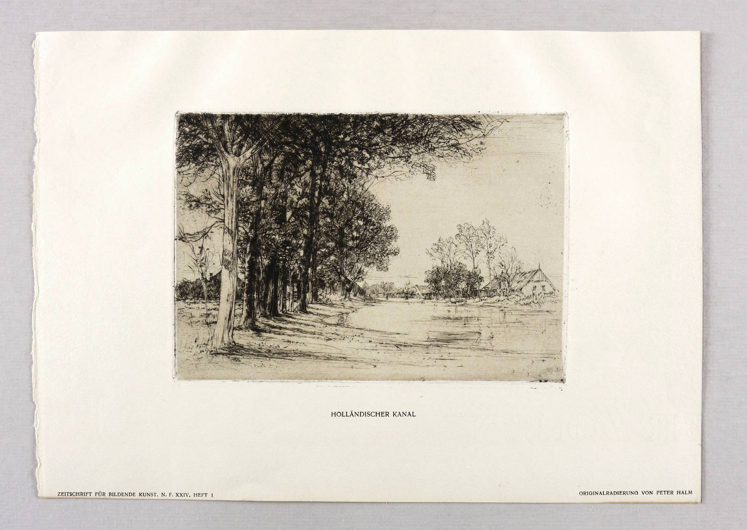 Aus: Zeitschrift für bildende Kunst (Leipzig: E.A. Seemann 1913), Bd. 24. – Nicht handsigniert. Unterhalb der Darstellung typografisch bezeichnet: ″HOLLÄNDISCHER KANAL // ORIGINALRADIERUNG VON PERTER HALM″. Links unten Verlagsadresse. Wasserzeichen der Papiermühle. – Sehr guter Zustand.