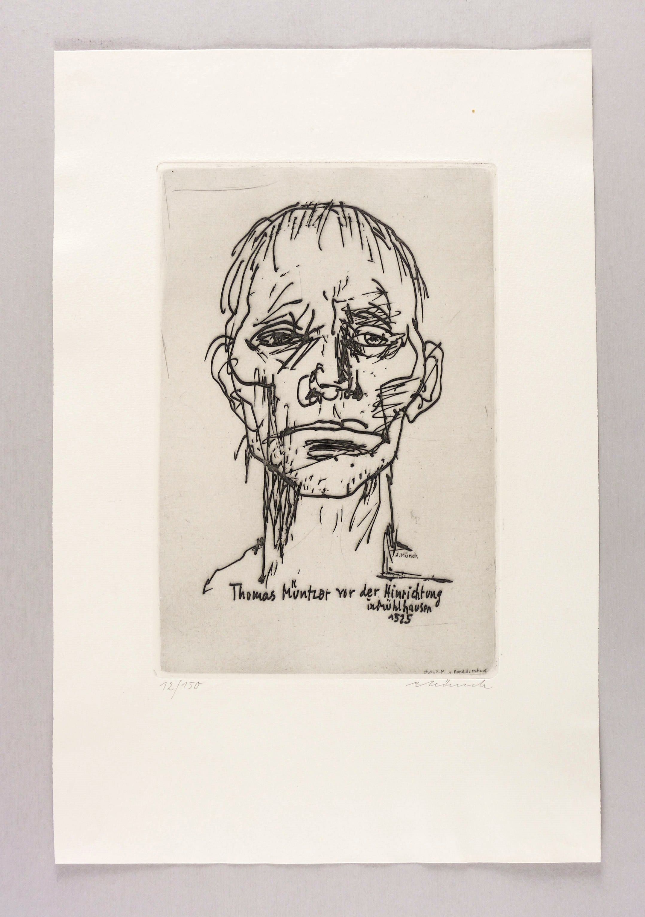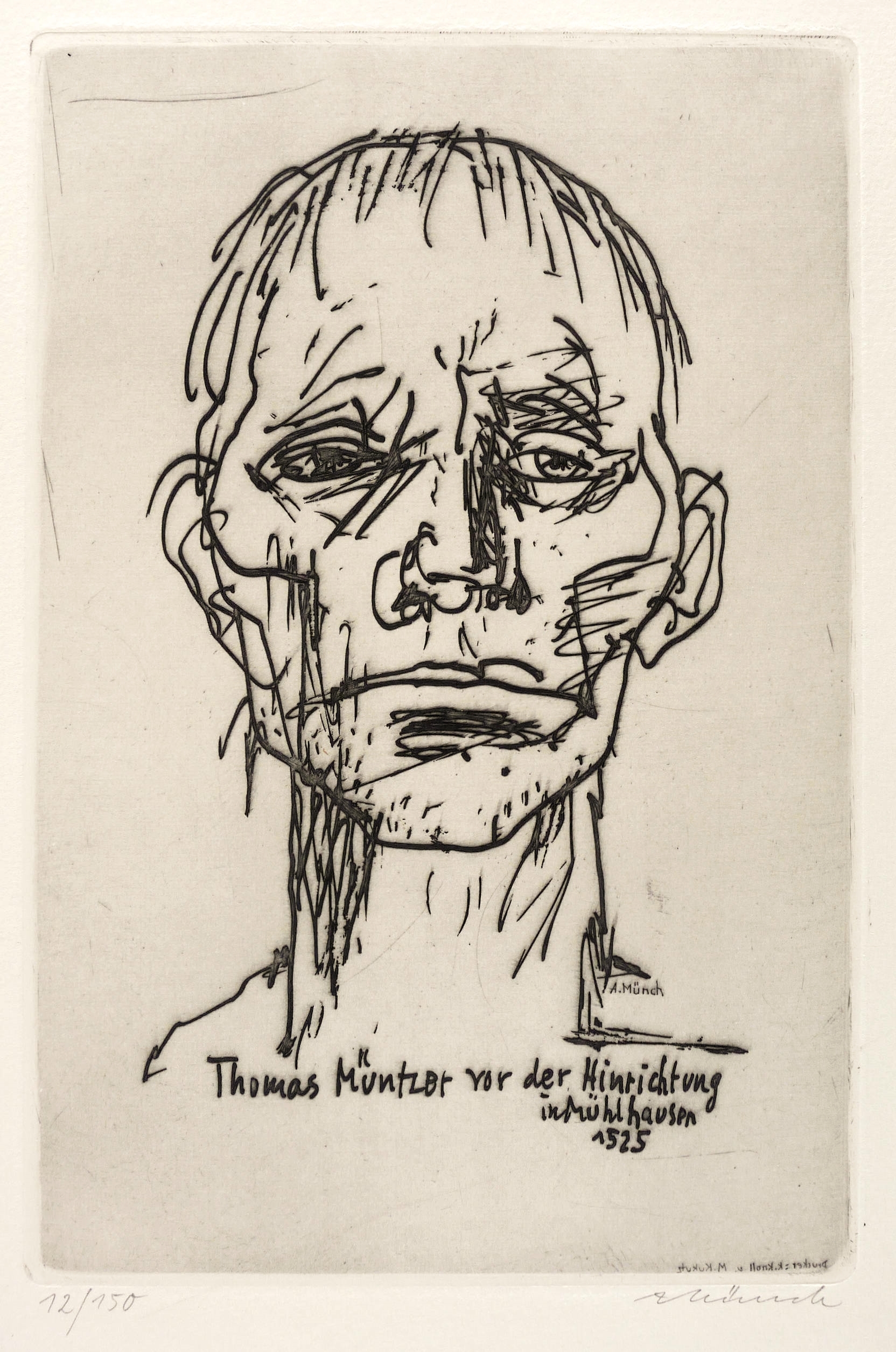 Aus: Grafik. Zum 450. Jahrestag des Deutschen Bauernkrieges 1975 (Berlin: Ministerium für Kultur der DDR 1975). – Rechts unten in Bleistift signiert. Links Auflagenbezeichnung. In der Platte Inschrift und Signatur. – Rückseitig in den Blattecken leichte Montagereste. Sehr guter Zustand.