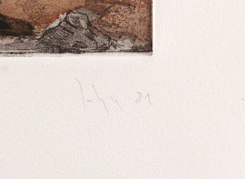 1981. Farbradierung / Strichätzung, Aquatinta, Vernis mou & Kaltnadel, in in Rotbraun & Schwarz, auf schwerem hellchamois Hahnemühle. – Originale Künstlergrafik, von Joachim John. – Auflage Exemplar Nr. 15/100. – 40 x 54 cm (Blatt), 25,1 x 31,1 cm (Darstellung / Platte).