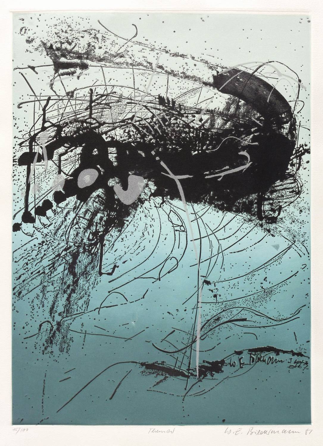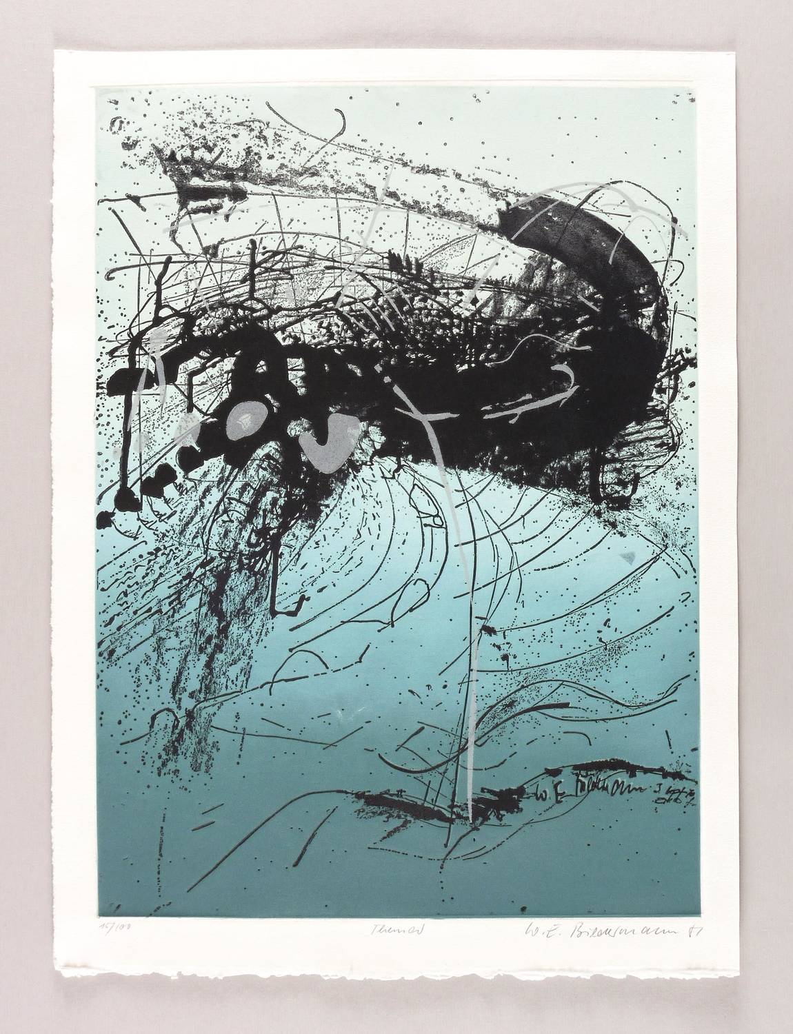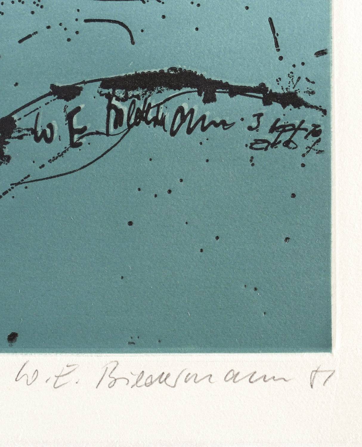 Aus: Jubiläumsmappe II. Farbige Grafik (Leipzig: Galerie am Sachsenplatz 1981). – Rechts unten signiert und datiert: ″W.E. Biedermann 81″. Links Auflagenbezeichnung: ″15/100″. Mittig Titel: ″Themar″. In der Platte rechts unten signiert. – Sehr guter Zustand.
