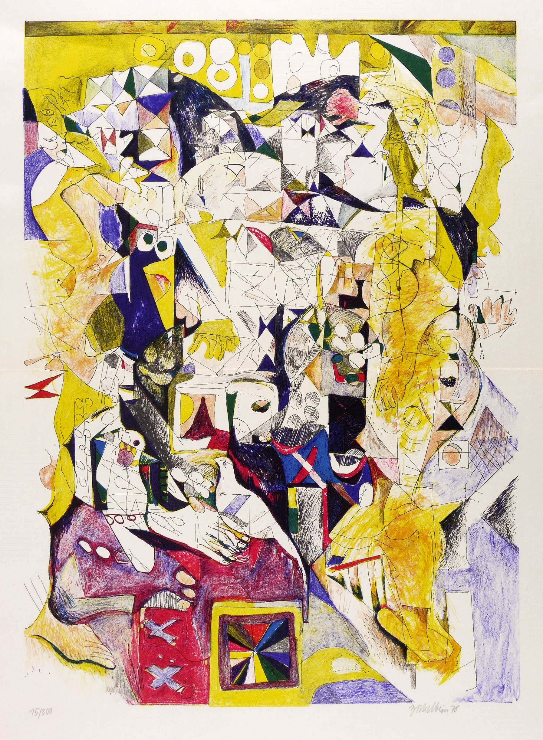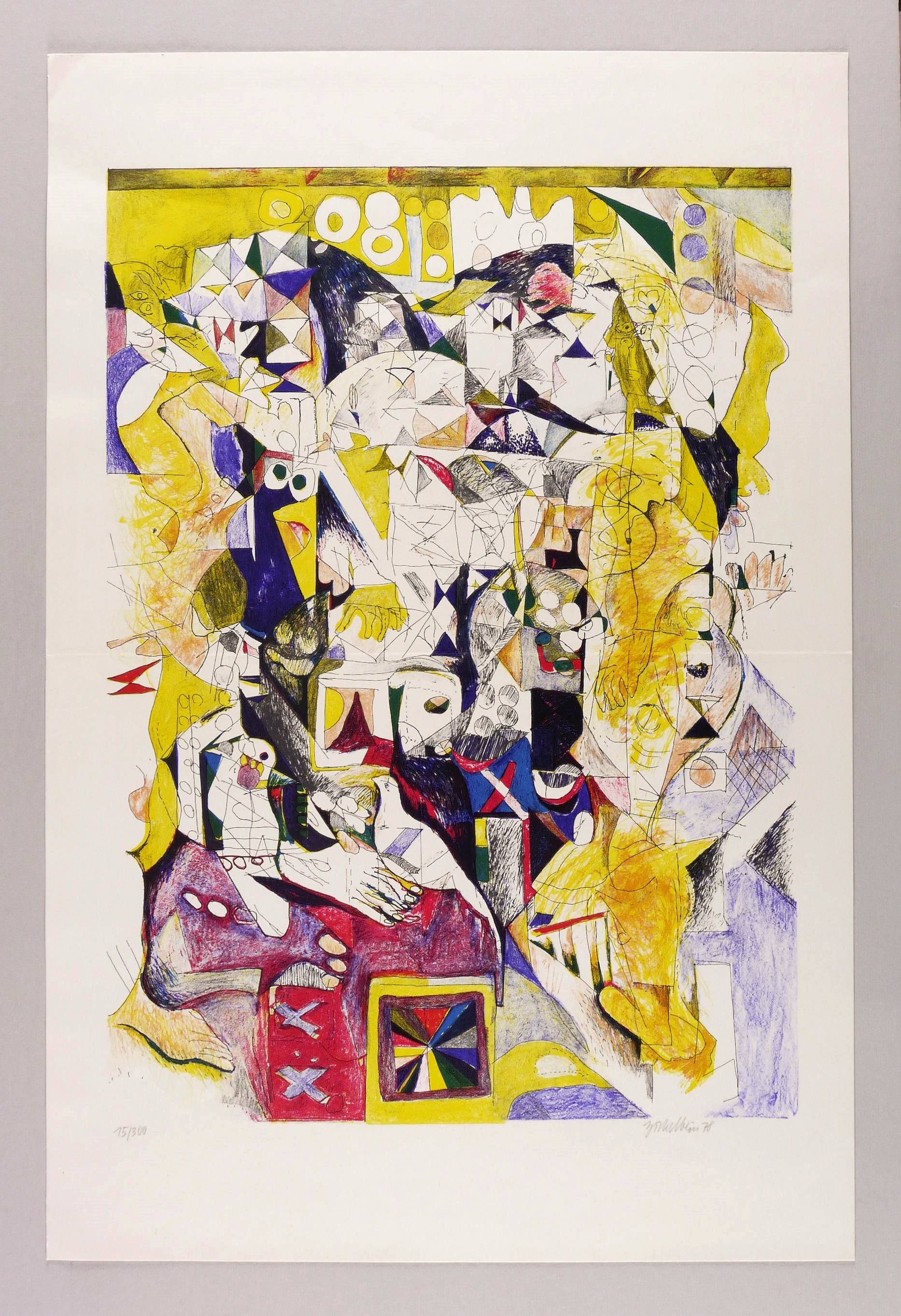 1978. Farbzinkografie / Kreide- & Pinselzinkografie, in 6 Farben, auf glattem weißem Karton. – Originale Künstlergrafik, von Horst Zickelbein. – Auflage Exemplar Nr. 15/300. – 56,7 x 40,5 cm (Darstellung / Druckbild), 72 x 48 cm (Blatt).