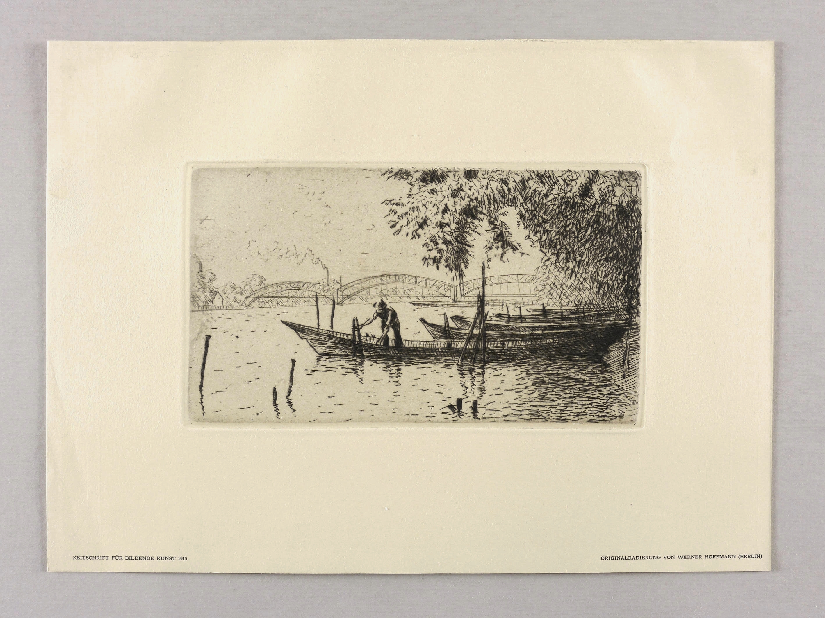 Hoffmann, Werner Ernst Albert. – „Ohne Titel (Boote vor Flussbrücke)”.