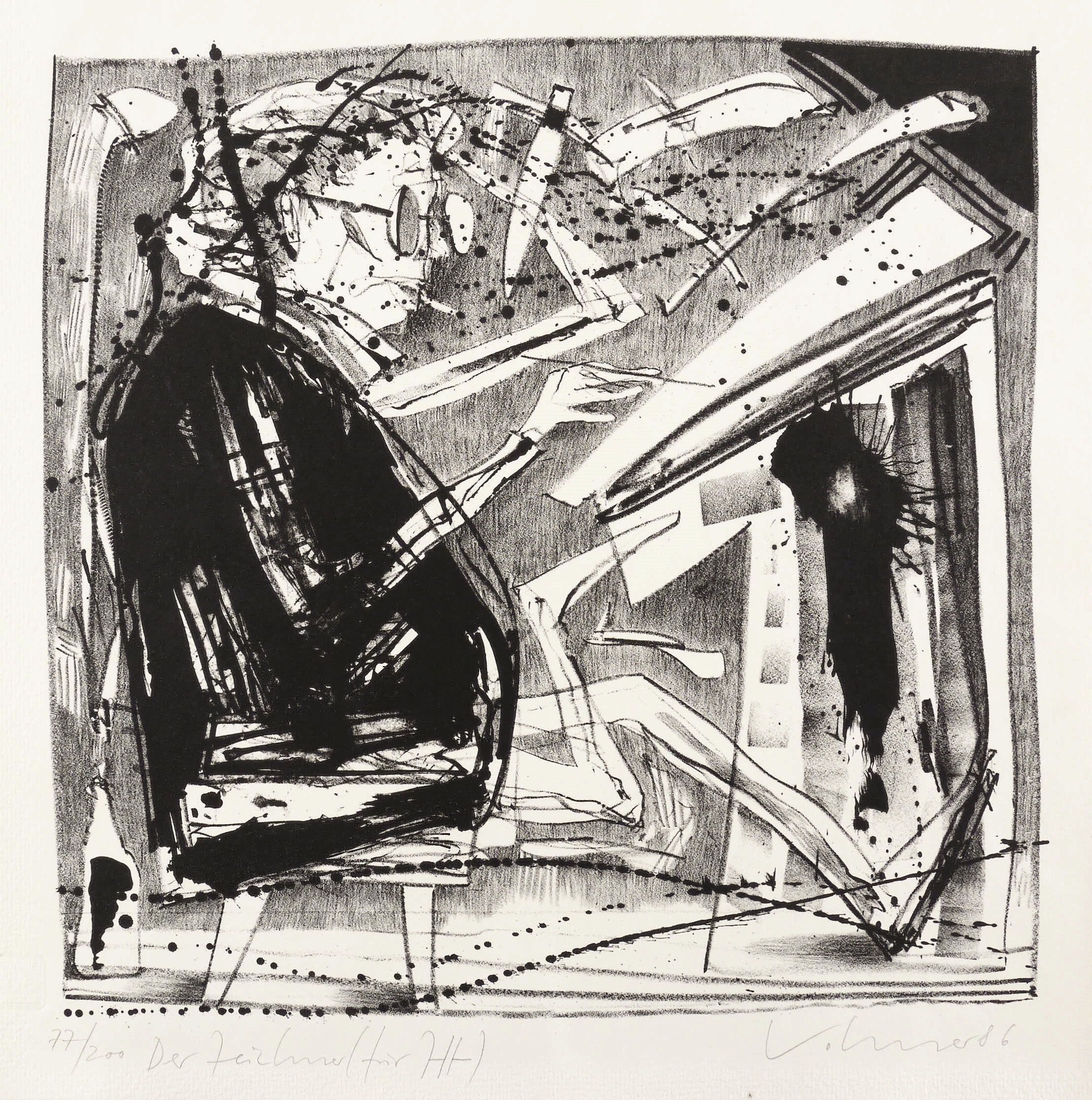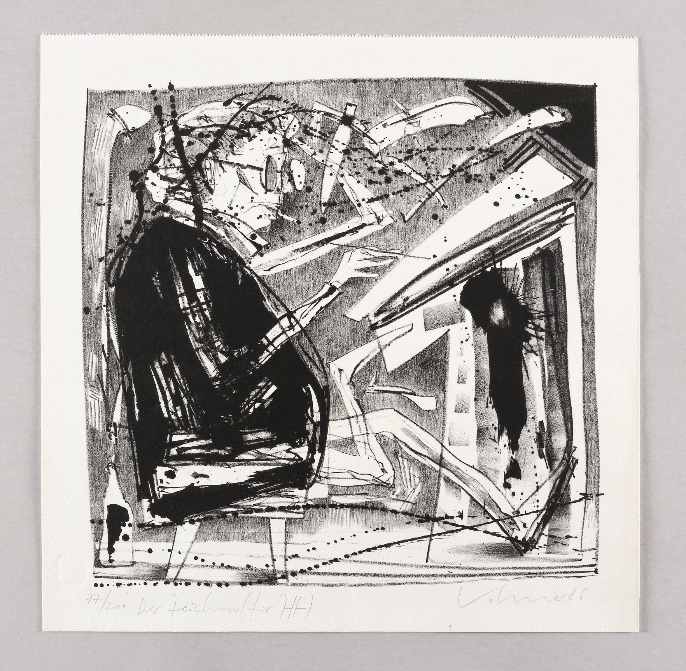 1986. Lithografie / Kreide- & Pinsellithografie, in Schwarz, auf hellgelbem Weißenborn-Bütten. – Originale Künstlergrafik, von Steffen Volmer. – Auflage Exemplar Nr. 77/200. – 30,5 x 31,0 cm (Darstellung), 36 x 36 cm (Blatt).