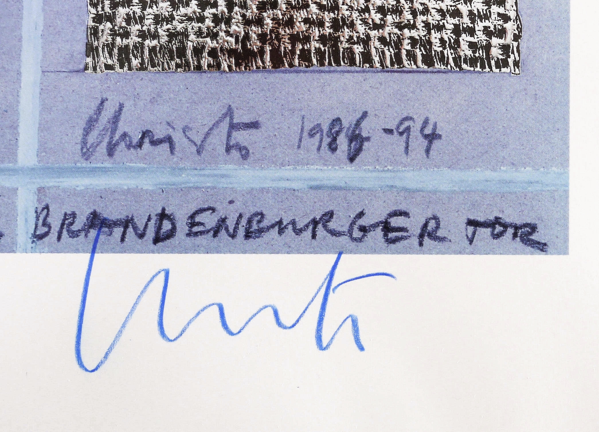 Rechts unten in Farbstift signiert: ″Christo″. In der rechten unteren Blattecke typografisch bezeichnet: ″Kunstdruck Nr. 10″. Diverse Inschriften in der Druckform. – Unter Verwendung einer Fotografie von Michael Cullen. Edition der Schumacher Edition Fils, Düsseldorf. – Tadelloses Exemplar. Sehr guter Zustand.