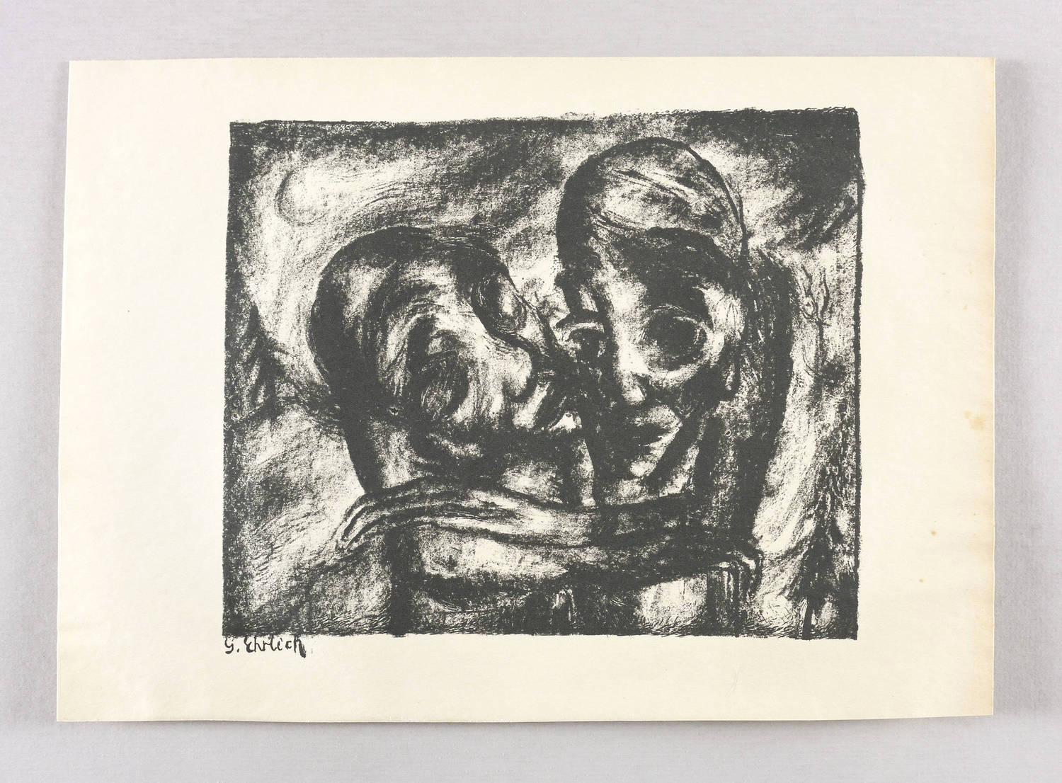 Singer 12003-2. – Aus: Genius. Zeitschrift für werdende und alte Kunst (München: Kurt Wolff 1920), Bd. 2. – Nicht handsigniert. Verso typografisch bezeichnet mit Künstler, Titel und Technik: ″Georg Ehrlich / Tröstung. Original-Lithographie 1920.″ – Leichte Altersspuren. Guter Zustand.