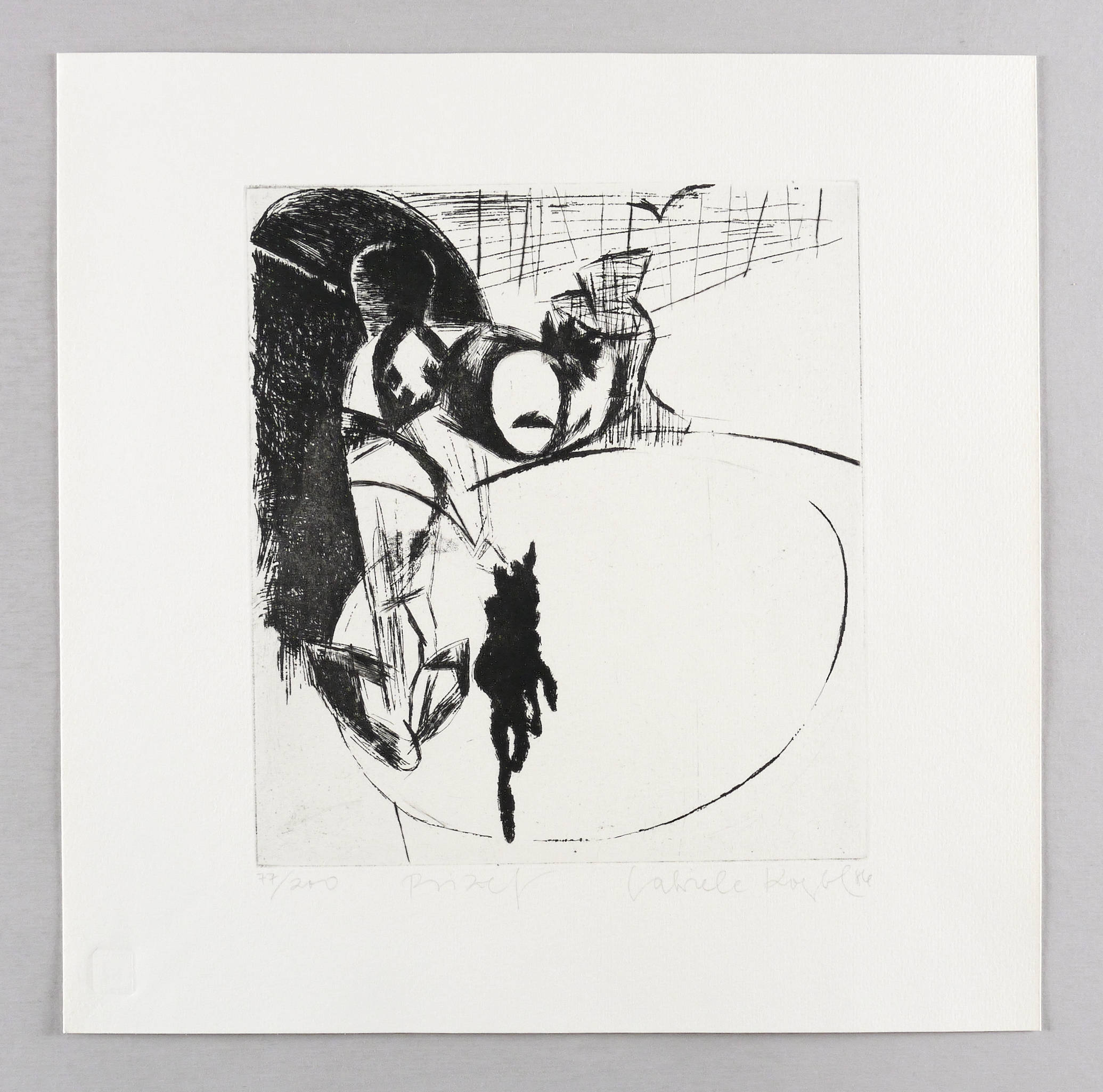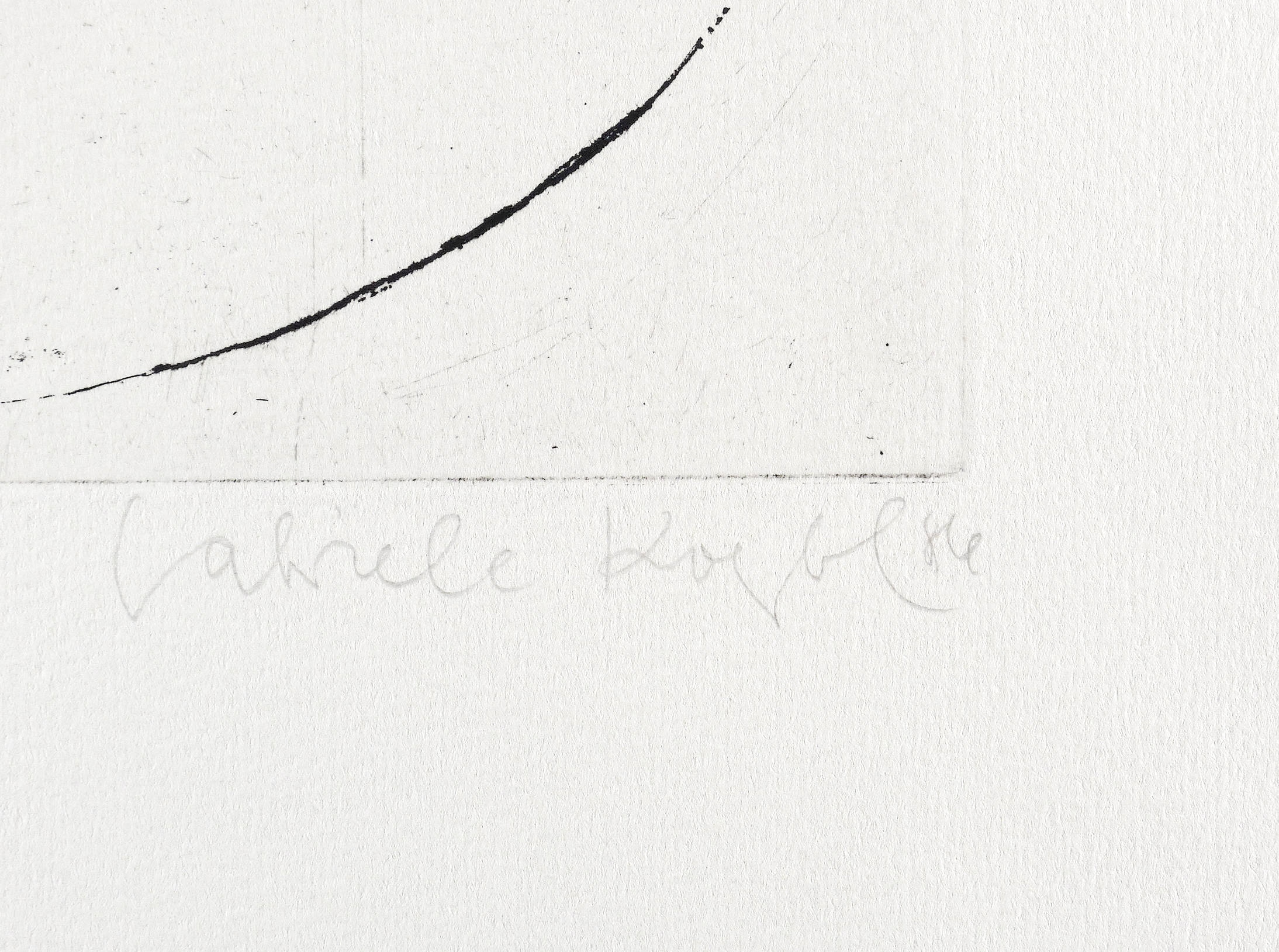 1986. Radierung / Aquatinta & Reservage, in Schwarz, auf hartem hellgelbem Maschinenbütten. – Originale Künstlergrafik, von Gabriele Koerbl. – Auflage Exemplar Nr. 77/200. – 24,8 x 22,4 cm (Darstellung / Platte), 36 x 36 cm (Blatt).