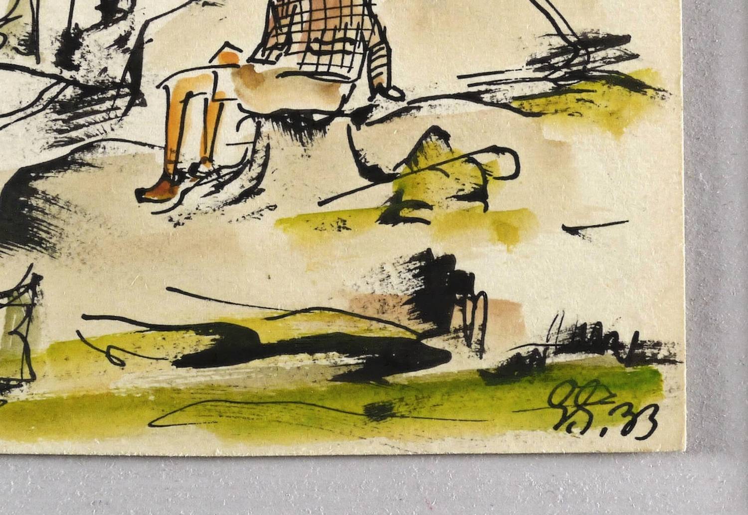 1933. Zeichnung / Federzeichnung, in schwarzer Tusche, aquarelliert, auf hellgelbem Karton. – Originale Künstlergrafik, von Georg Gelbke. – Unikat. – 10,2 x 14,8 cm (Darstellung / Blatt).