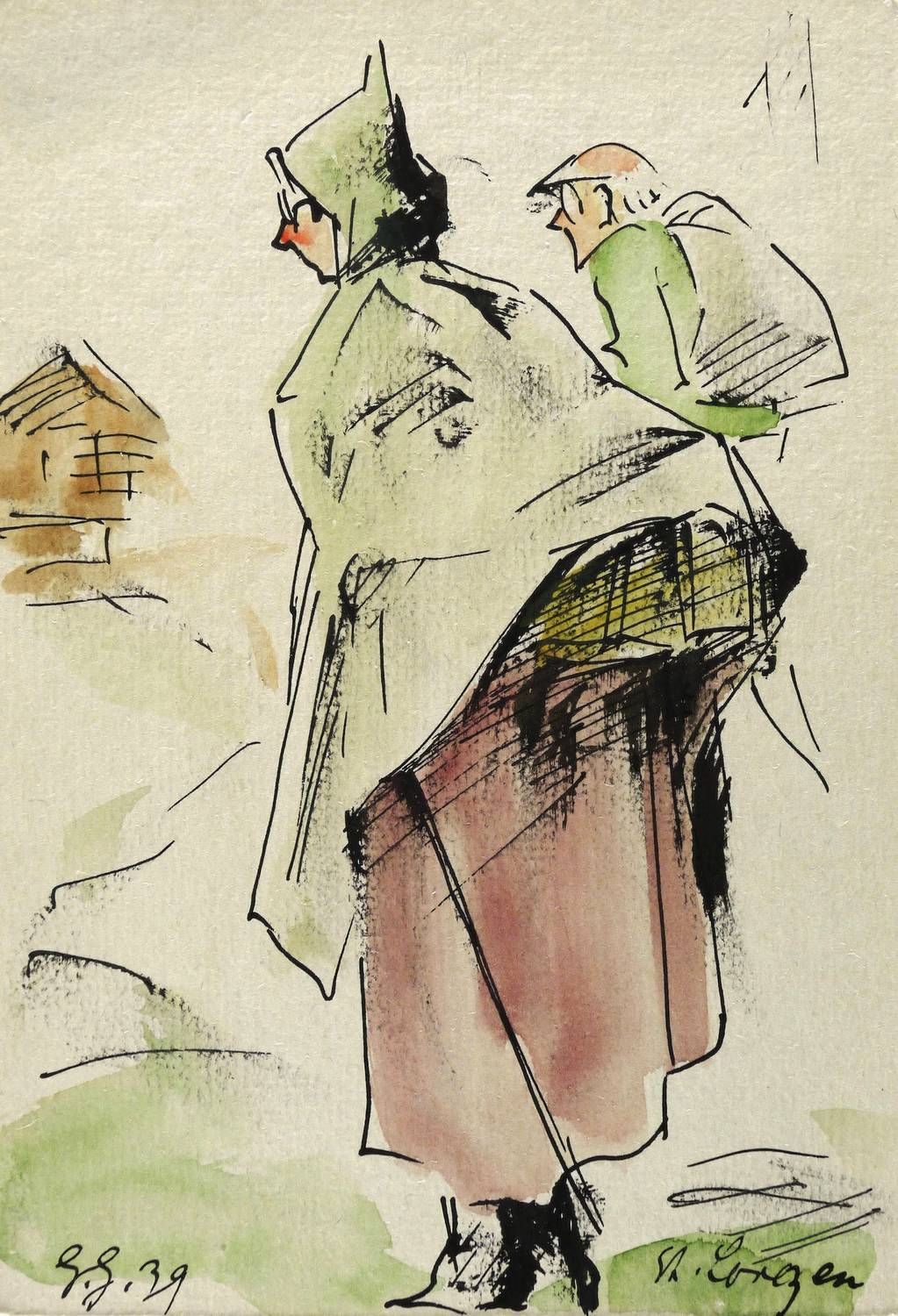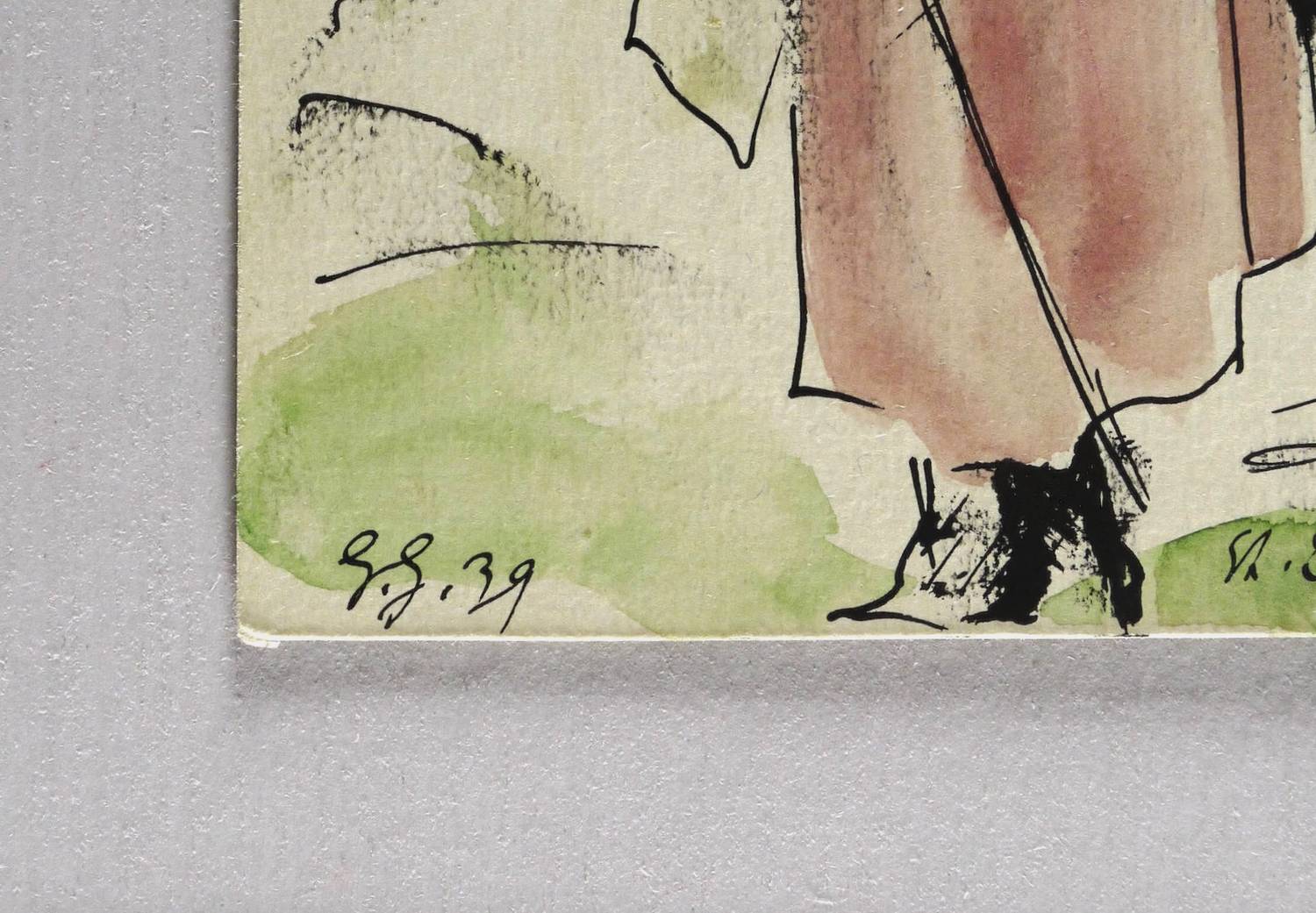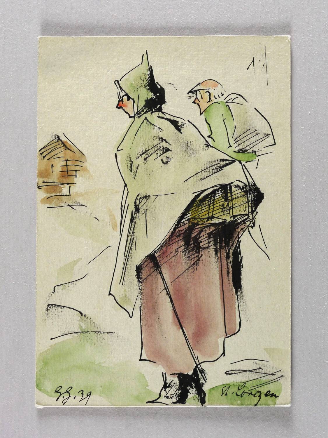 1939. Zeichnung / Federzeichnung, aquarelliert, auf rauem hellgrauem Aquarellkarton. – Originale Künstlergrafik, von Georg Gelbke. – Unikat. – 15,1 x 10,3 cm (Darstellung / Blatt).