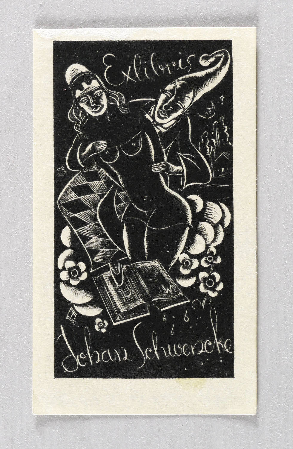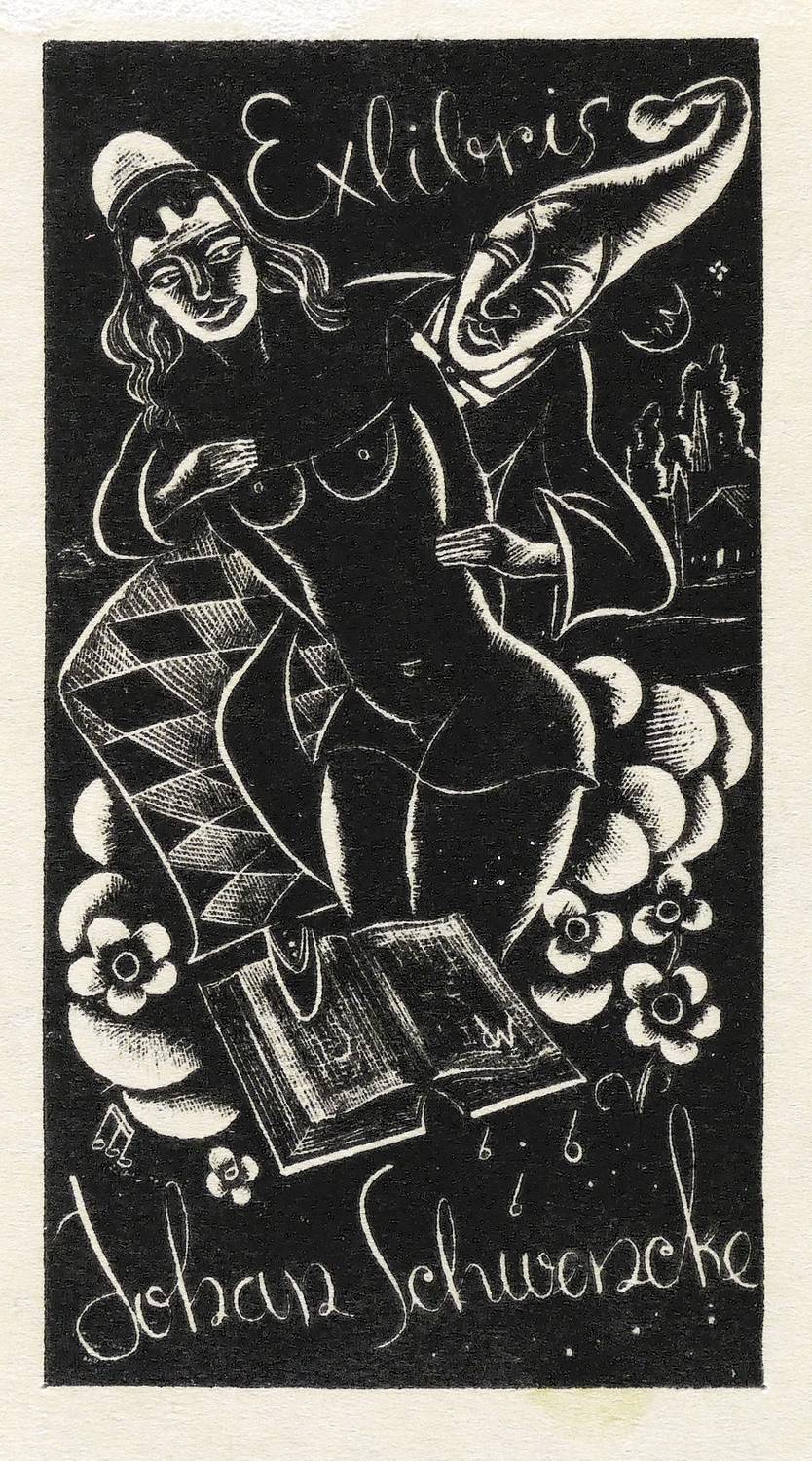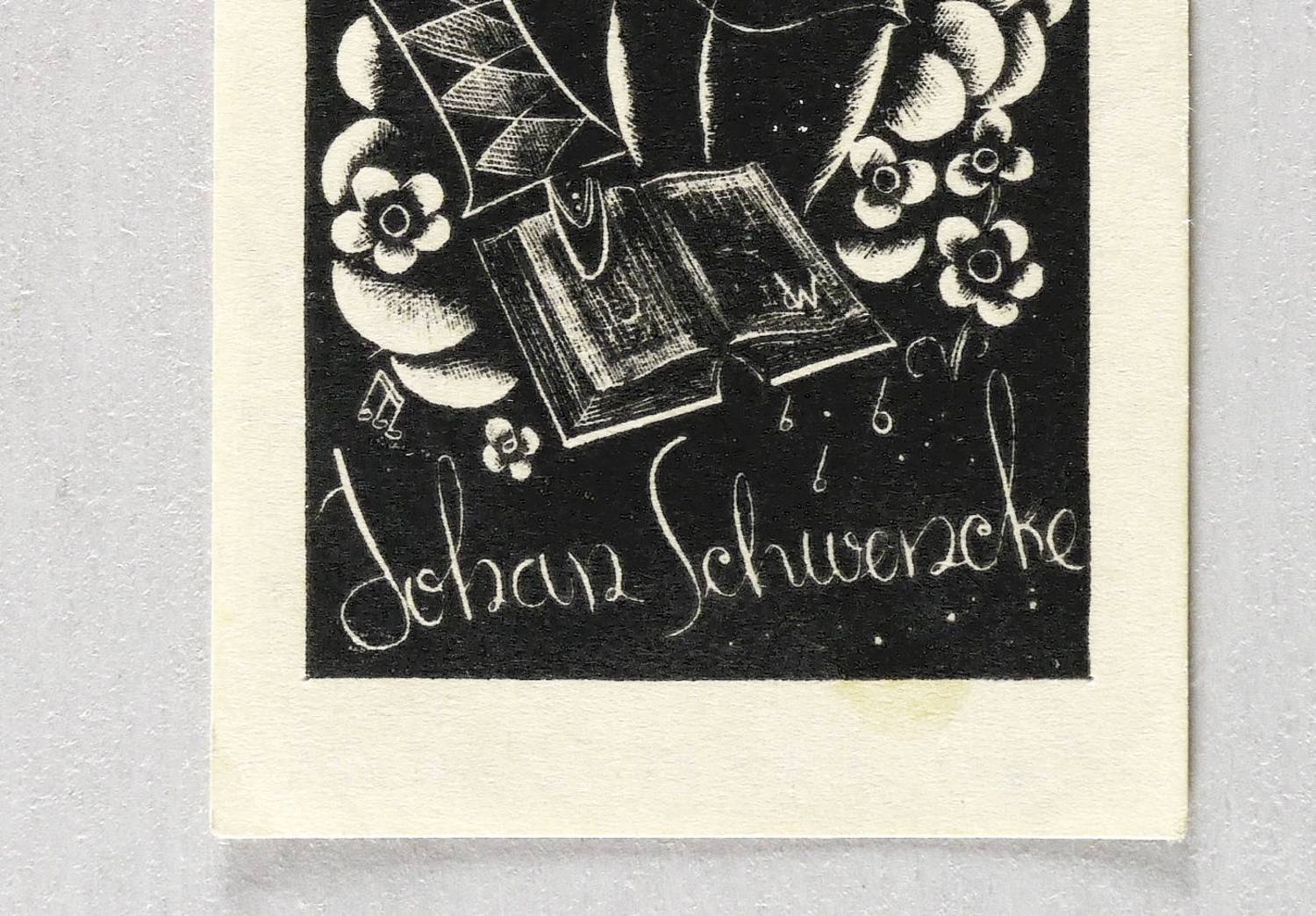 Im Druckstock ligiertes Monogramm: ″dW″. Inschrift: ″Exlibris Johan Schwencke″. – Sehr guter Zustand.