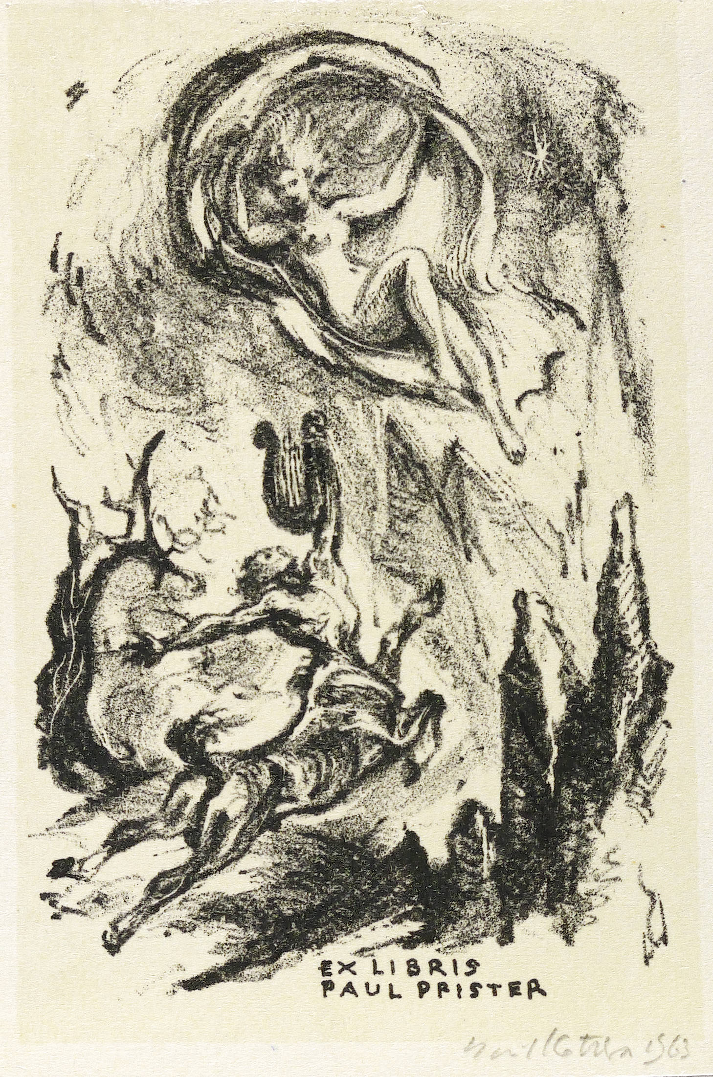 1963. Lithografie / Kreidelithografie, in Schwarz, auf leichtem hellgelbem Velin. – Exlibris, von Emil Kotrba. – 9,6 x 6,4 cm (Darstellung / Druckbild), 10,7 x 7,6 cm (Blatt).