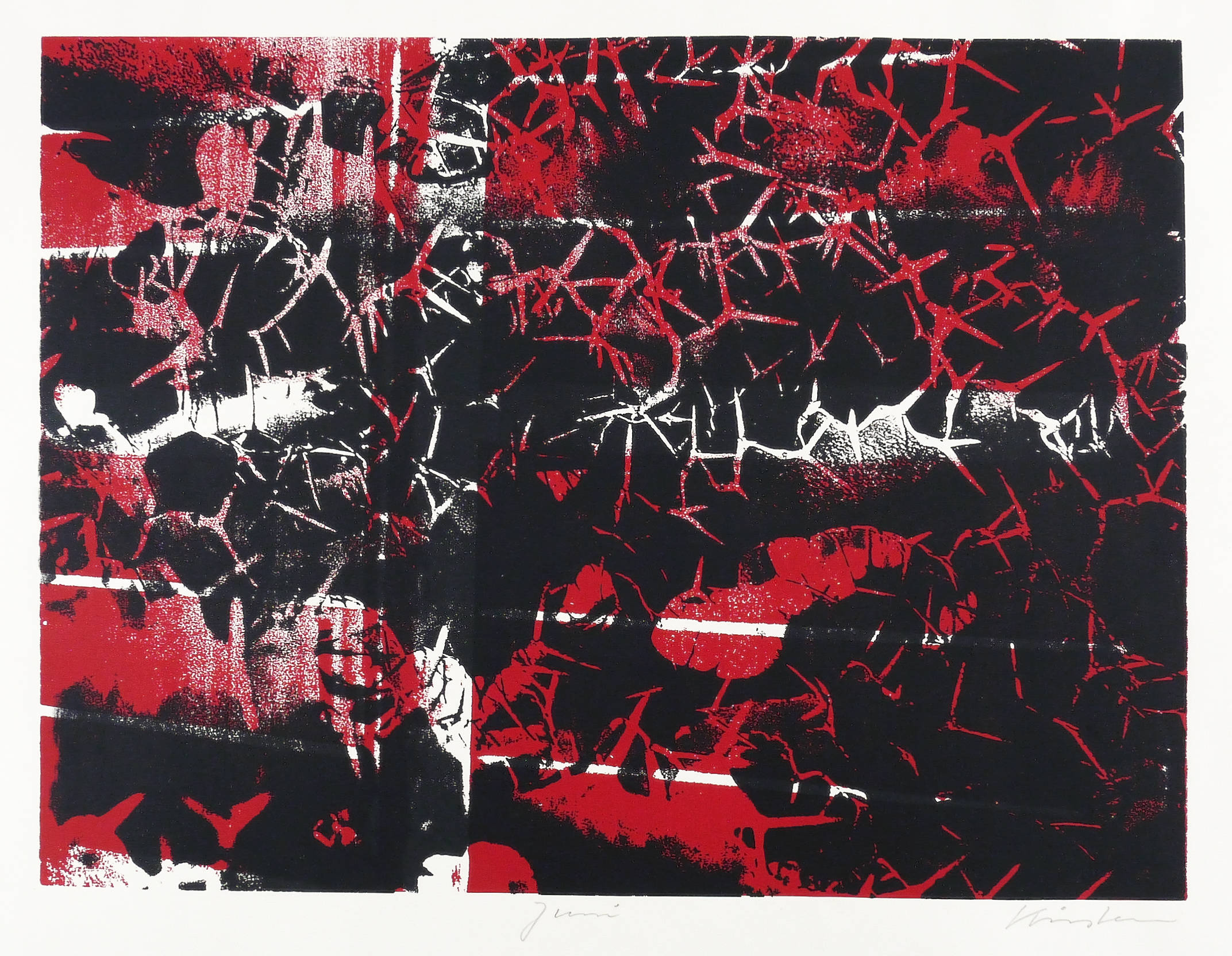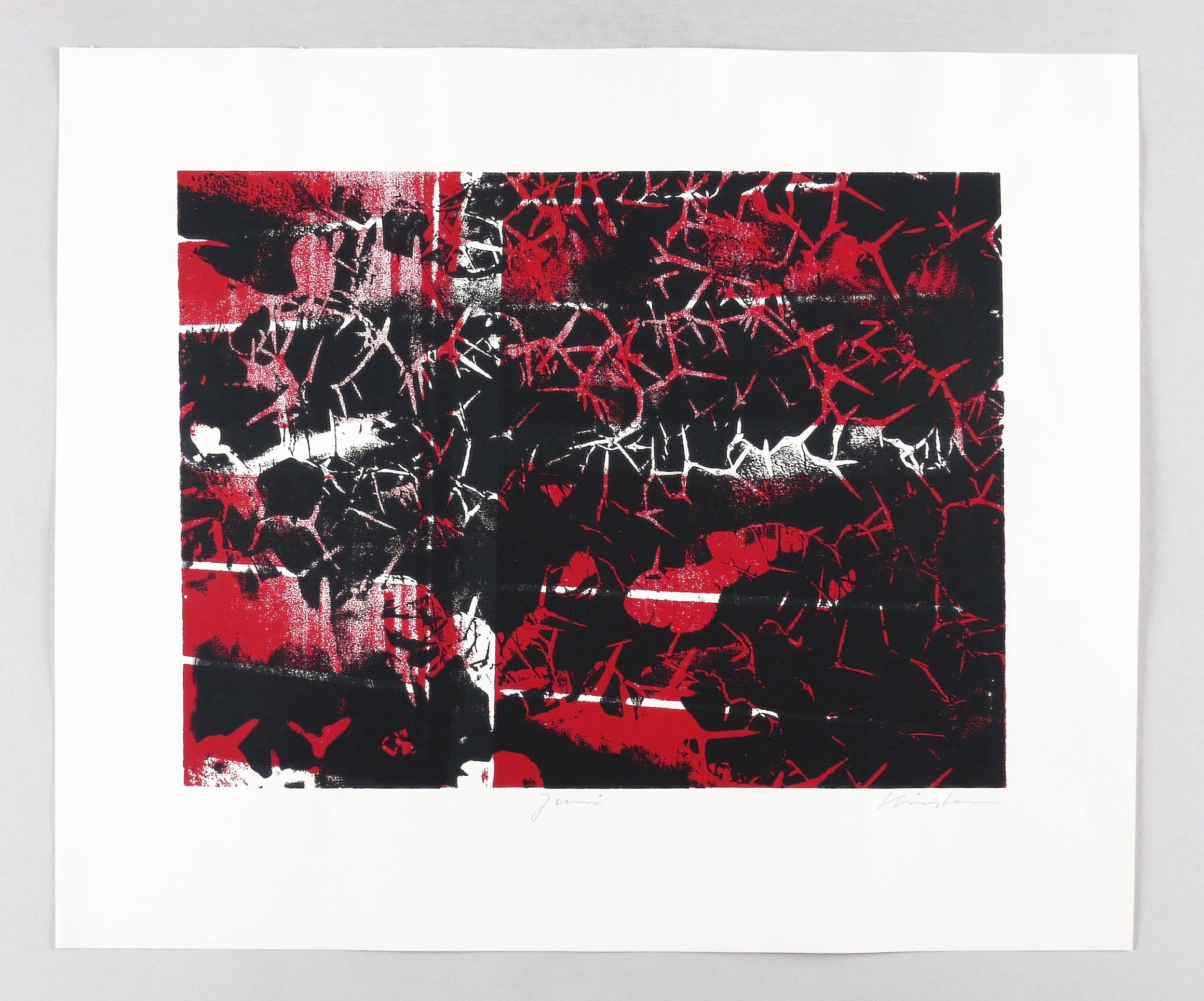 1994. Farbsiebdruck / Farbserigrafie, in Rot & Schwarz, auf hellgelbem Werkdruckpapier. – Originale Künstlergrafik, von Jean Kirsten. – Auflage Exemplar Nr. 8/120. – 28,5 x 38,0 cm (Darstellung / Druckbild), 42 x 50 cm (Blatt).