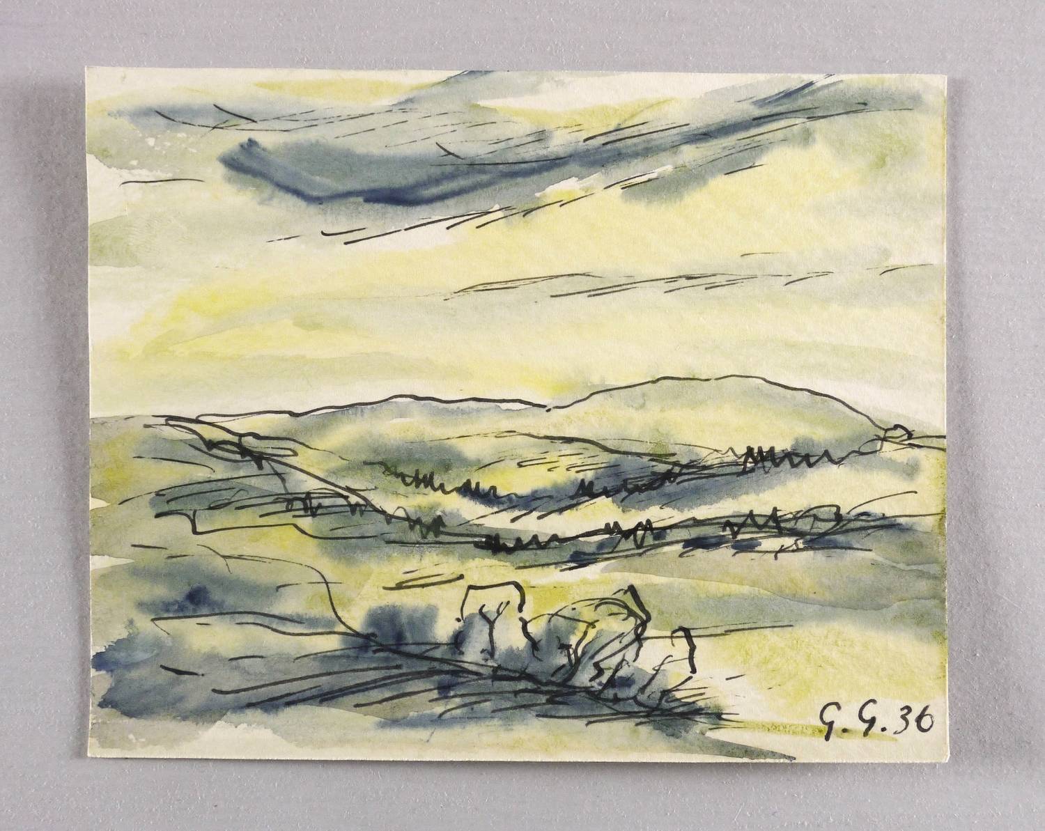 1936. Aquarell, über Feder & schwarzer Tusche, auf Karton. – Originale Künstlergrafik, von Georg Gelbke. – Unikat. – 11,1 x 13,7 cm (Darstellung / Blatt).