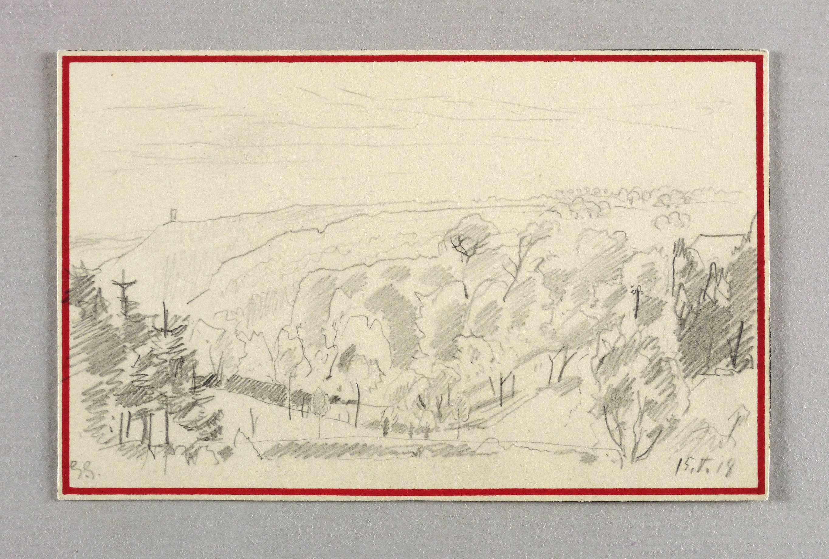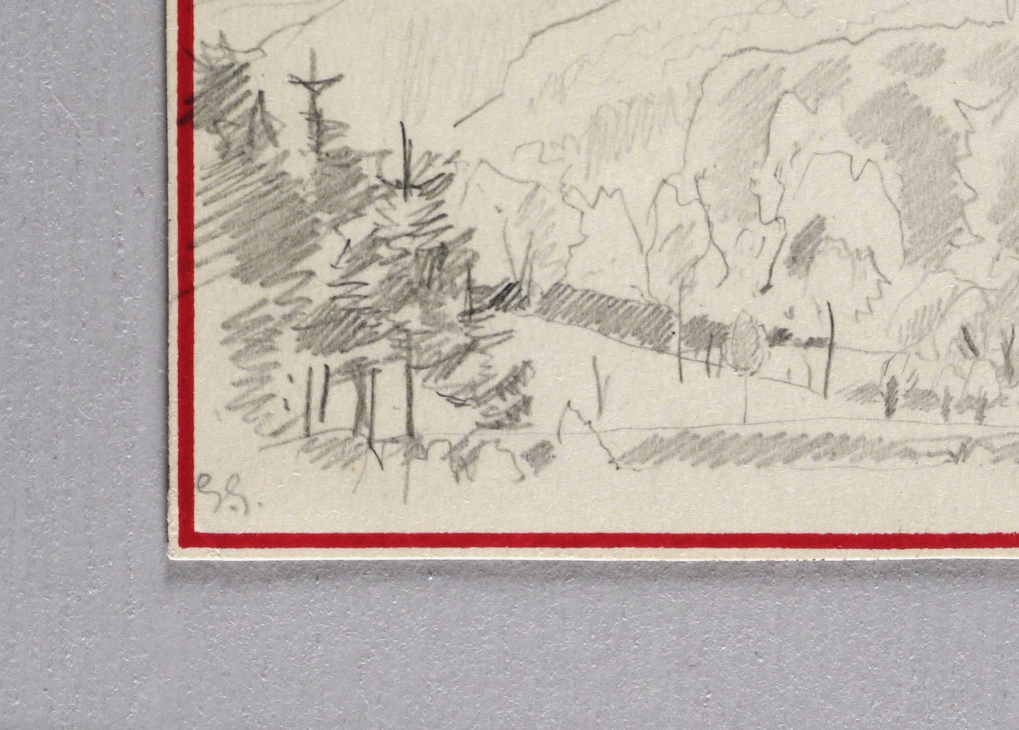 1918. Zeichnung / Bleistiftzeichnung, auf glattem hellgelbem Postkarten-Karton. – Originale Künstlergrafik, von Georg Gelbke. – Unikat. – 8,3 x 13,2 cm (Darstellung), 8,7 x 13,7 cm (Blatt).