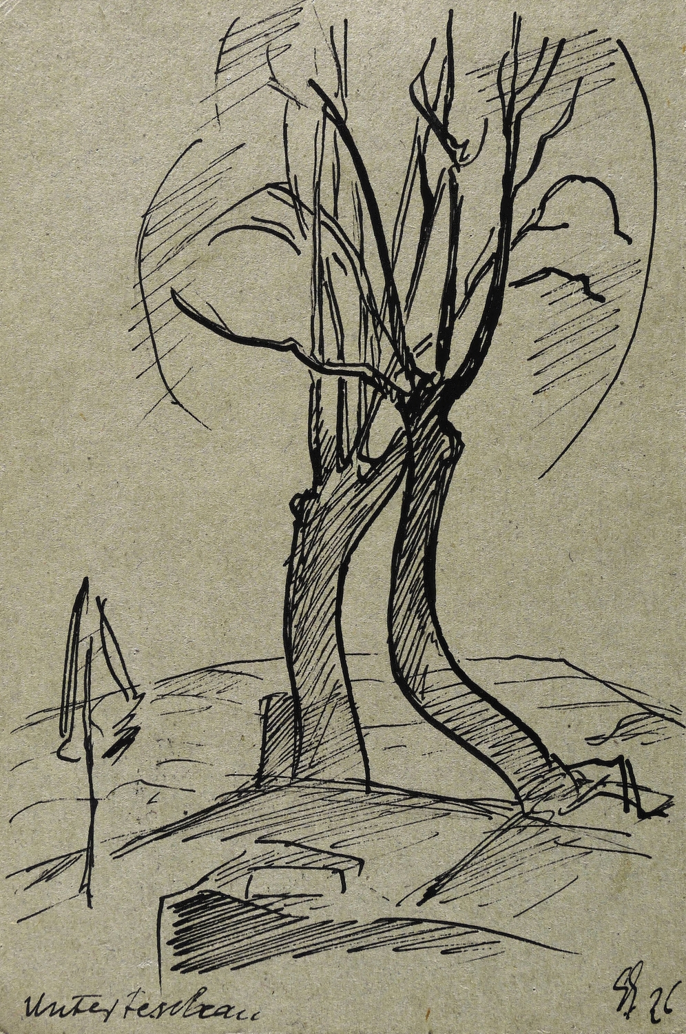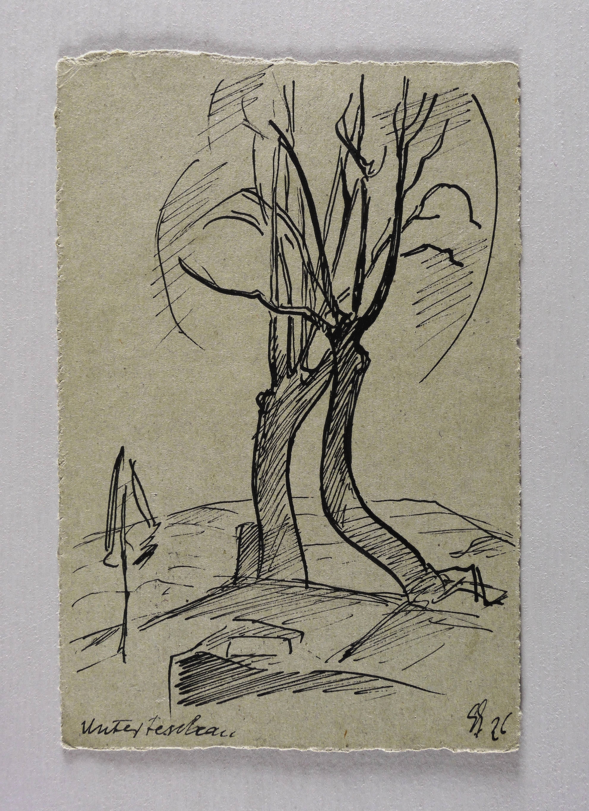 1926. Zeichnung / Federzeichnung, in schwarzer Tusche, auf grauem Postkarten-Karton. – Originale Künstlergrafik, von Georg Gelbke. – Unikat. – 15,8 x 10,4 cm (Darstellung / Blatt).