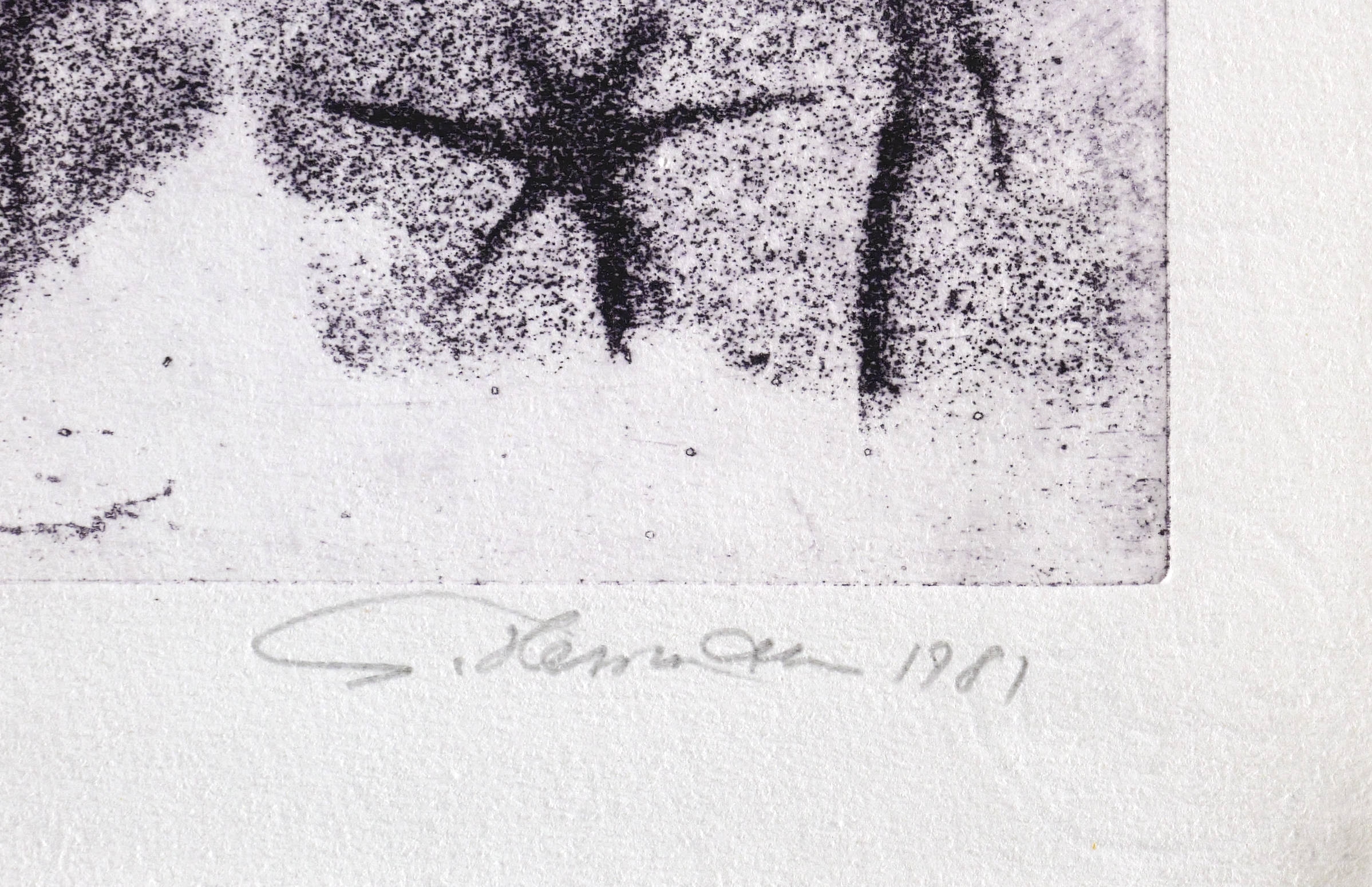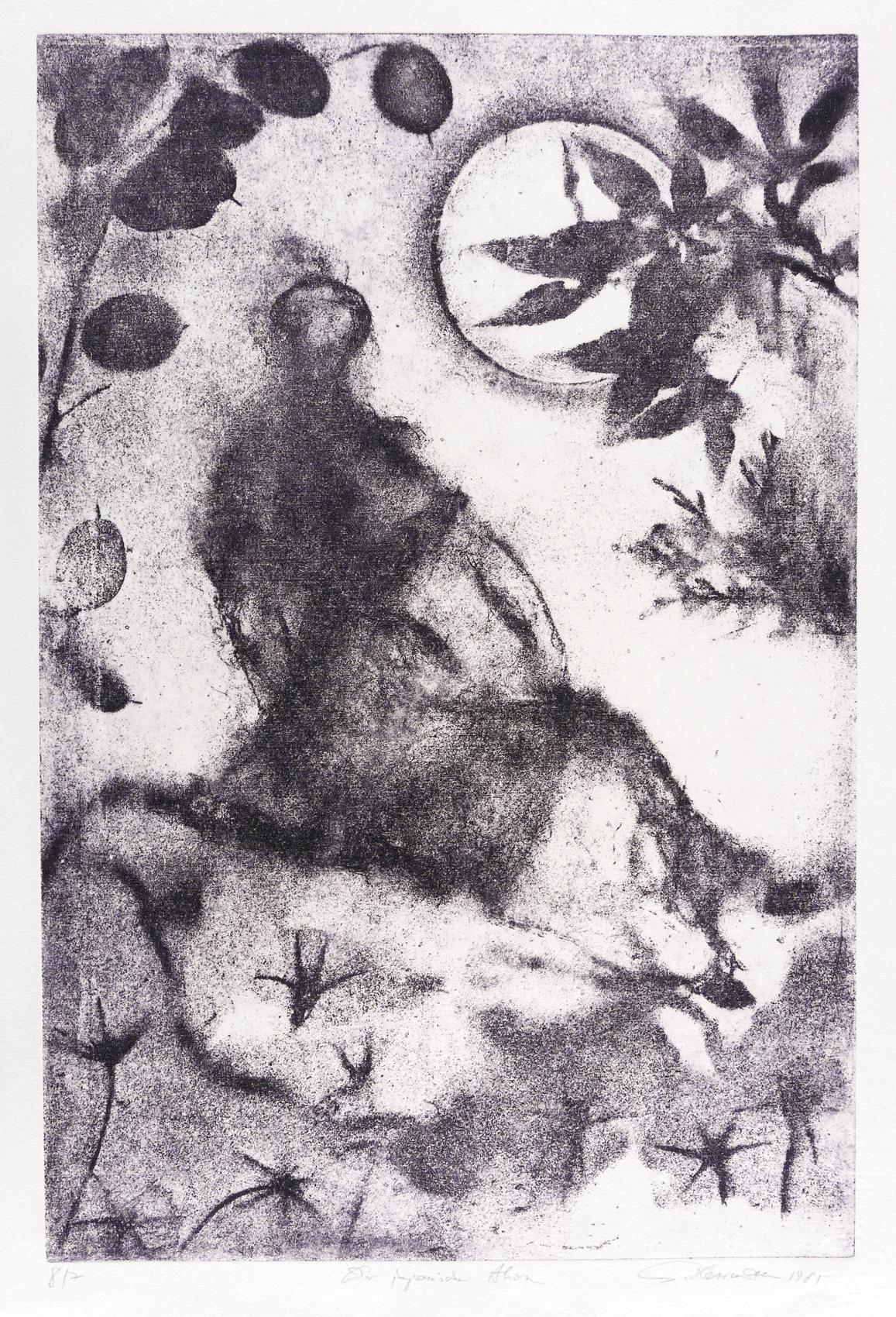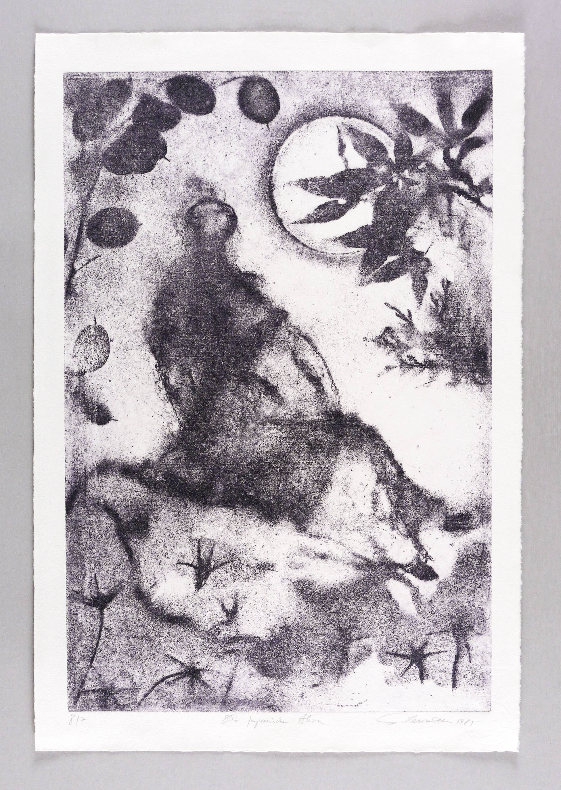 1981. Radierung / Vernis mou, in Schwarzviolett, auf hellchamois Hahnemühle. – Originale Künstlergrafik, von Gunter Herrmann. – Auflage Exemplar Nr. 7/8. – 49,2 x 32,7 cm (Darstellung / Platte), 56 x 38 cm (Blatt).