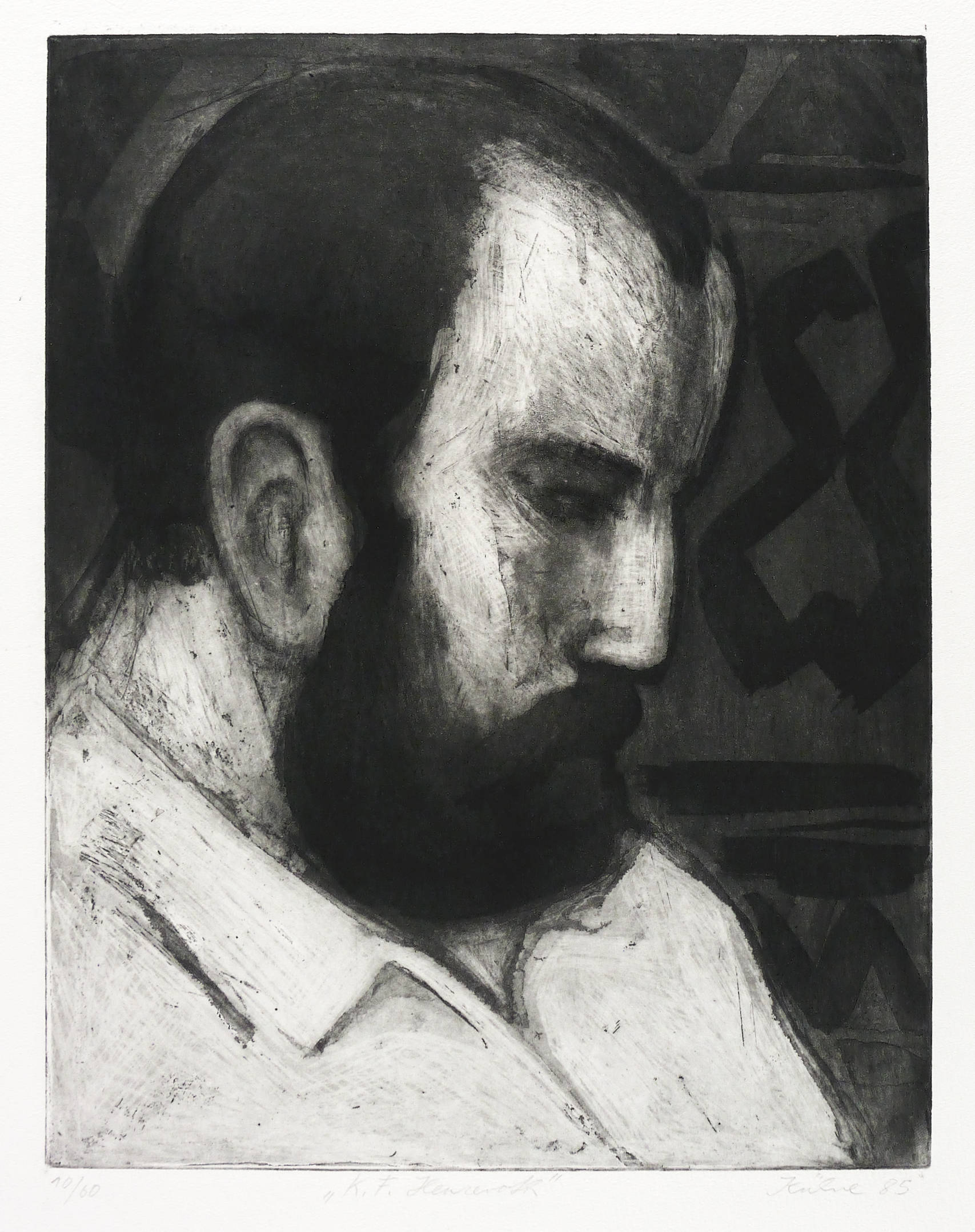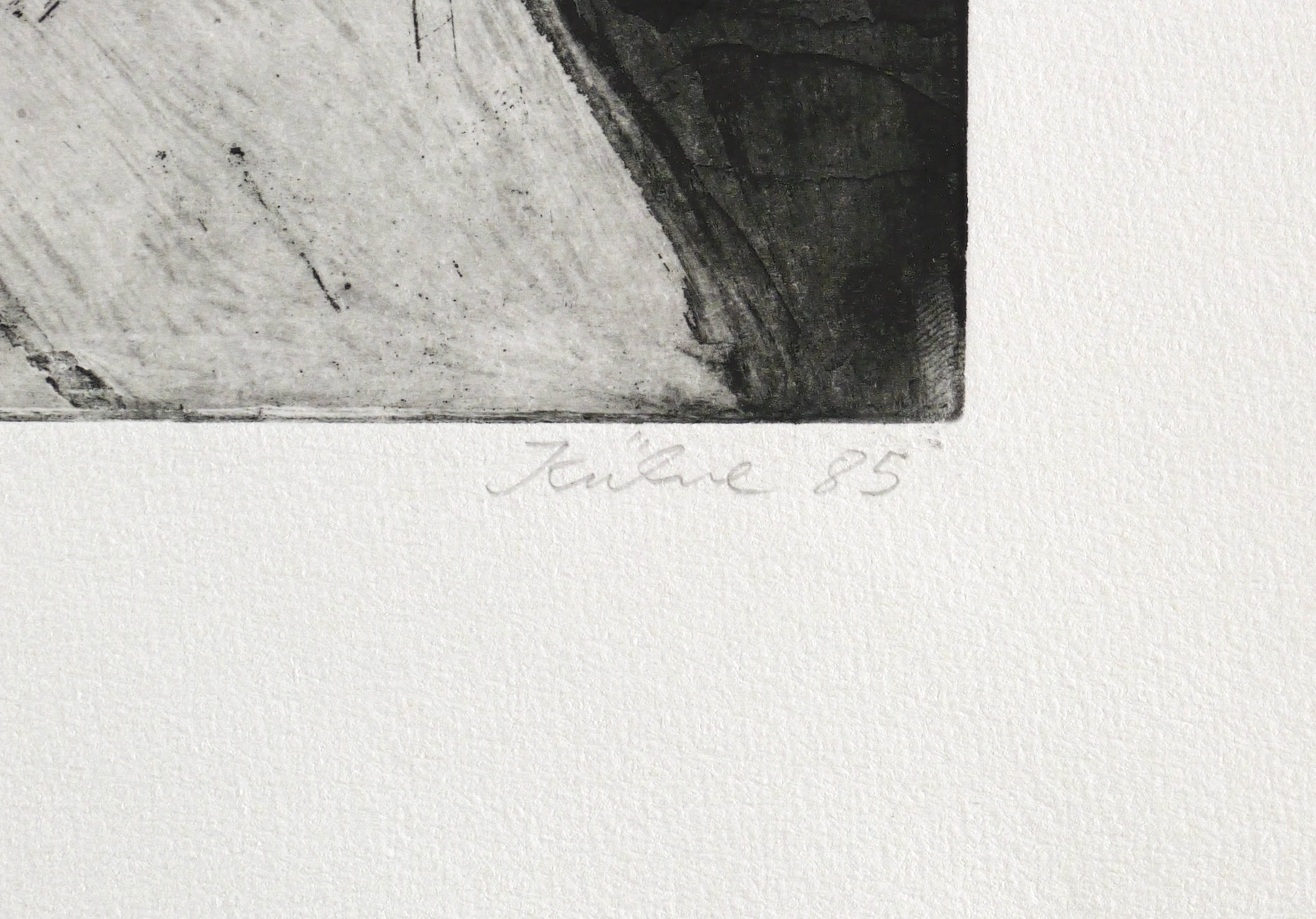 1985. Radierung / Aquatinta, partiell geschabt, in Schwarz, auf hellchamois Velinkarton. – Originale Künstlergrafik, von Wolfgang Kühne. – Auflage Exemplar Nr. 10/60. – 31,8 x 24,8 cm (Darstellung / Druckbild), 49 x 39 cm (Blatt).