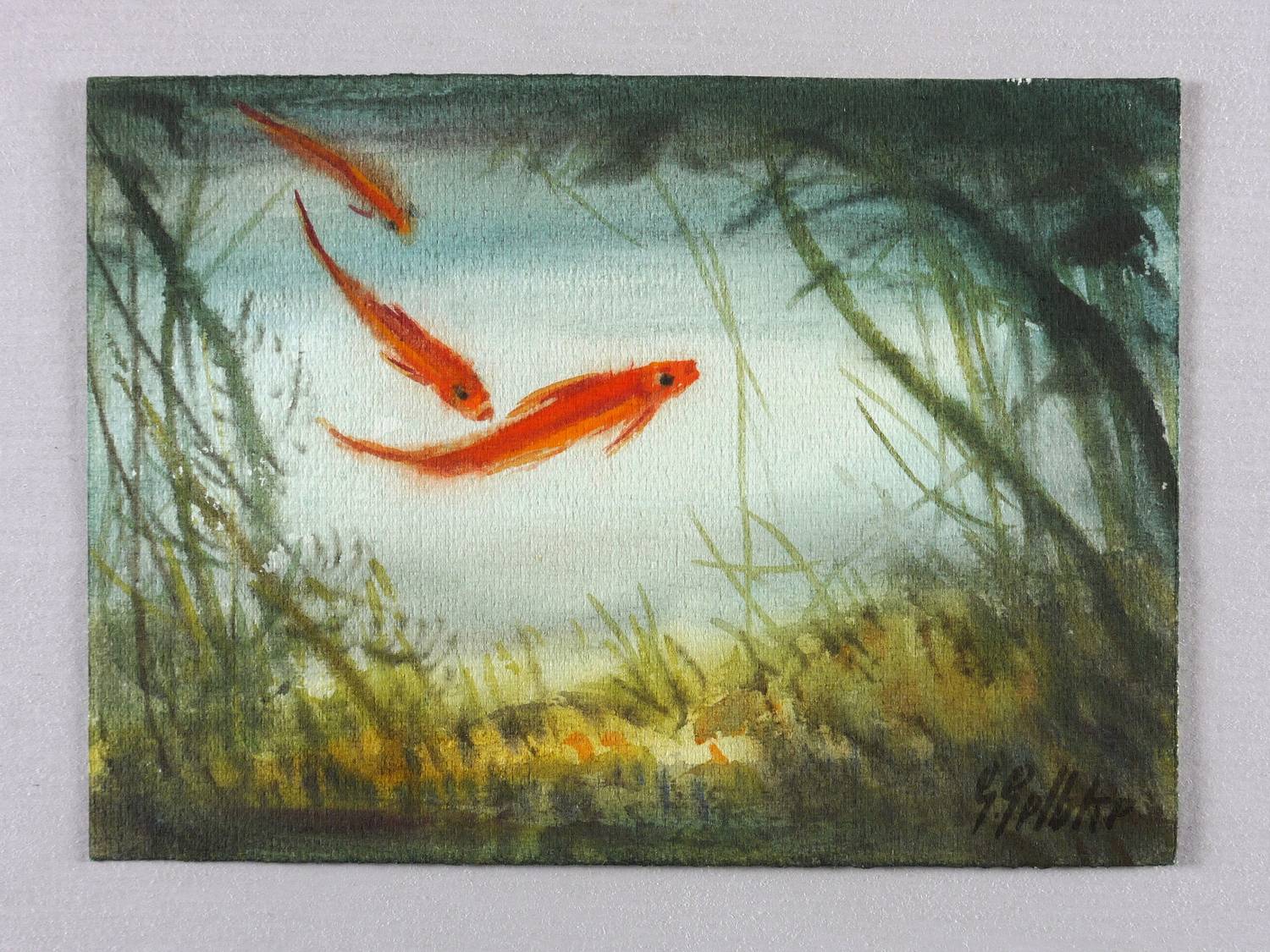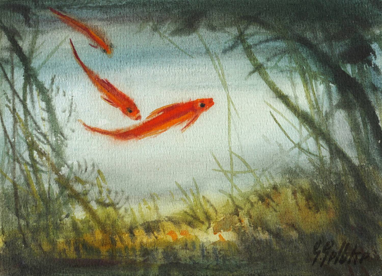 Gelbke, Georg. – „Drei rote Zierfische im Aquarium”.