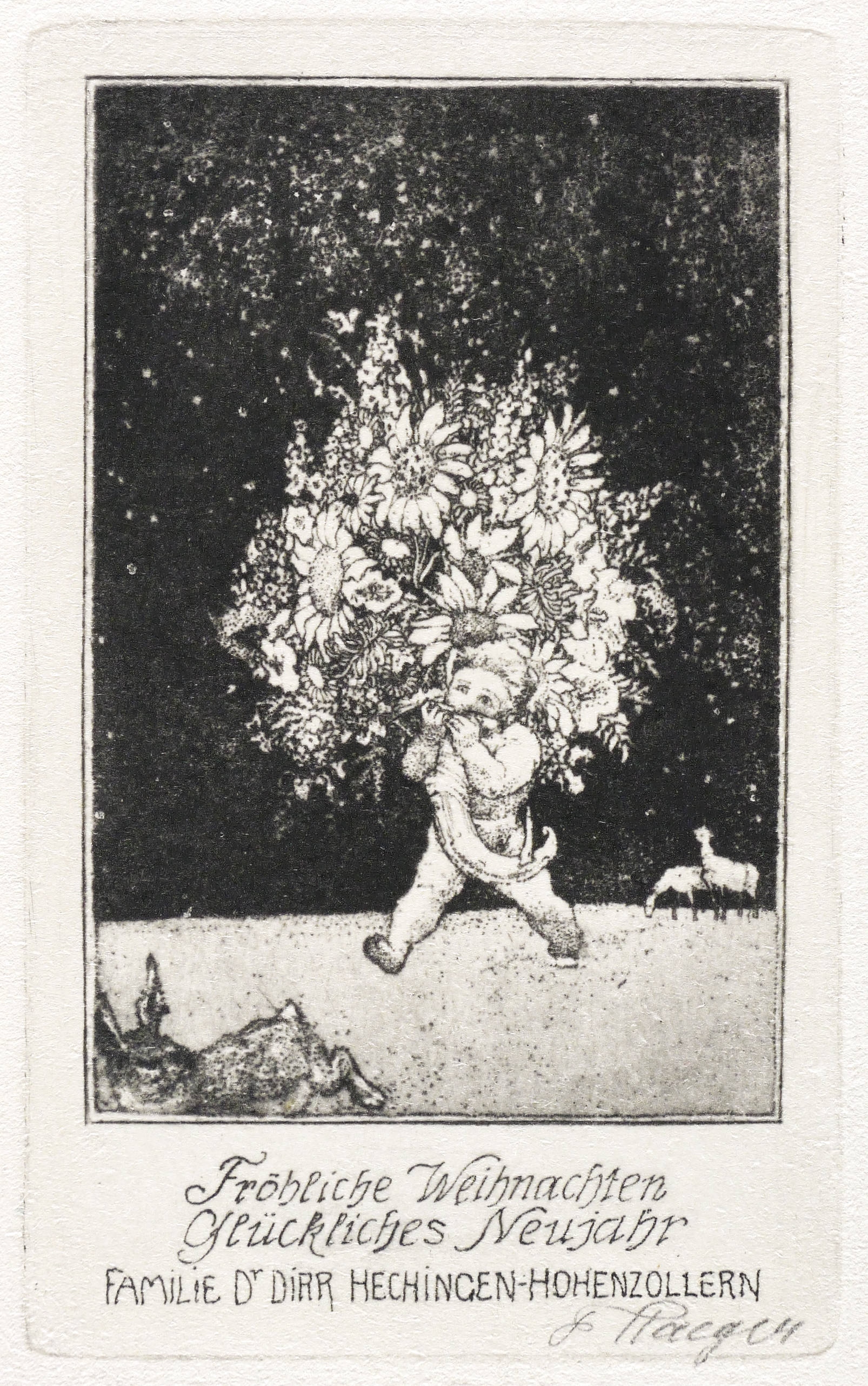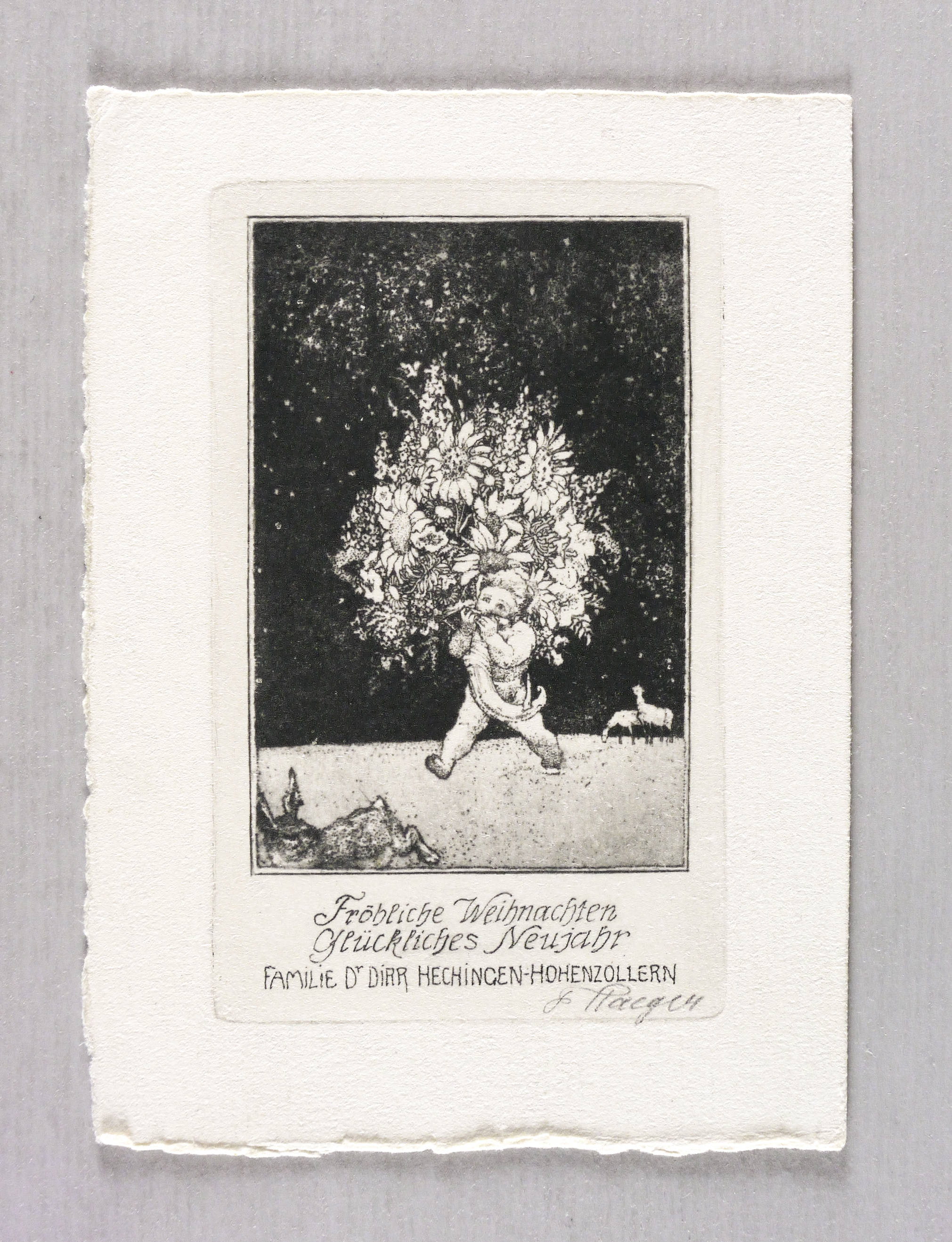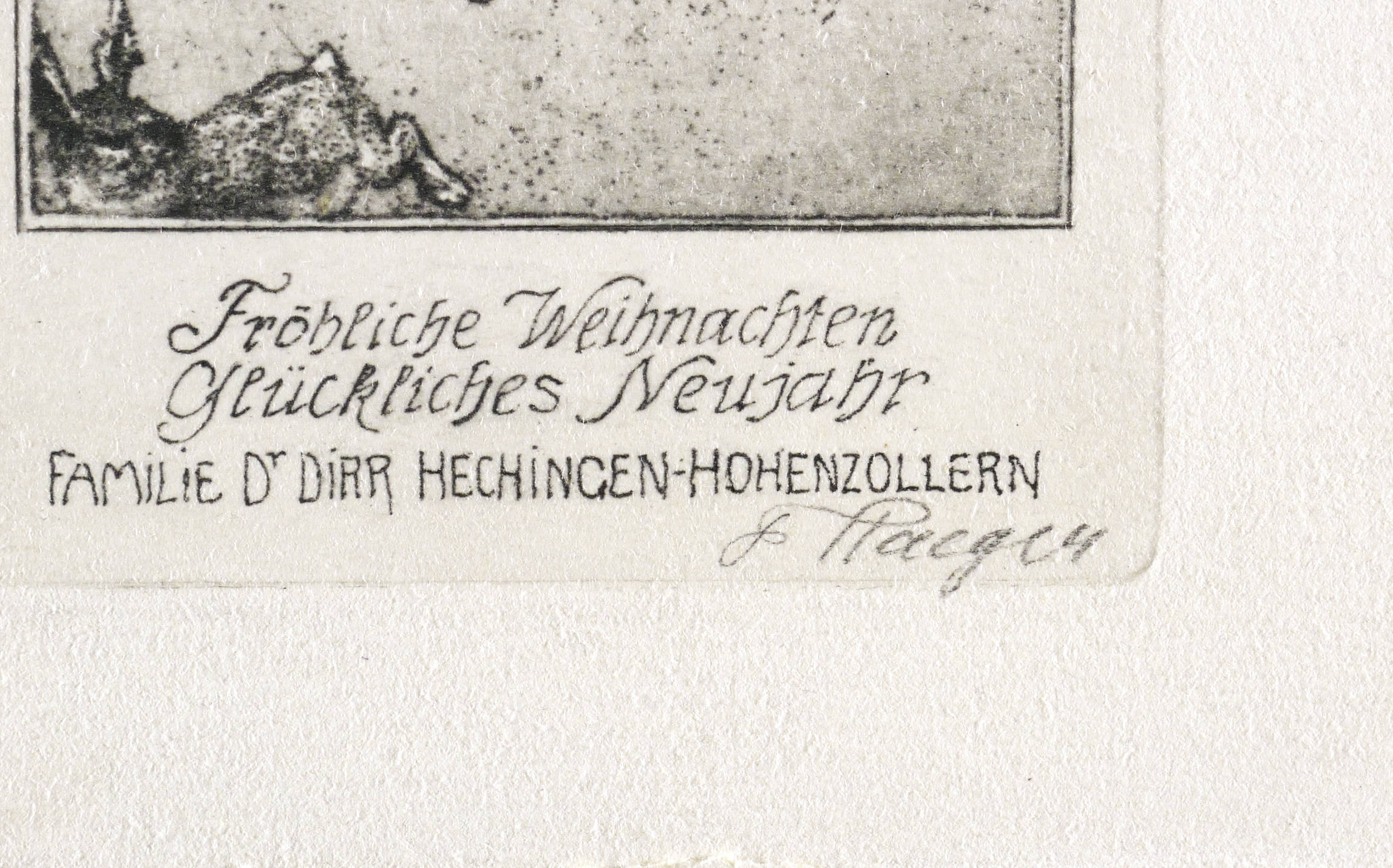 Rechts unten in Bleistift signiert: ″F. Staeger″. In der Platte unten Inschirtf: ″Fröhliche Weihnachten / Glückliches Neujahr / FAMILIE Dr DIRR HECHINGEN-HOHENZOLLERN″. – Sehr guter Zustand.