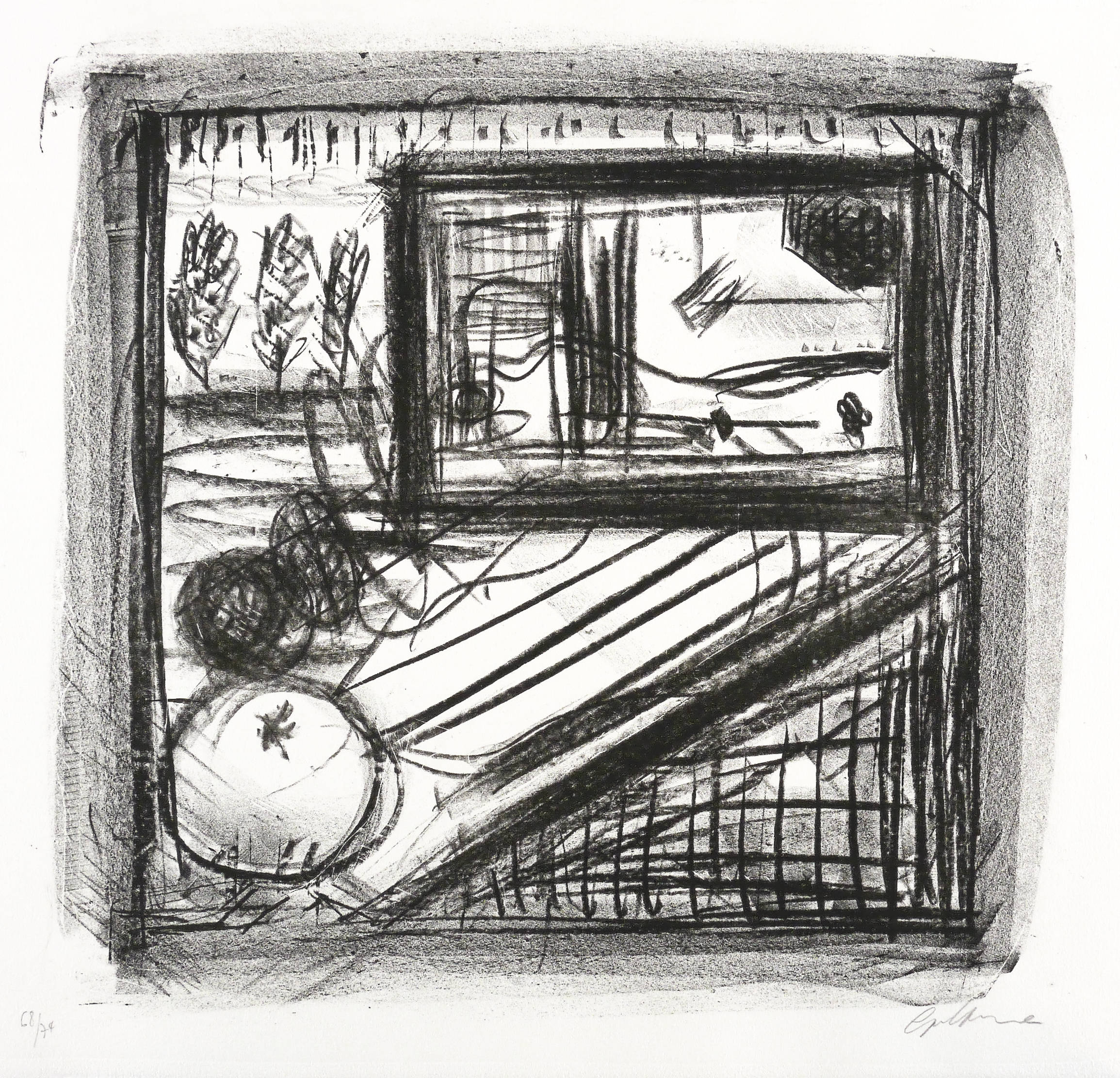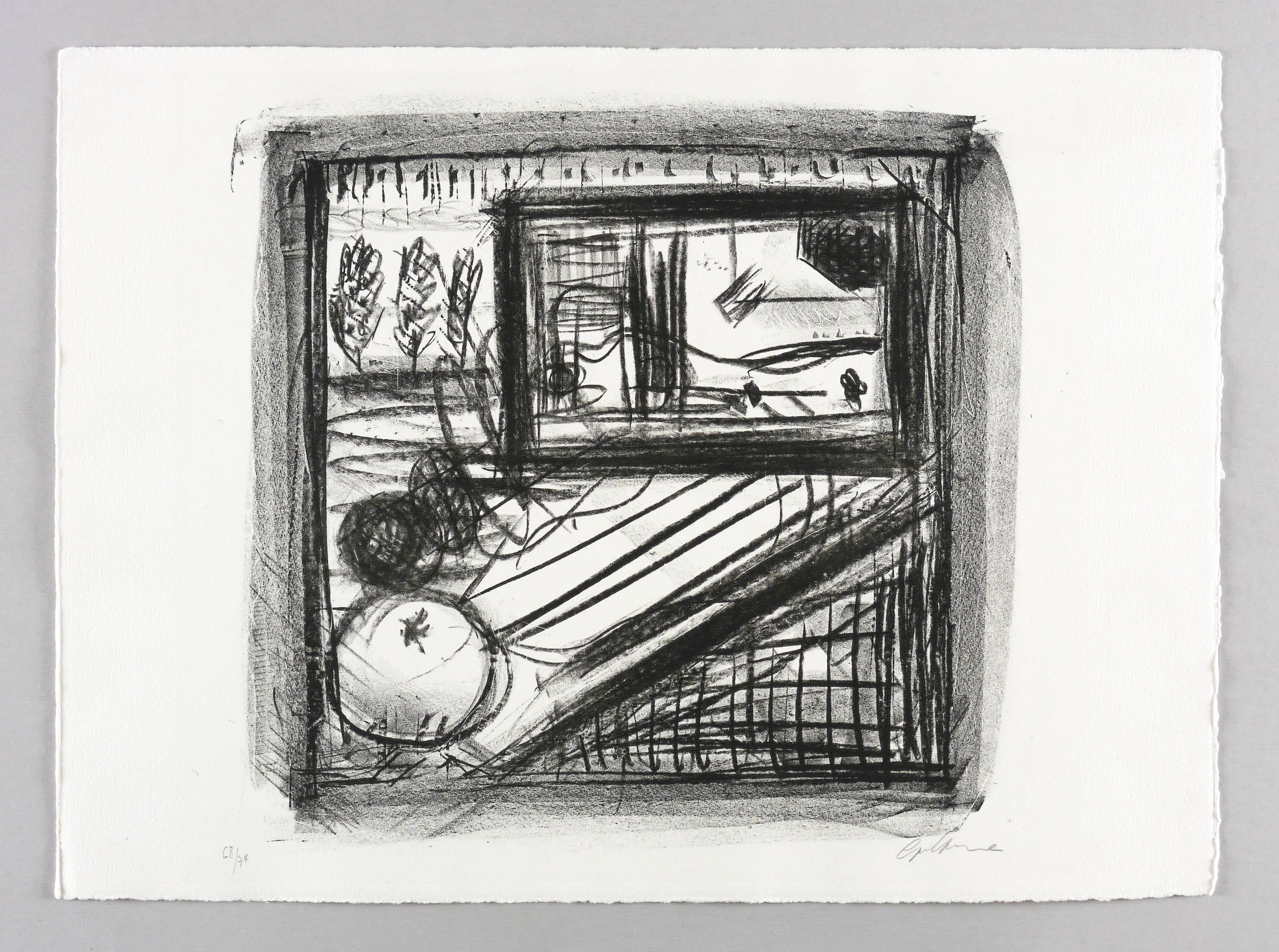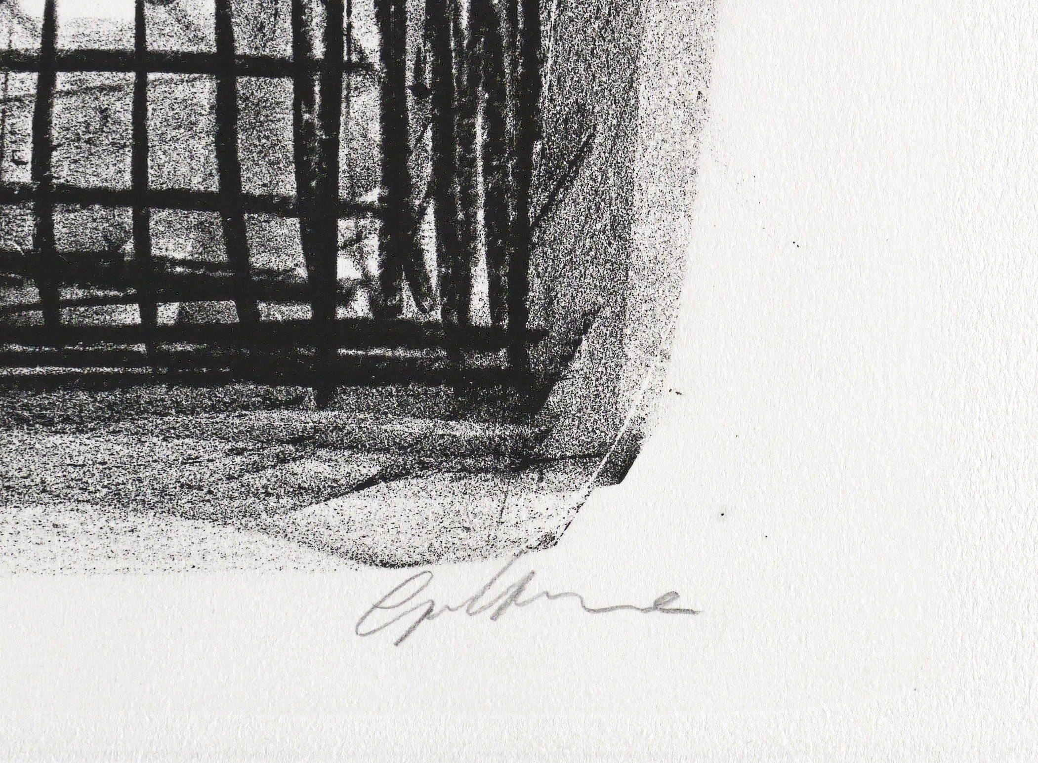 1987. Lithografie / Kreidelithografie, partiell geschabt, in Schwarz, auf hellchamois Büttenkarton. – Originale Künstlergrafik, von Dieter Goltzsche. – Auflage Exemplar Nr. 68/74. – 34,5 x 36,5 cm (Darstellung / Druckbild), 40 x 54 cm (Blatt).
