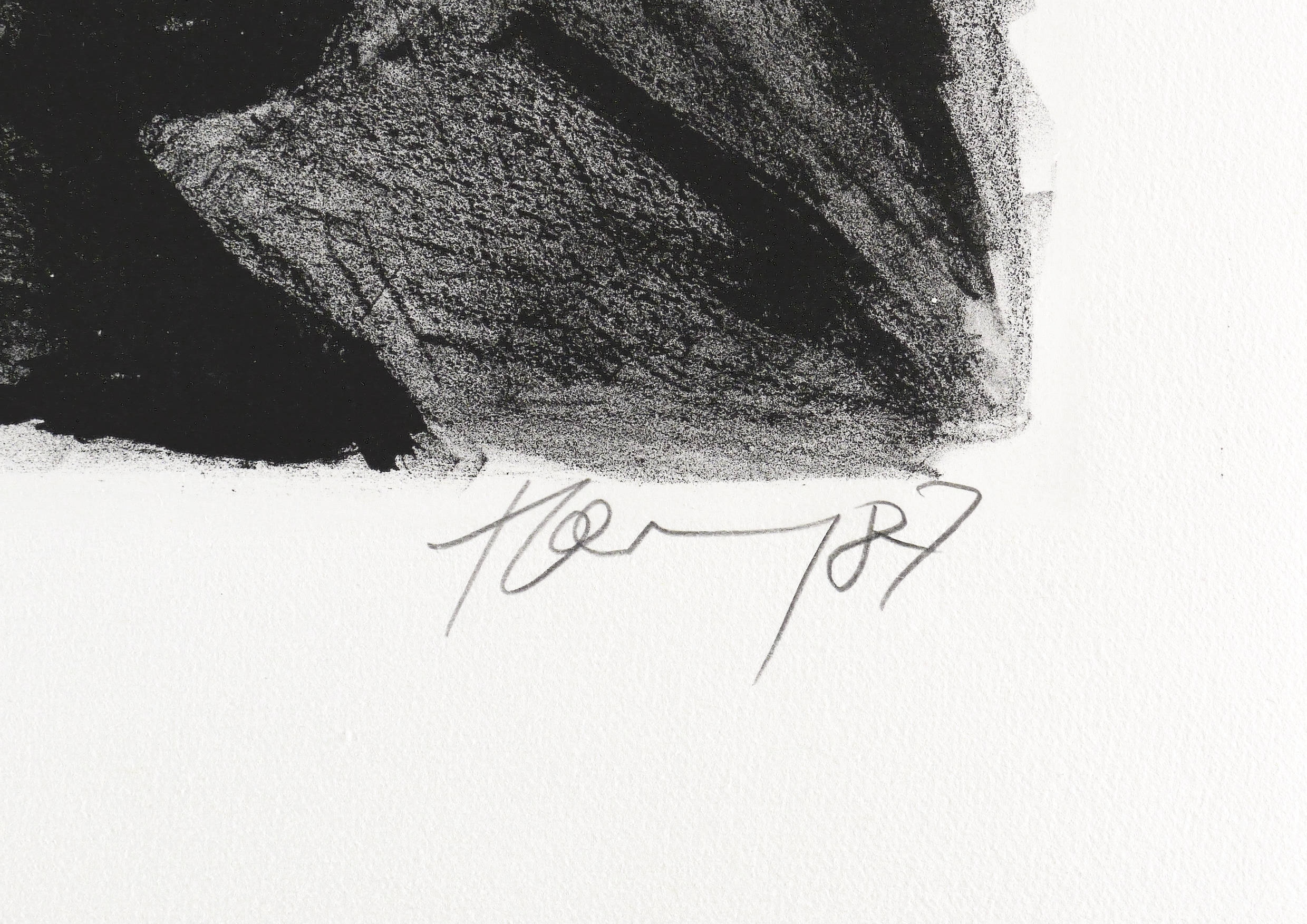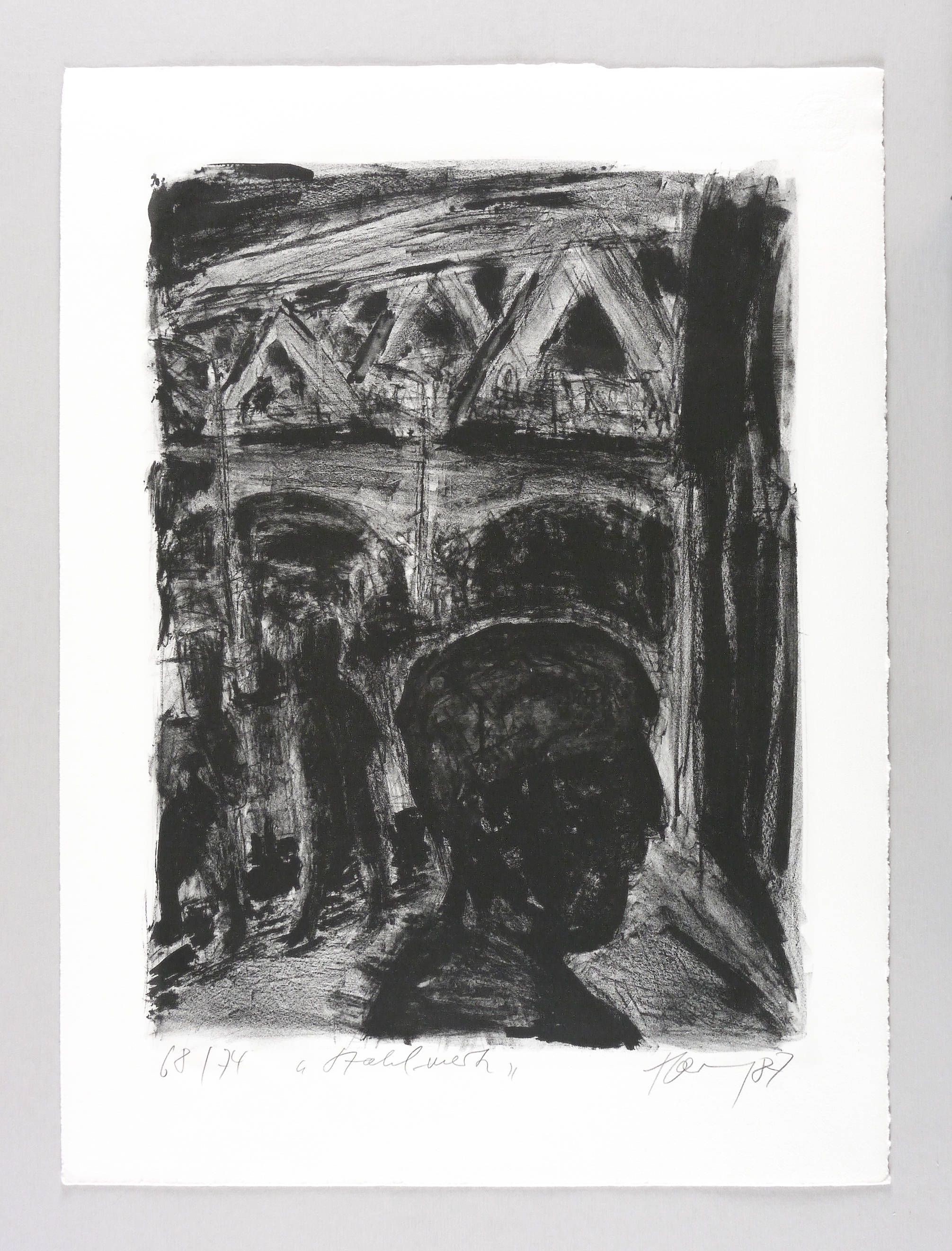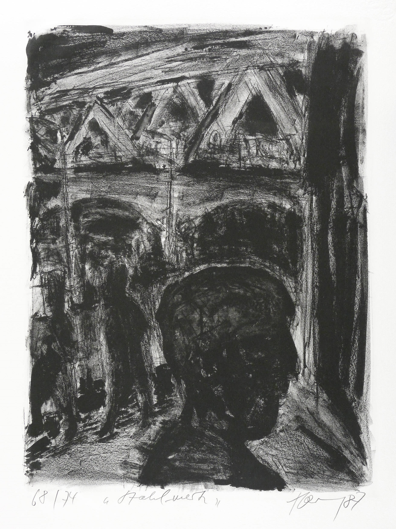 1987. Lithografie / Kreide- & Pinsellithografie, in Schwarz, auf hellchamois Hahnemühle. – Originale Künstlergrafik, von Hartmut Hornung. – Auflage Exemplar Nr. 68/74. – 42,6 x 31,7 cm (Darstellung / Druckbild), 54 x 40 cm (Blatt).