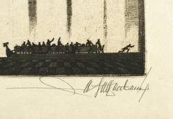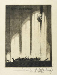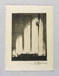 1920-1930. Radierung / Kaltnadel, in Schwarz, auf gelbem Velin. – Exlibris, von Walter Helfenbein. – 12,8 x 9,4 cm (Darstellung / Platte), 17,5 x 13,0 cm (Blatt).