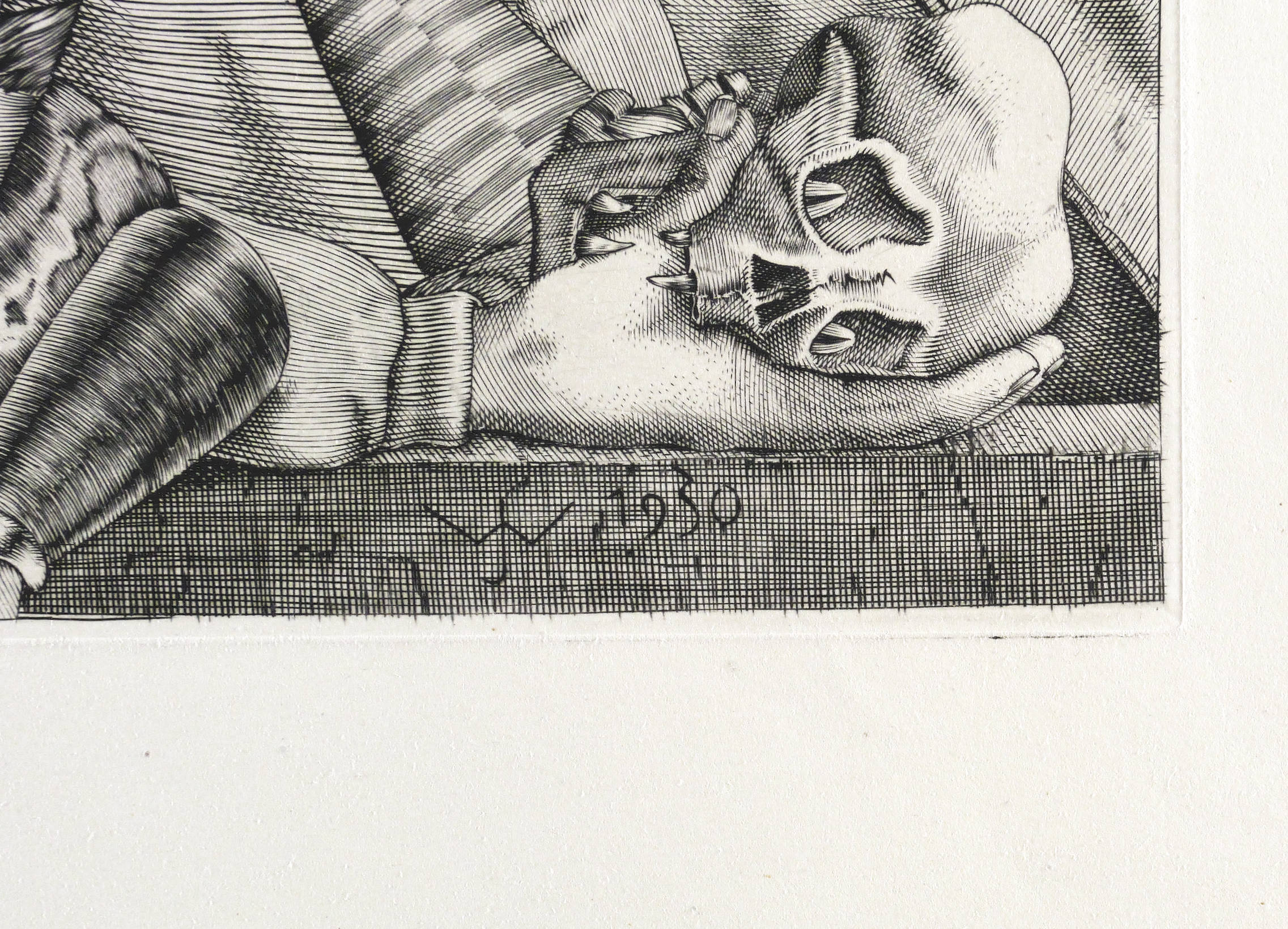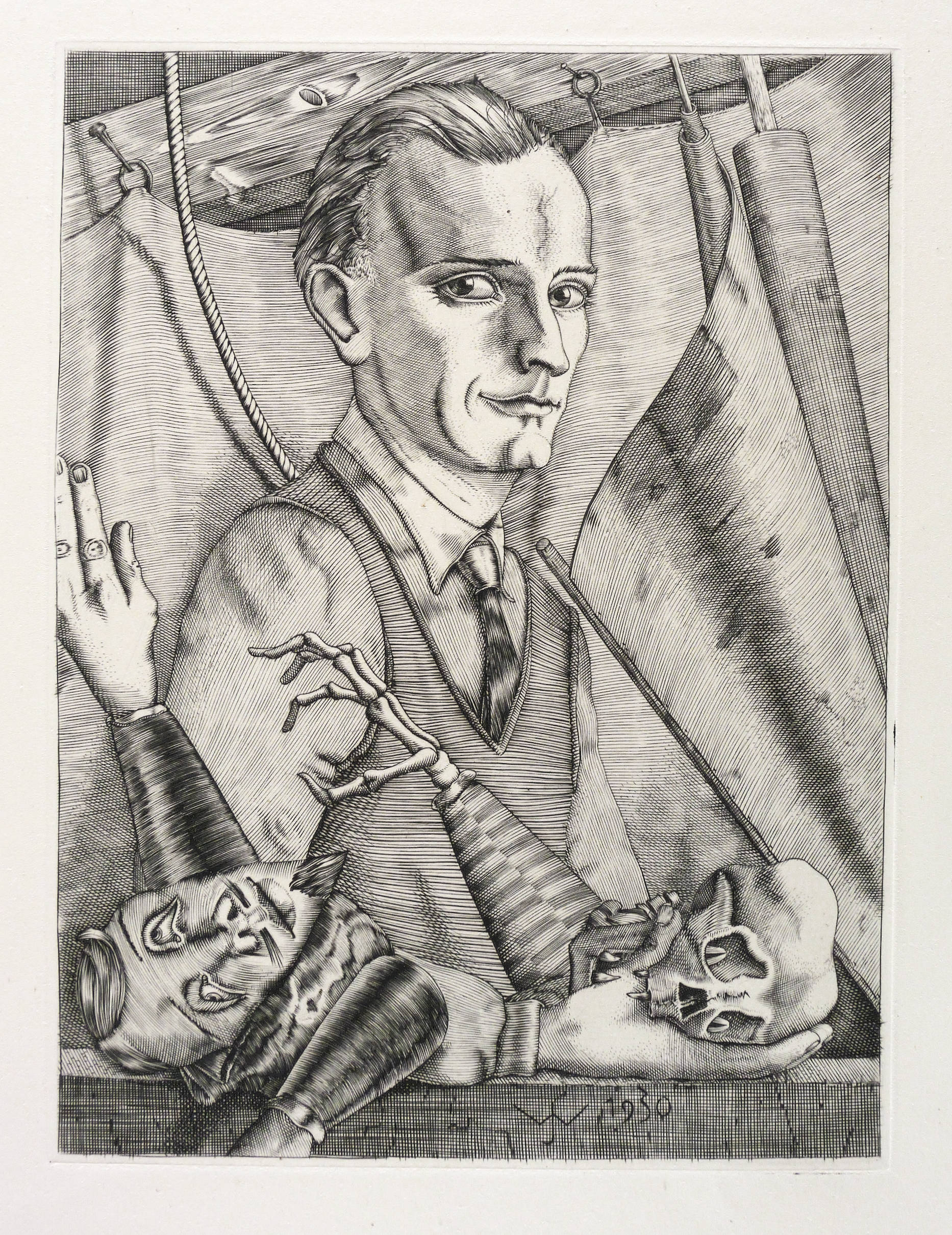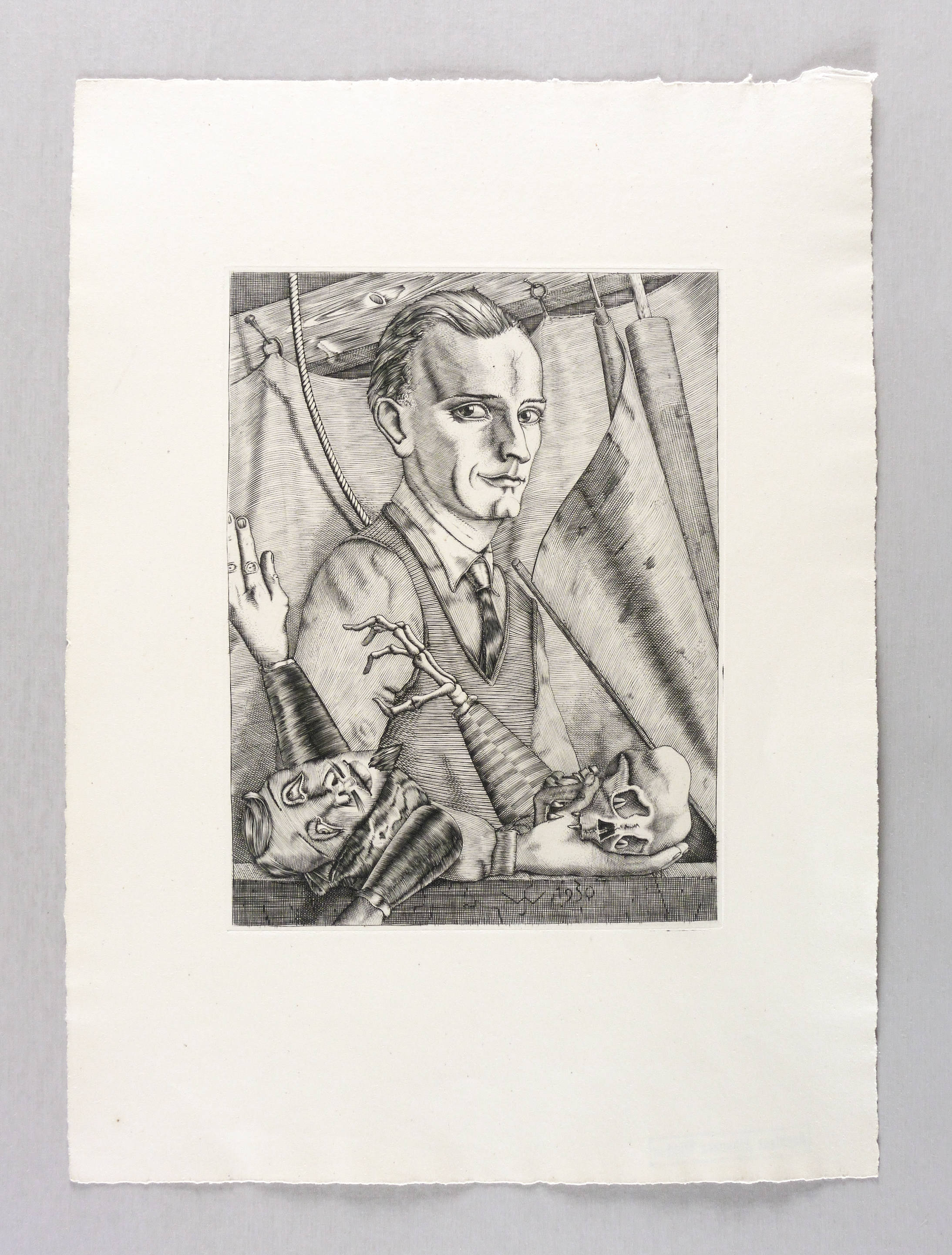 Nicht handsigniert. In der Platte rechts unten ligiertes Monogramm und Jahr: ″JW 1930″. Verso Nachlass-Stempel in Dunkelblau: ″Nachlass Johannes Wüsten″. Dazu in Kugelschreiber Titel und Nachlass- Bestätigung: ″'Der Puppenspieler' // 'Nr. 45 Thomas Wüsten″. – Autorisierter Abzug von der originalen Platte für den Nachlass. – Der Stempel vom Blattrücken kaum merklich durchschlagend. Sonst ohne Mängel. Guter Zustand.