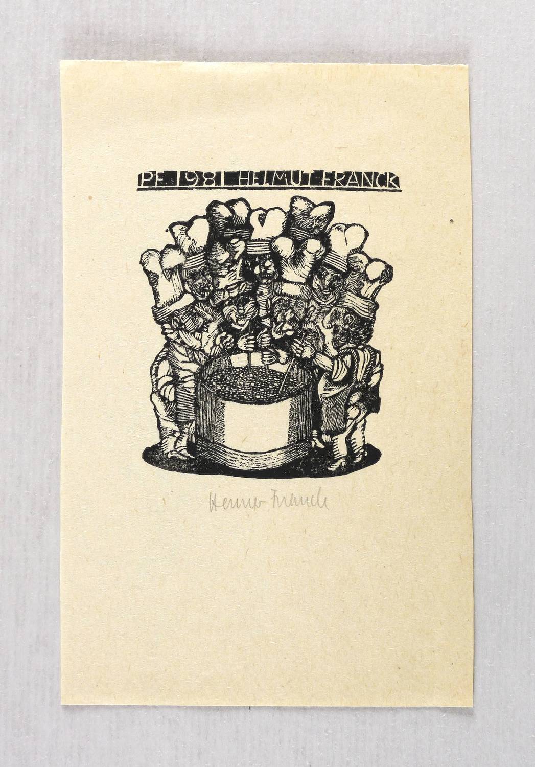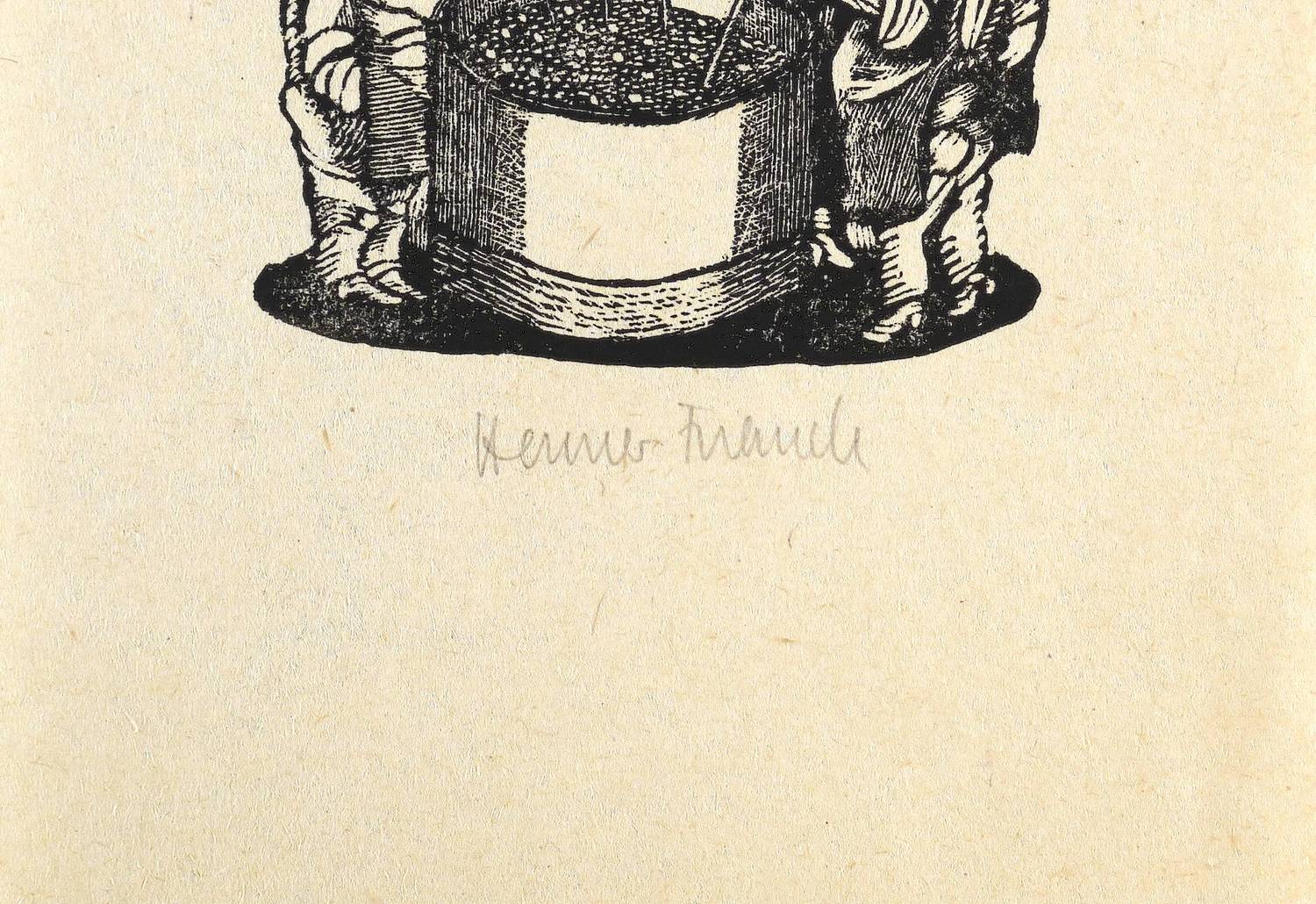 Unterhalb in Bleistift signiert: ″Henner Franck″. Im Druckstock oben bezeichnet: ″PF 1981 HELMUT FRANCK″. – In der DDR bezeichnete man Holzschnitte im Miniaturformat gern auch als Holzstiche. Dies ist insofern irreführend, als Holzstiche im Verfahren des Tiefdrucks gedruckt werden, nicht wie hier, im Hochdruckverfahren. – Sehr guter Zustand.