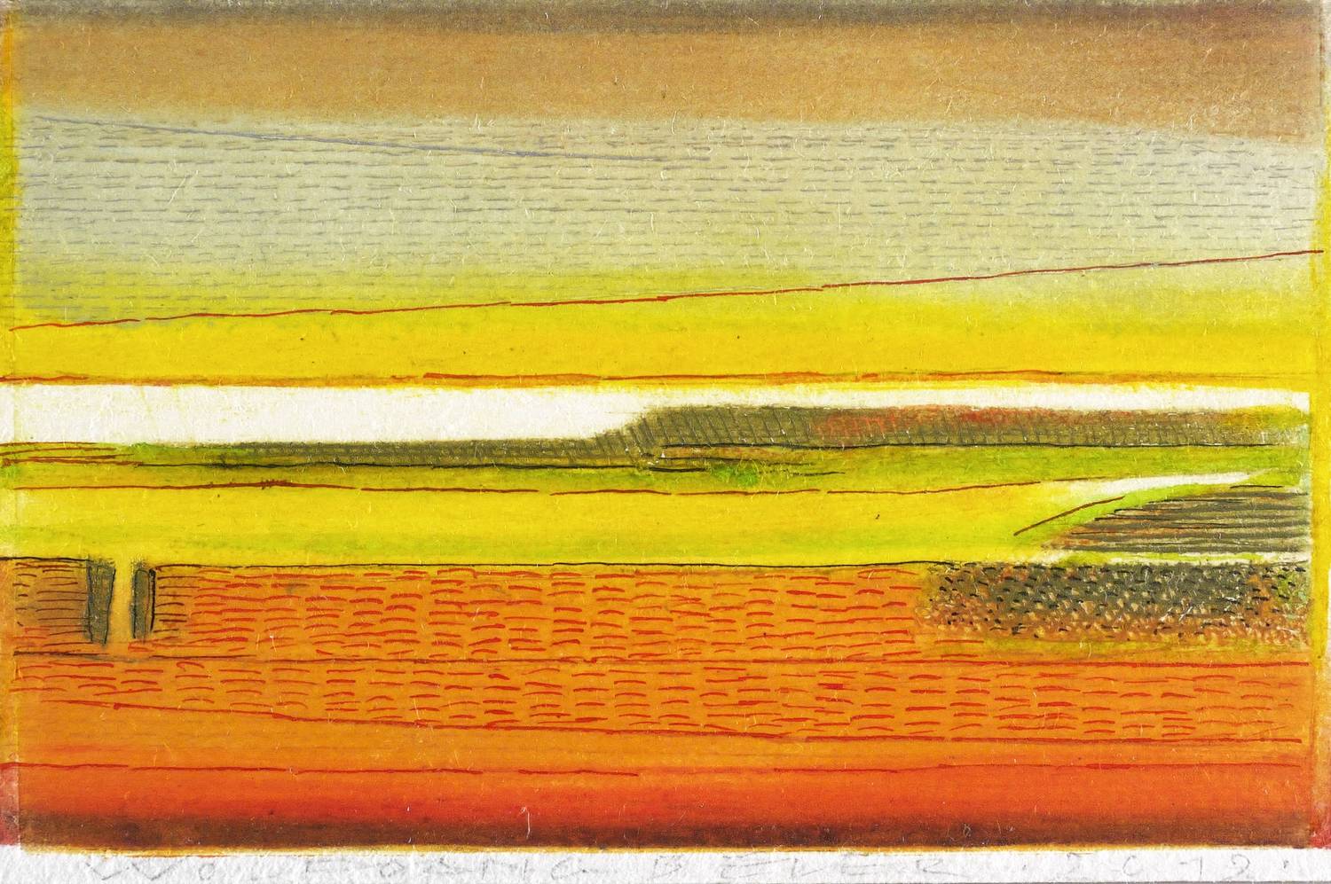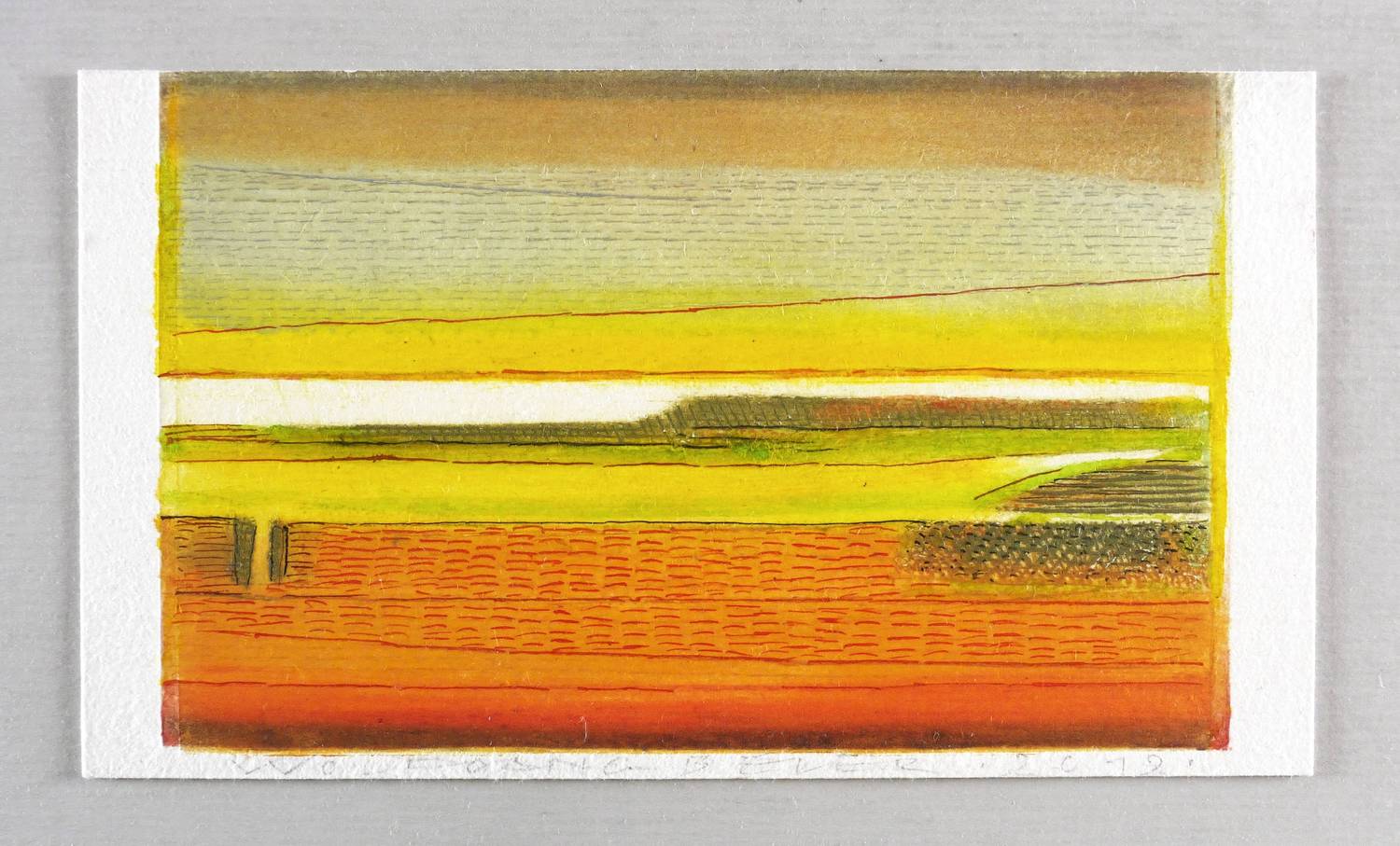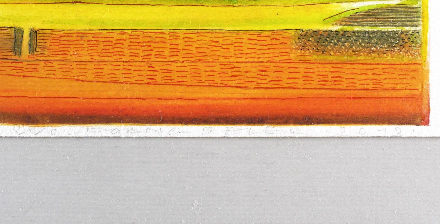 2012. Farbradierung / Strichätzung, in Gelb, Orange, Grün, Violett & Schwarz, auf hellchamois Velin. – Originale Künstlergrafik, von Wolfgang Beier. – 10,2 x 16,0 cm (Darstellung / Platte), 10,6 x 18,5 cm (Blatt).