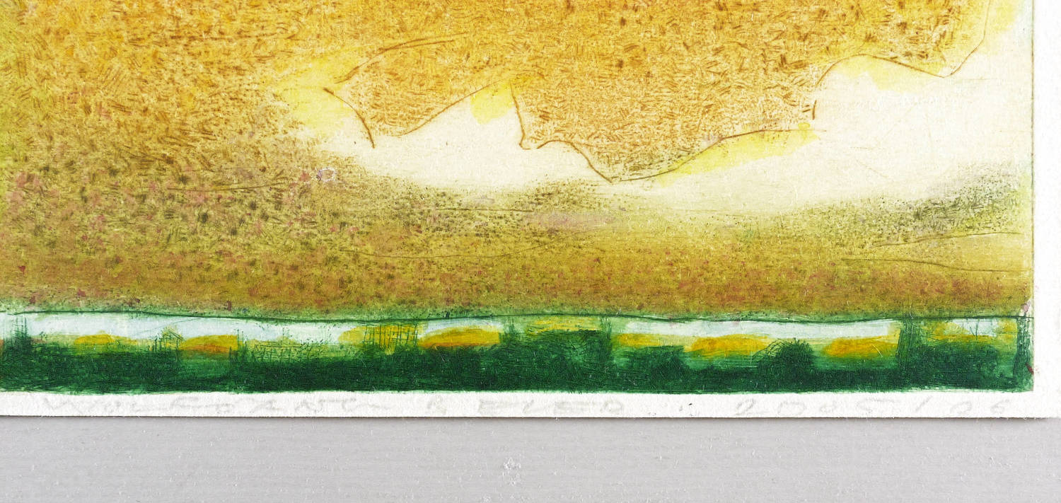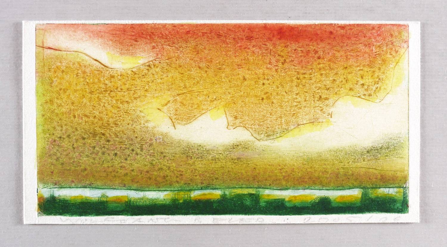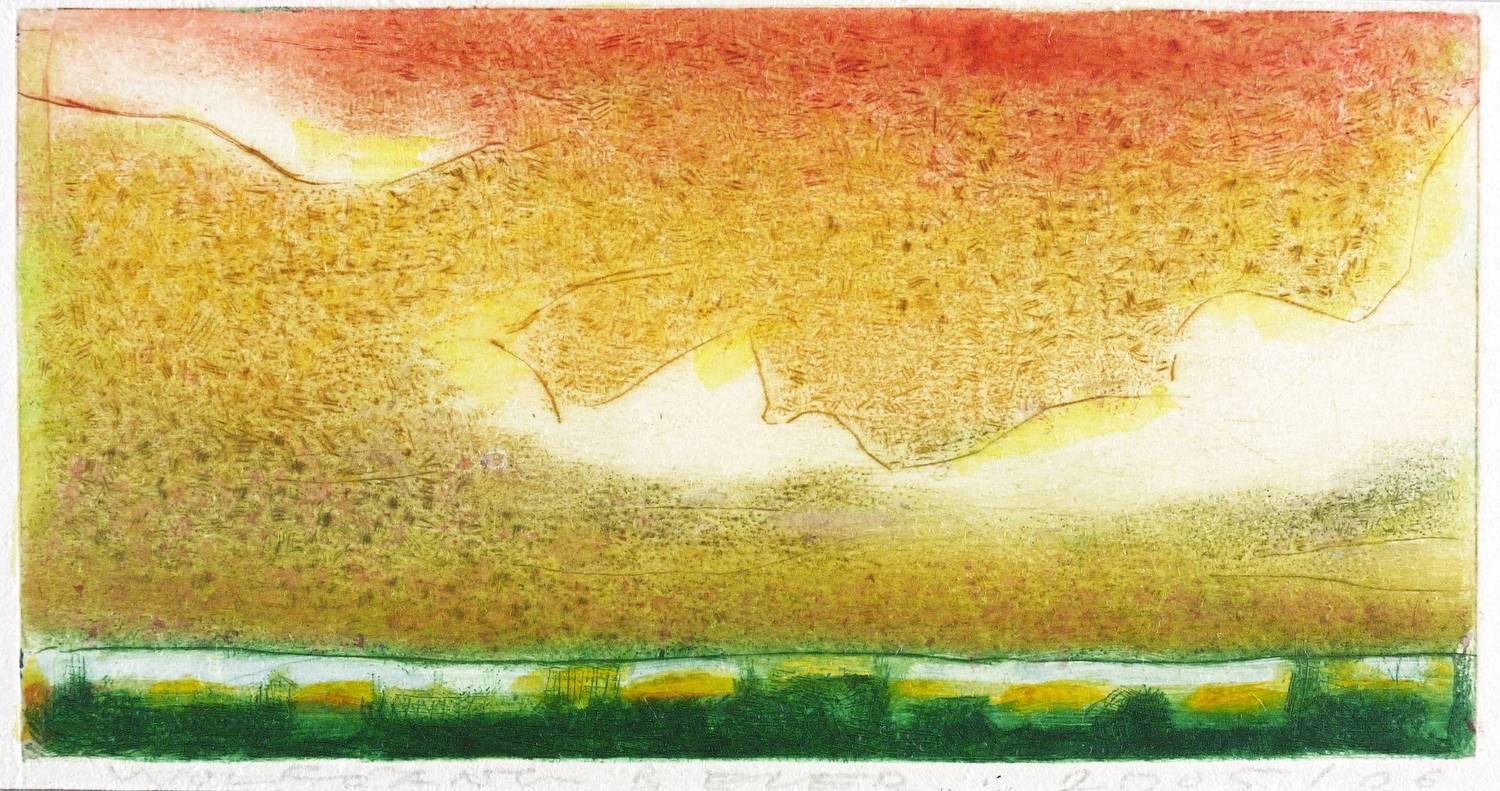 2005/2006. Farbradierung / Strichätzung, in Gelb, Hellrot, Grün & Violett, auf hellchamois Velin. – Originale Künstlergrafik, von Wolfgang Beier. – 10,2 x 19,6 cm (Darstellung / Platte), 10,8 x 20,9 cm (Blatt).