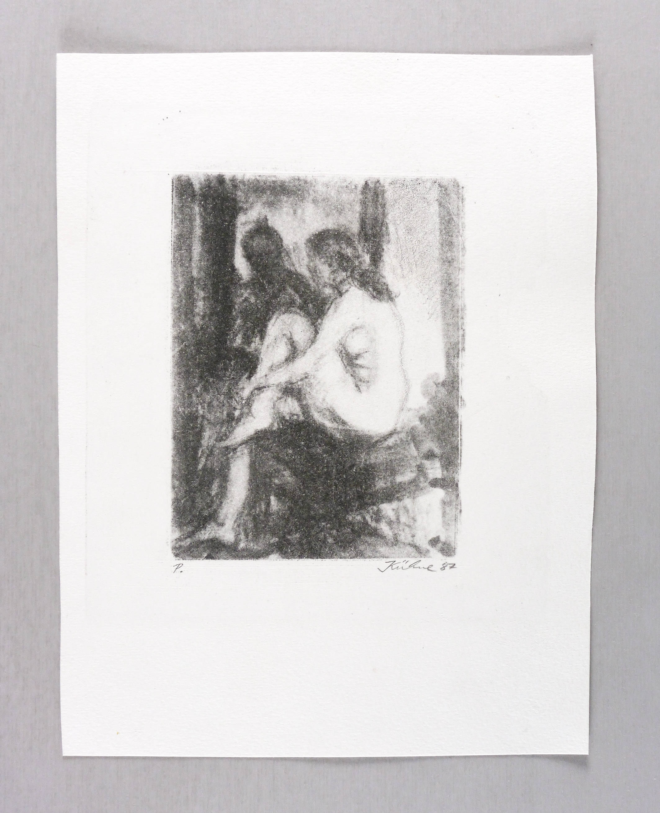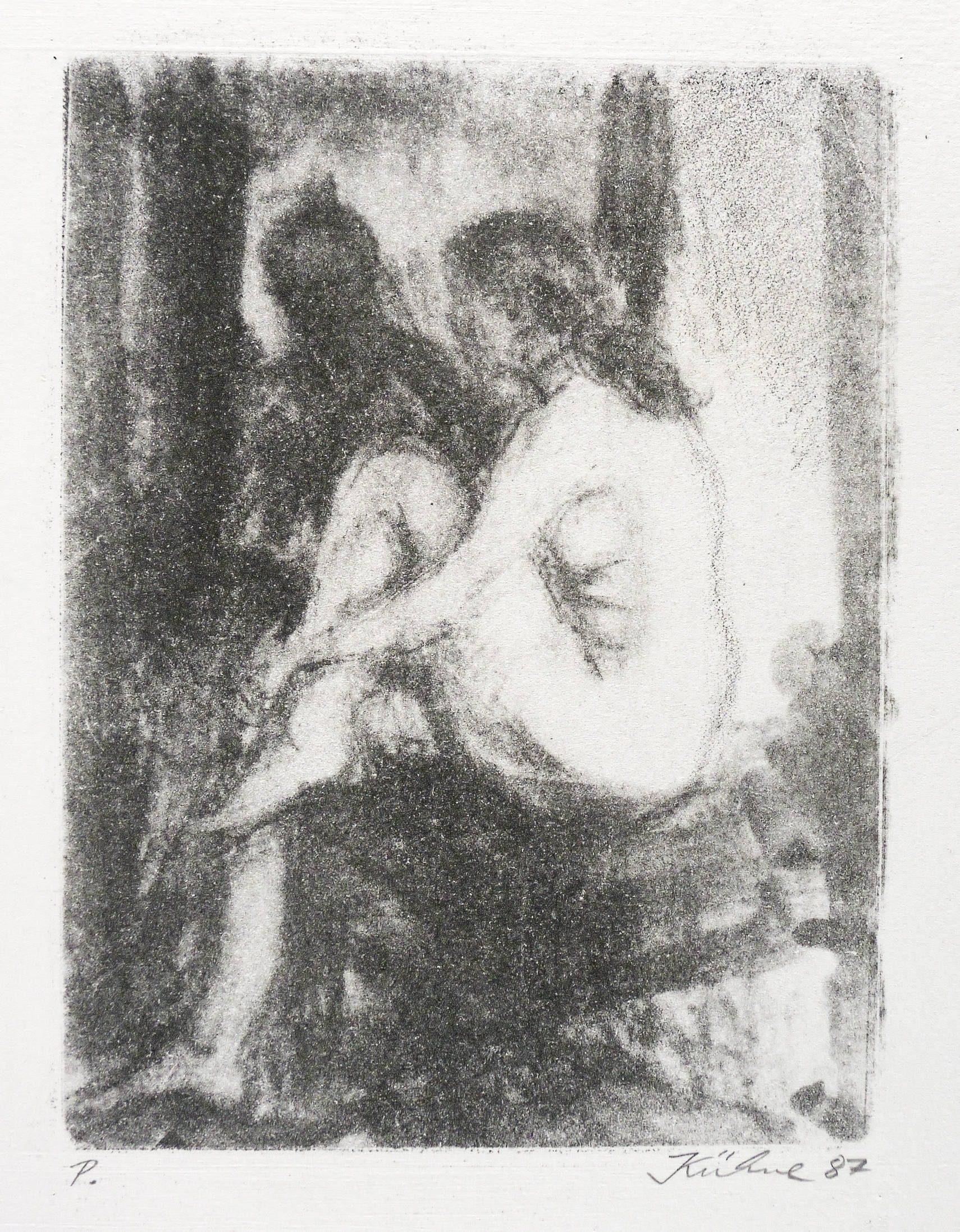 1987. Lithografie / Kreidelithografie, in Schwarz, auf hellchamois Velinkarton. – Originale Künstlergrafik, von Wolfgang Kühne. – Probedruck. – 17,3 x 13,0 cm (Darstellung / Druckbild), 31 x 24 cm (Blatt).