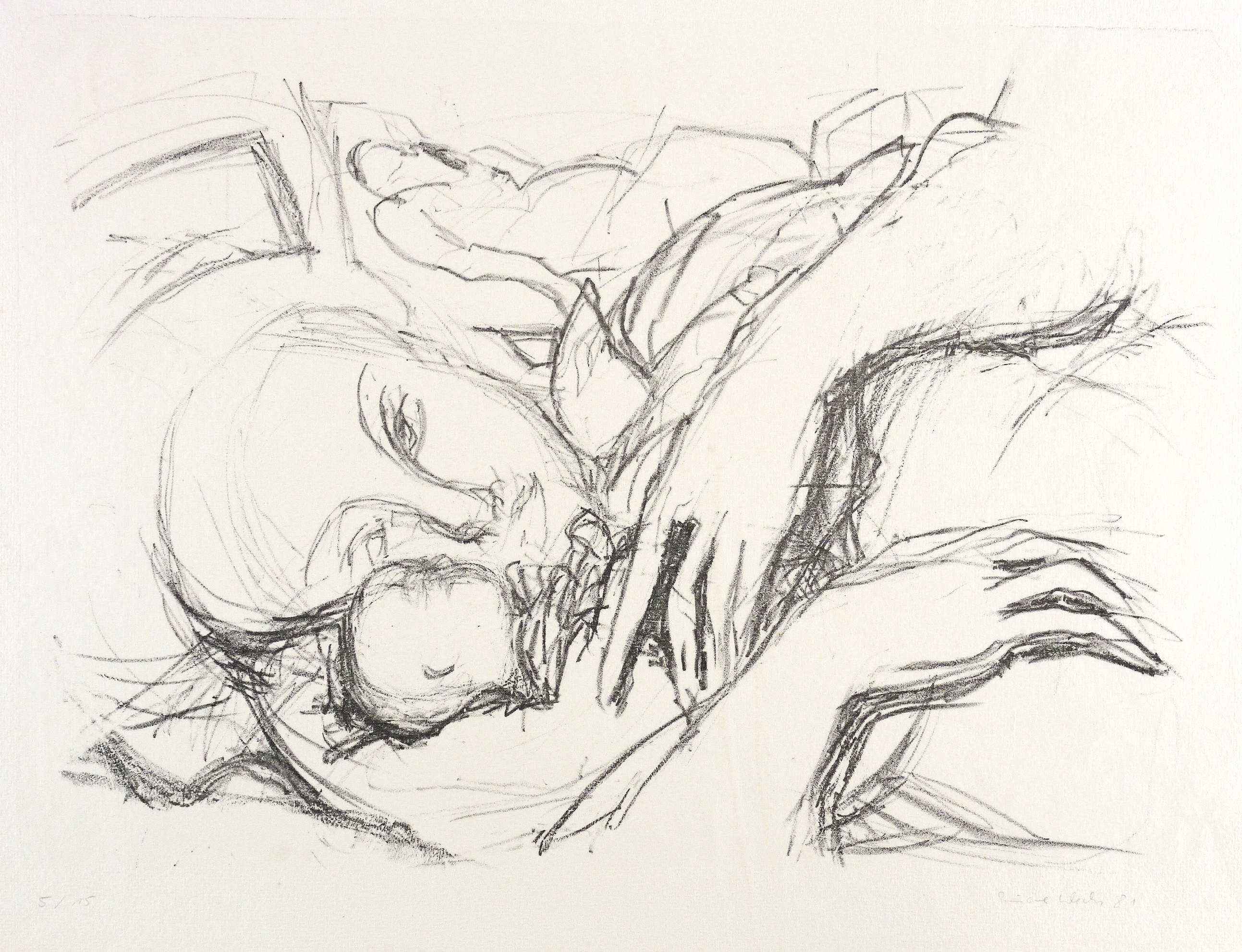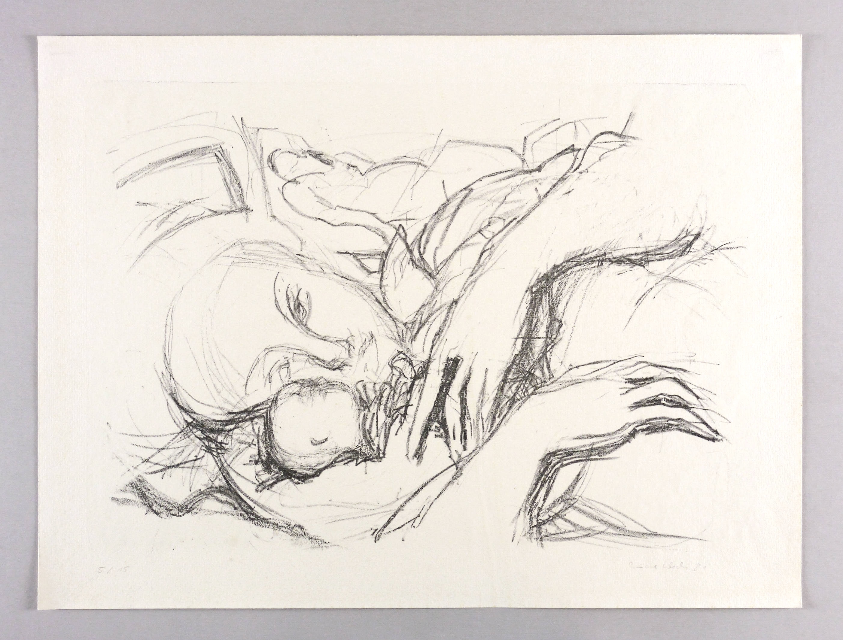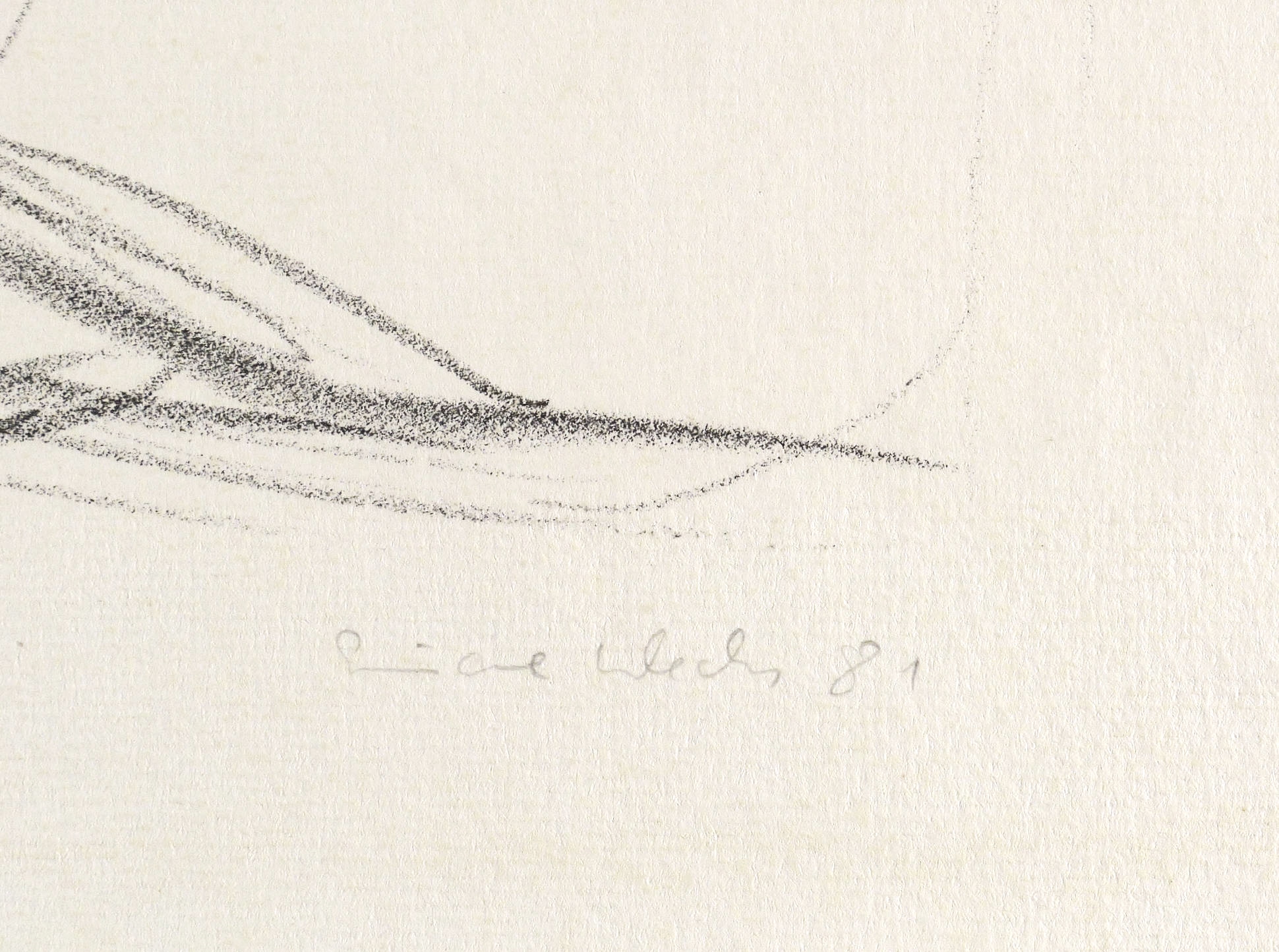 1981. Lithografie / Kreidelithografie, in Schwarz, auf hellgelbem Maschinenbütten. – Originale Künstlergrafik, von Simone Wecks. – Auflage Exemplar Nr. 5/15. – 35,0 x 50,5 cm (Darstellung / Druckbild), 45 x 60 cm (Blatt).