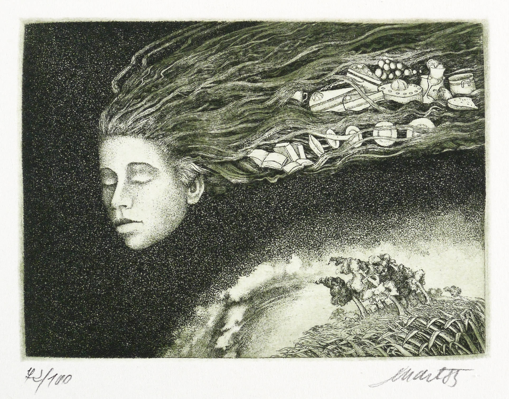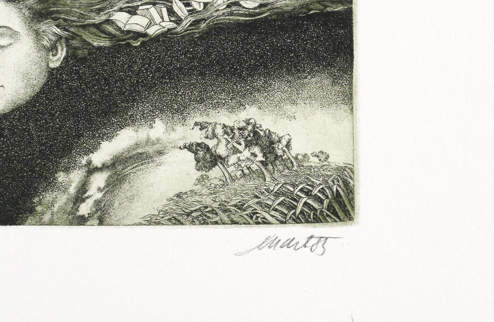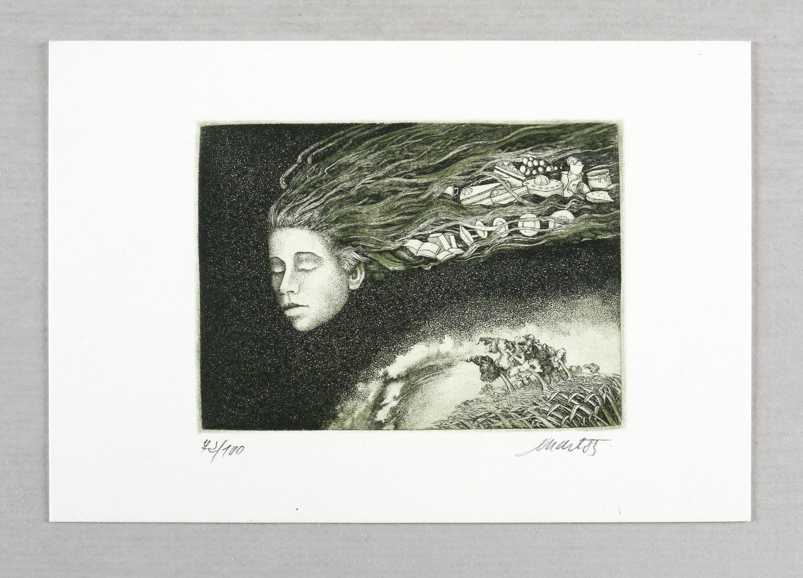1985. Radierung / Aquatinta & Strichätzung, in Schwarzgrün, auf hartem weißem Velin. – Originale Künstlergrafik, von Josef Dudek. – Auflage Exemplar Nr. 72/100. – 6,3 x 8,7 cm (Darstellung / Platte), 10,0 x 14,4 cm (Blatt).