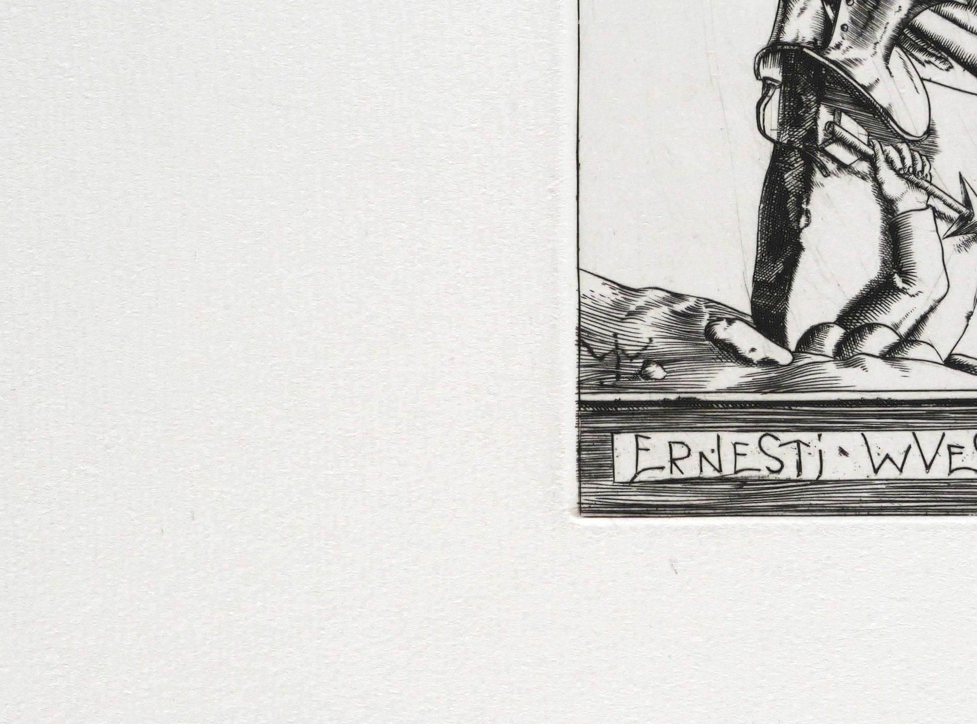 Nicht handsigniert. In der Platte links unten ligiertes Monogramm: ″JW″. Darunter Inschrift: ″ERNESTI WUESTENII LIBER″. Verso Nachlass- Stempel: ″Nachlass Johannes Wüsten″. Dazu in Kugelschreiber Nachlass- Bestätigung: ″'Exlibris Ernst Wüsten' Nr. 19 / Juni 1975 best. H. Wüsten″. – Autorisierter Abzug von der originalen Platte für den Nachlass. – Die Schrift vom Blattrücken leicht durchschlagend. Sonst ohne Mängel. Guter Zustand.