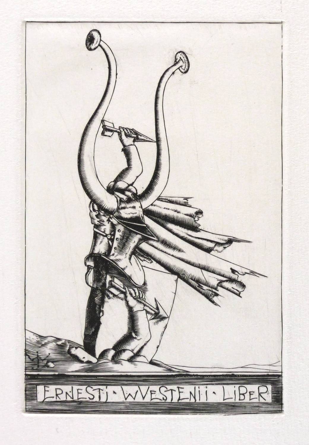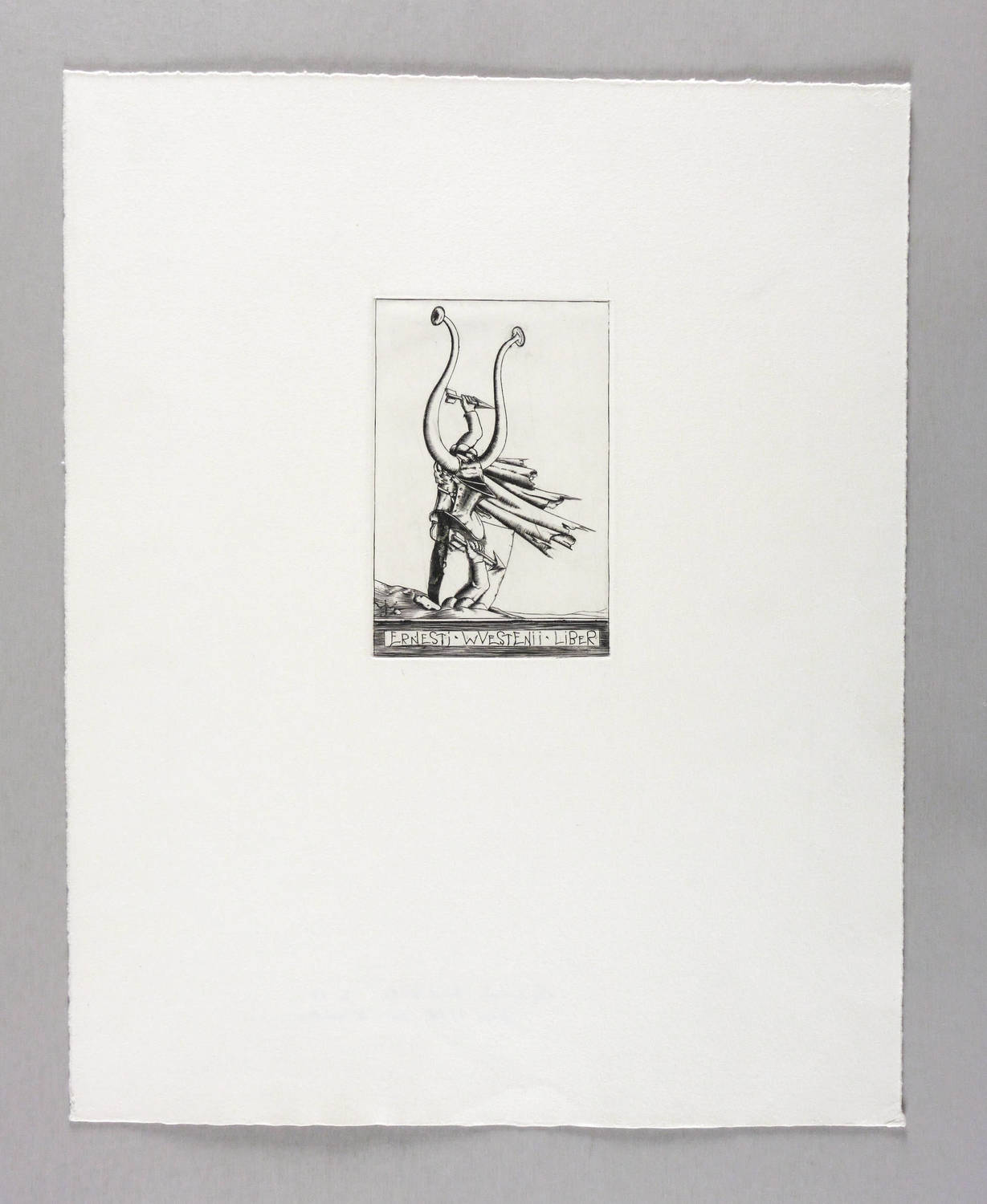 1929. Kupferstich / Linienstich, in Schwarz, auf kräftigem hellchamois Velin. – Exlibris, von Johannes Wüsten. – 14,8 x 9,8 cm (Darstellung / Platte), 44 x 35 cm (Blatt).