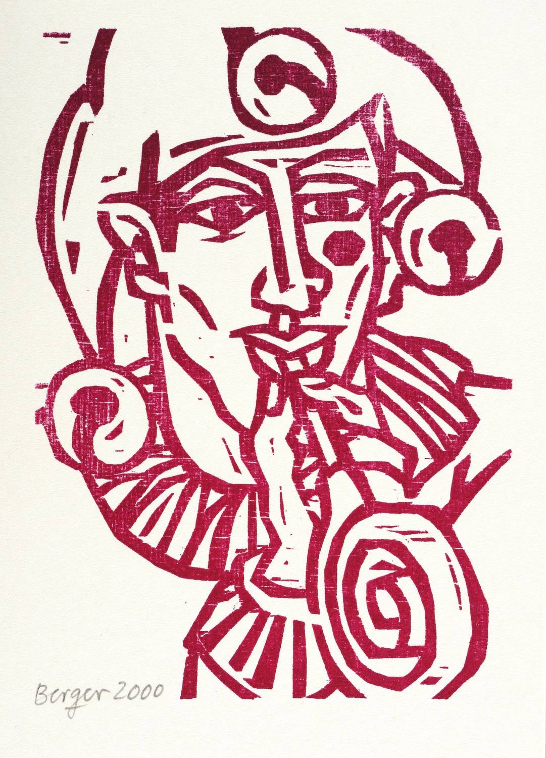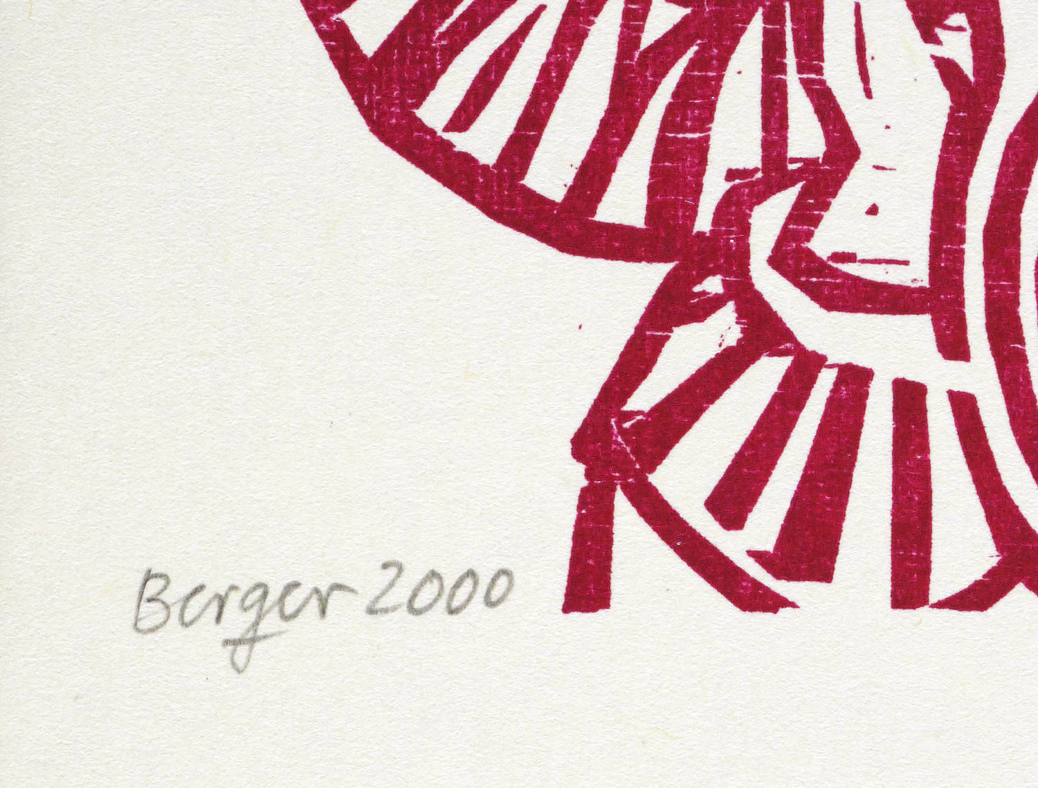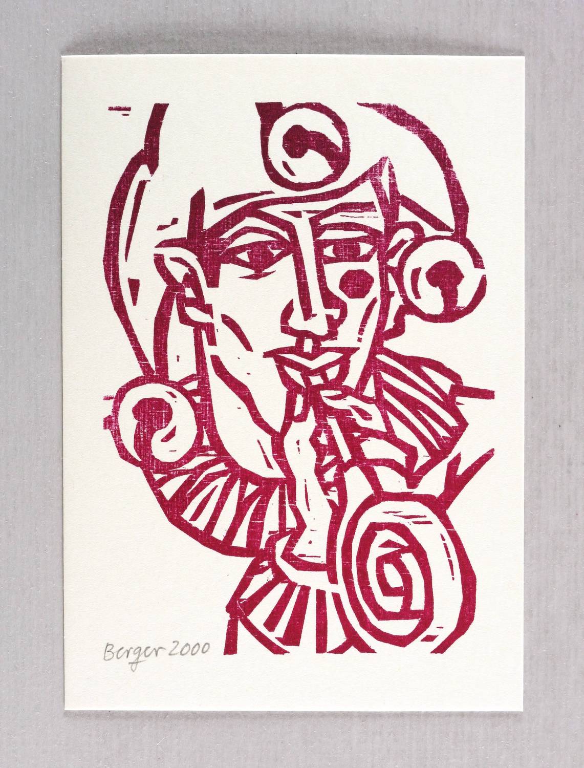 2000. Holzschnitt, in Rot, auf hellchamois Velinkarton. – Originale Künstlergrafik, von Roland R. Berger. – 12,5 x 9,0 cm (Darstellung / Druckbild), 15 x 11 cm (Blatt).