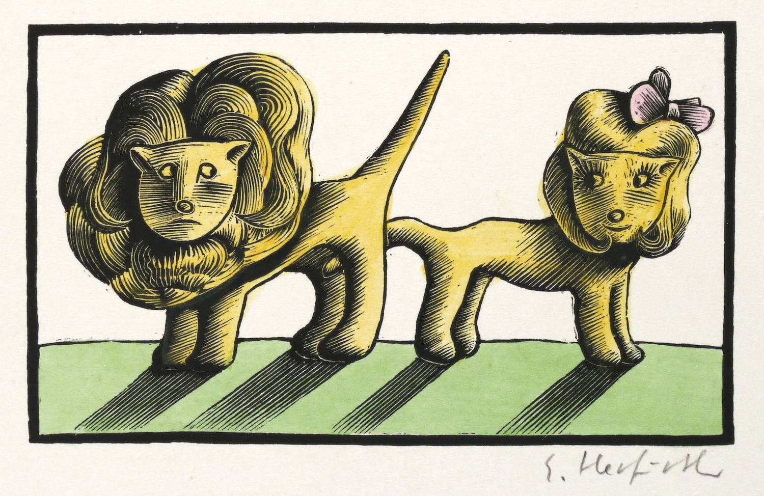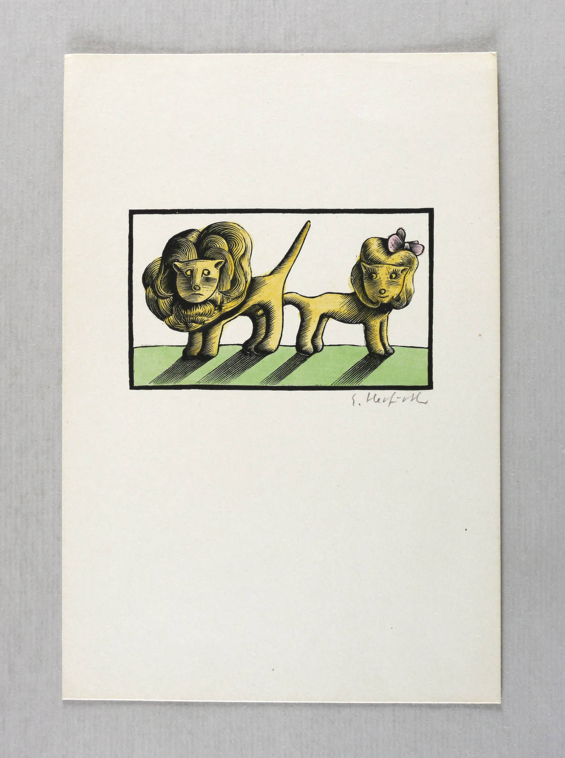 1970-1980. Farbholzschnitt, in 3 Farben, auf hellem Karton. – Originale Künstlergrafik, von Egbert Herfurth. – 5,8 x 9,6 cm (Darstellung / Druckbild), 21 x 14 cm (Blatt).