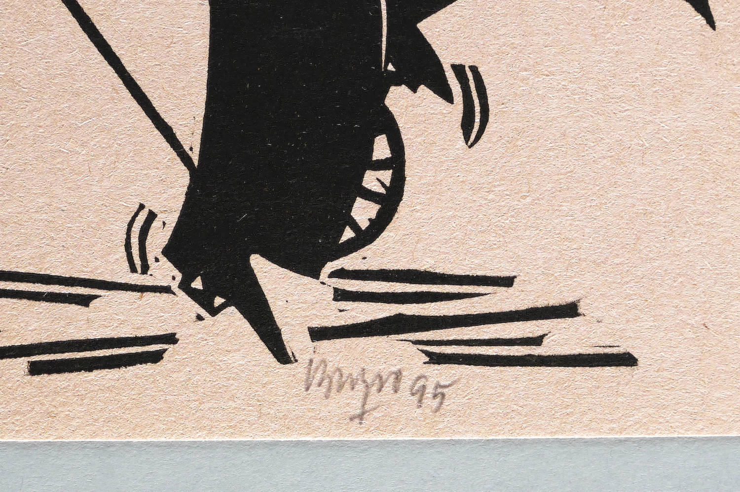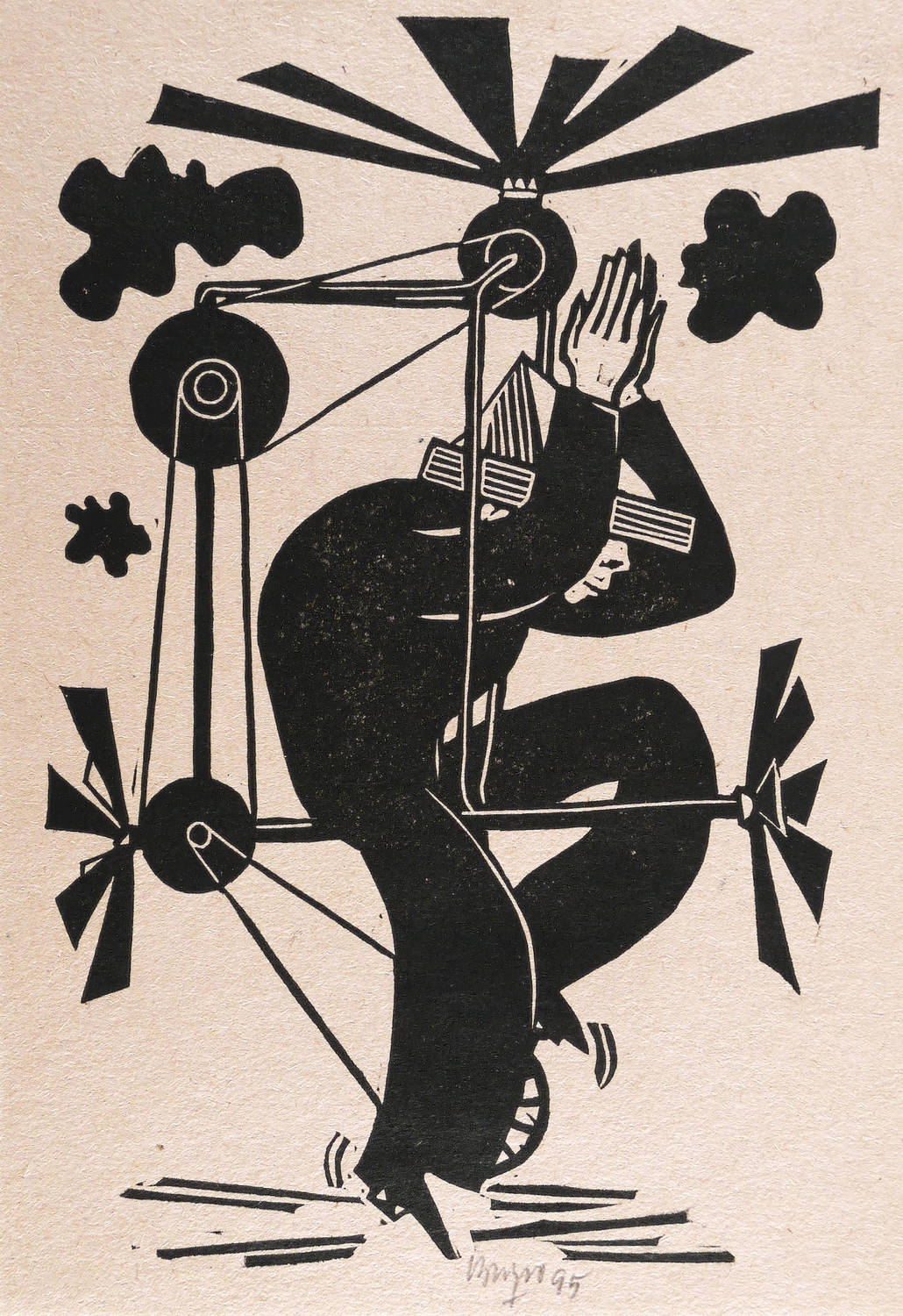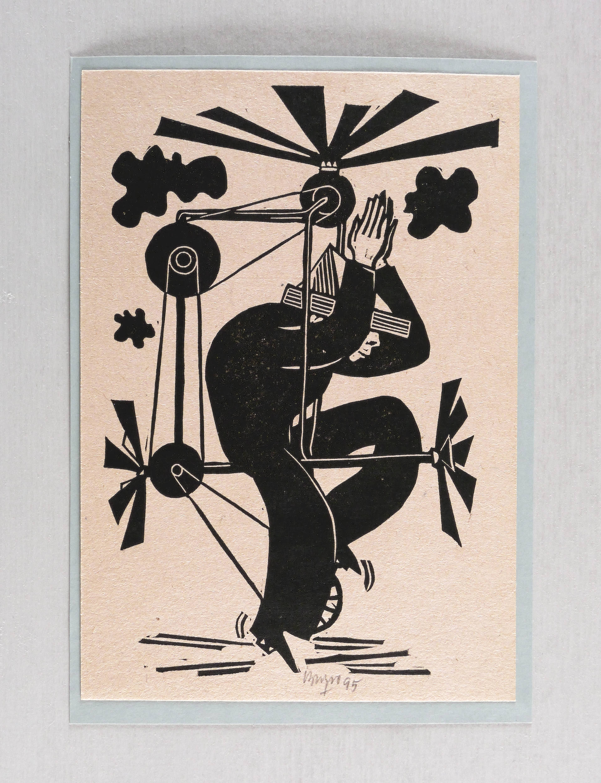 1995. Linolschnitt, in Schwarz, auf hellrotem Maschinenpapier. – Originale Künstlergrafik, von Roland R. Berger. – 18,7 x 12,6 cm (Darstellung / Druckbild), 20 x 14 cm (Blatt).