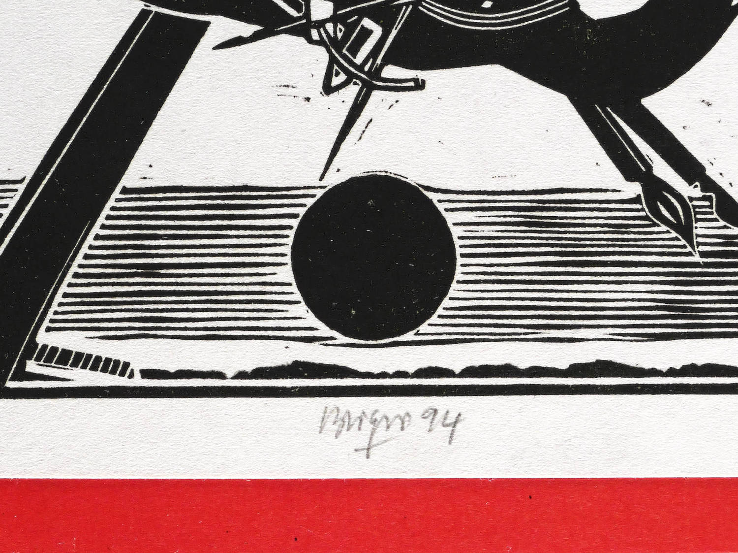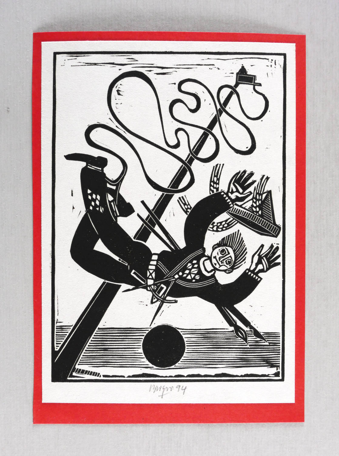 1994. Linolschnitt, in Schwarz, auf hellrotem Maschinenpapier. – Originale Künstlergrafik, von Roland R. Berger. – 17,7 x 12,7 cm (Darstellung / Druckbild), 20 x 14 cm (Blatt).
