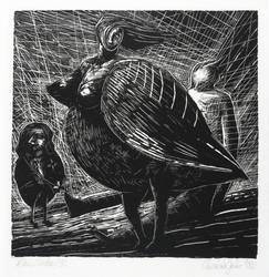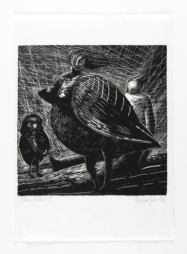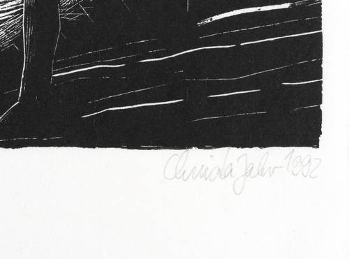 1992. Holzschnitt, in Schwarz, auf feinem Japanbütten. – Originale Künstlergrafik, von Christa Jahr. – Künstlerexemplar (e.a.). – 22,6 x 22,4 cm (Darstellung / Druckbild), 34 x 24 cm (Blatt).