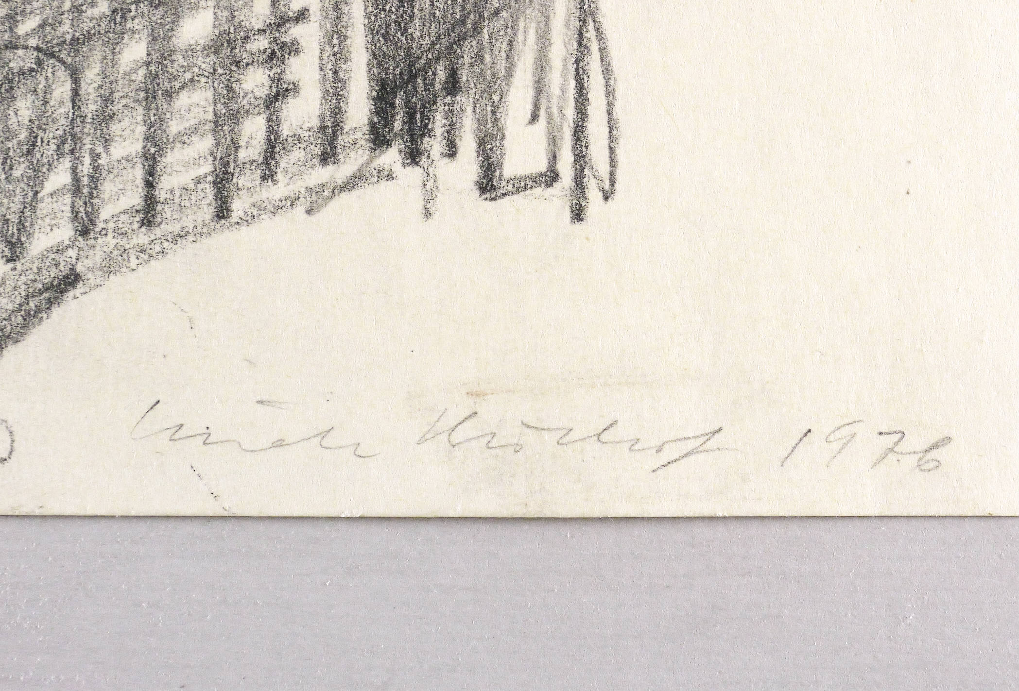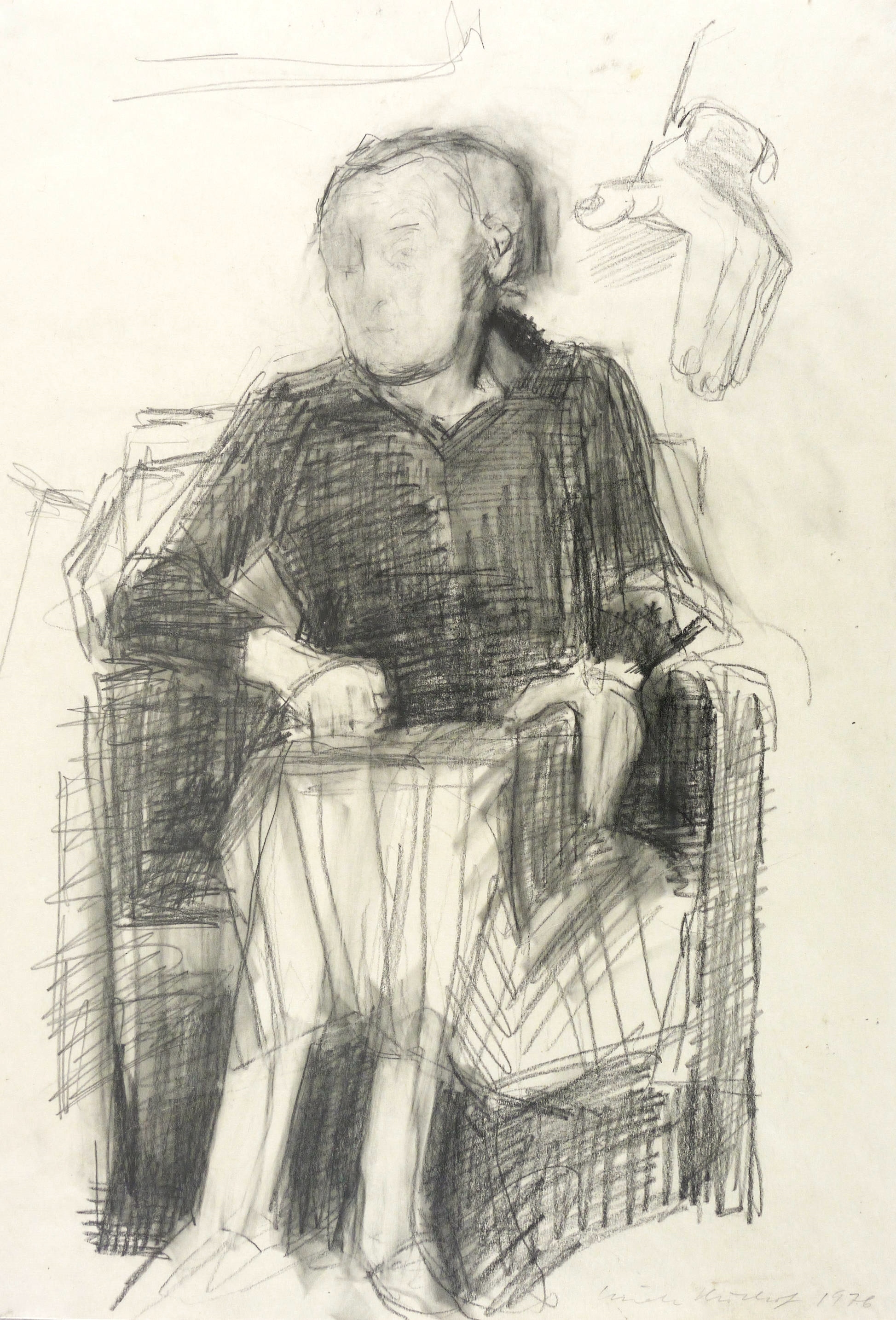 Rechts unten in Bleistift signiert und datiert: ″Linde Bichof 1976″. Verso weiter Titel, Jahr und nochmals Signatur: ″Sitzende alte Frau (Kobieff) / 1976 Bischof″. – Linde Bischof porträtierte dieselbe Frau auch in der Lithografie ″Frau Kobieff“ für das Mappenwerk ″Nachbarn″, herausgegeben von der Galerie am Prater beim Kreiskulturhaus Prater in Berlin Prenzlauer Berg. – Sehr guter Zustand.