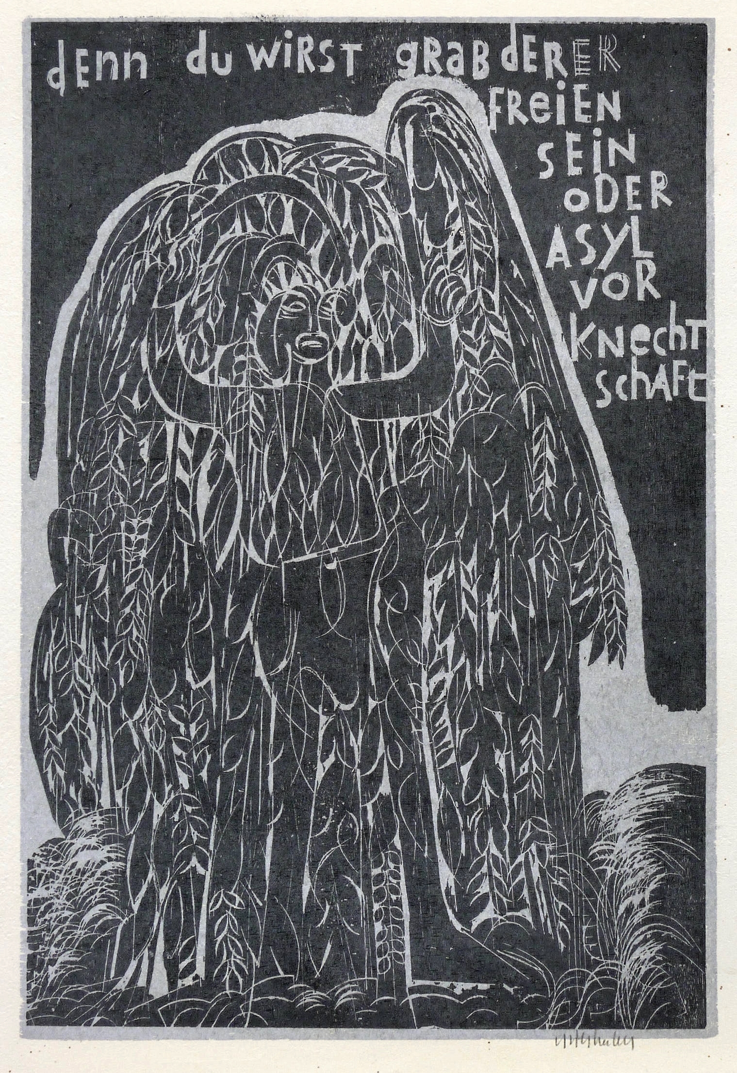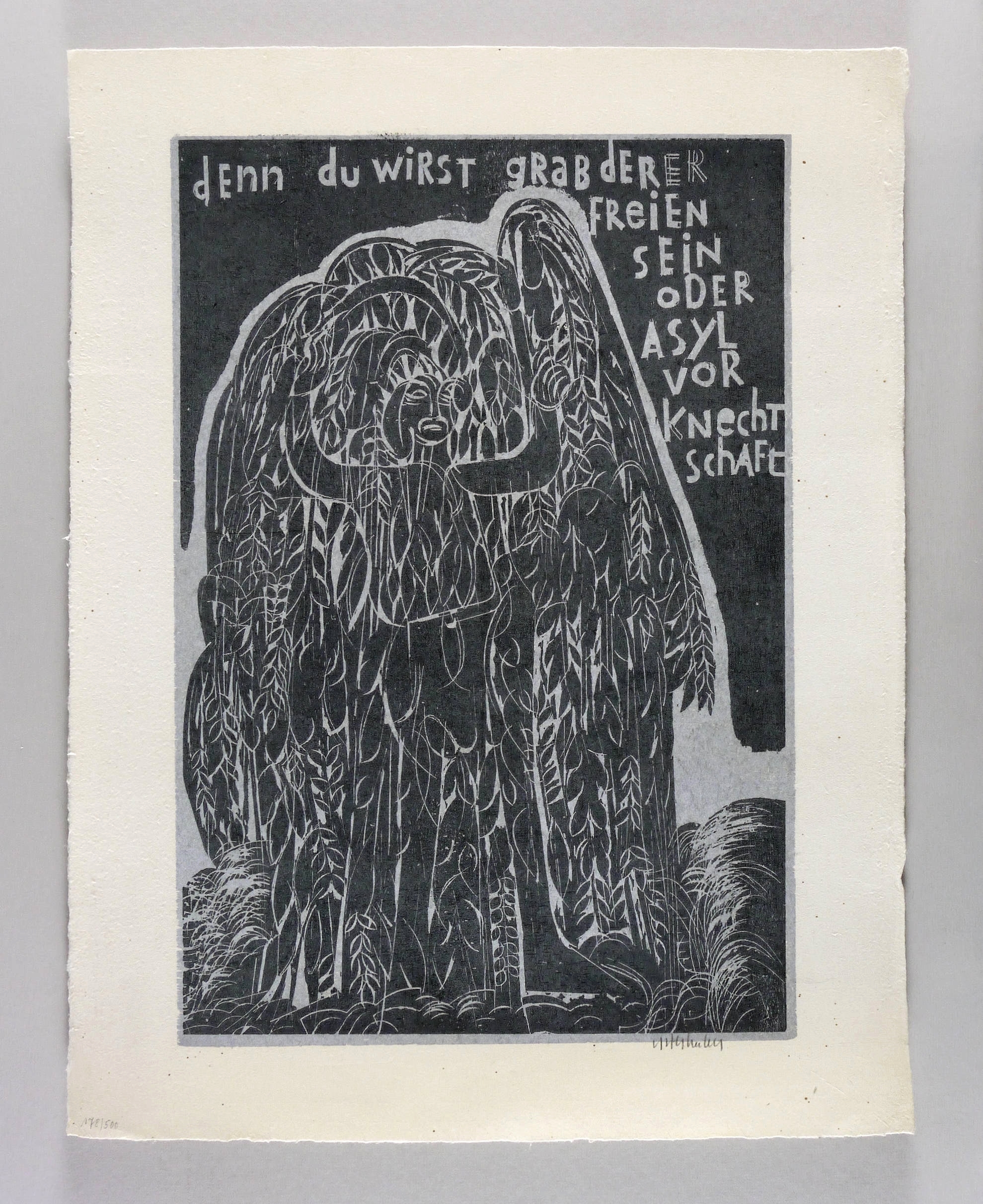 1973. Farbholzschnitt, in Silber & Schwarz, auf hellchamois Japan Kochi. – Originale Künstlergrafik, von HAP Grieshaber. – Auflage Exemplar Nr. 178/500. – 56,5 x 38,6 cm (Darstellung / Druckstock), 66 x 52 cm (Blatt).