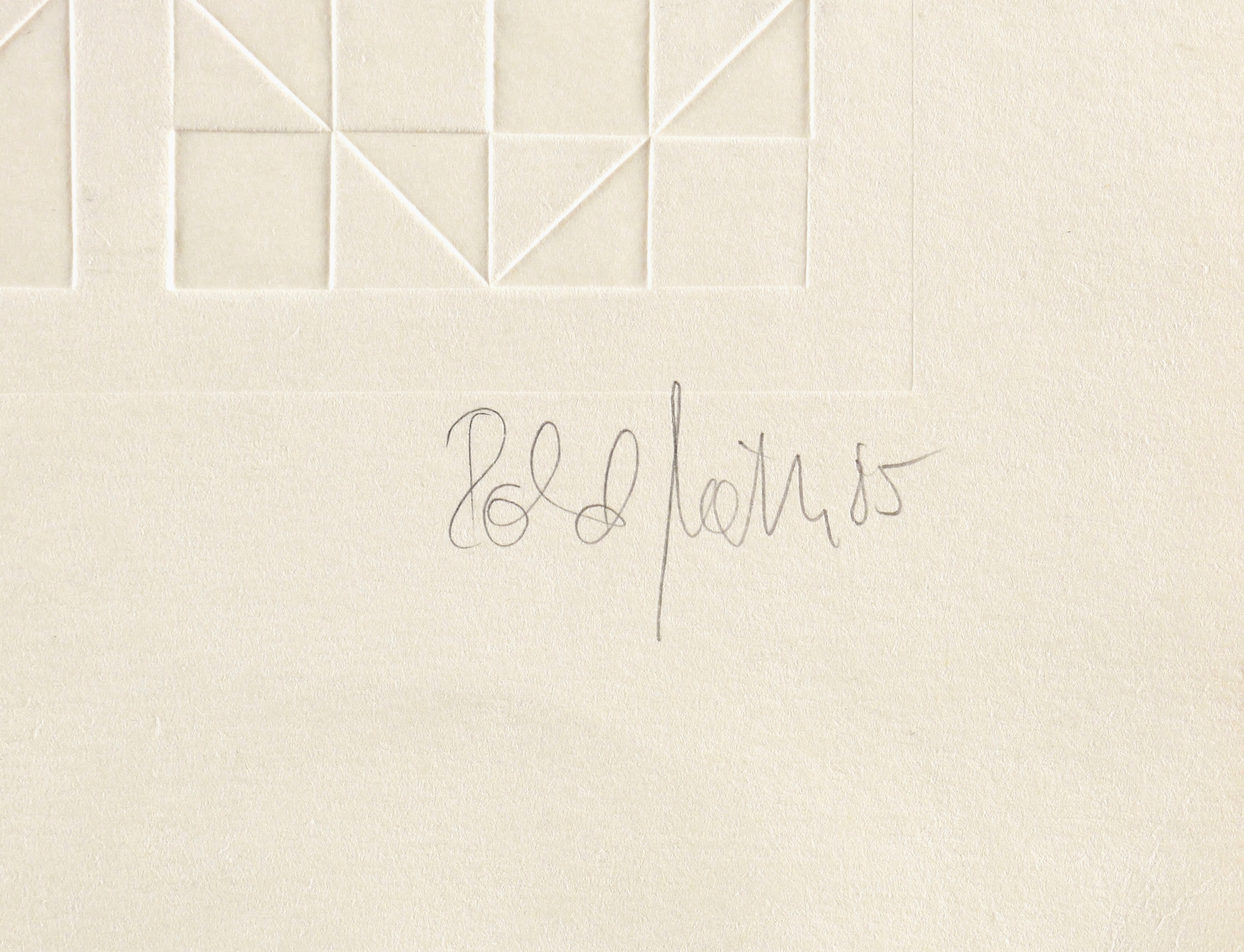 1985. Reliefdruck / Prägedruck, ohne Farben, auf festem gelbem Velinkarton. – Originale Künstlergrafik, von Roland Meinel. – 40,5 x 29,0 cm (Darstellung / Druckbild), 51 x 36 cm (Blatt).