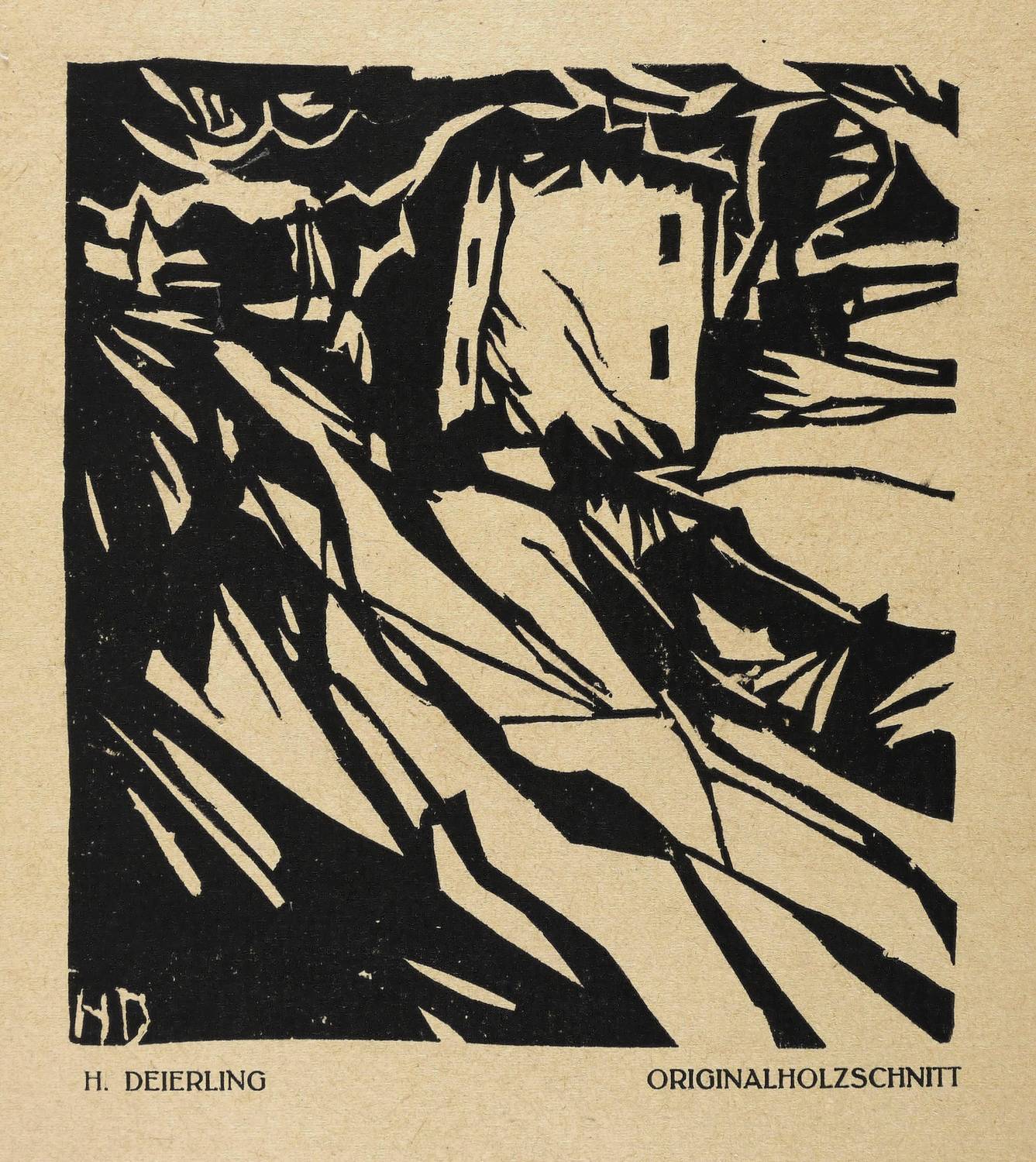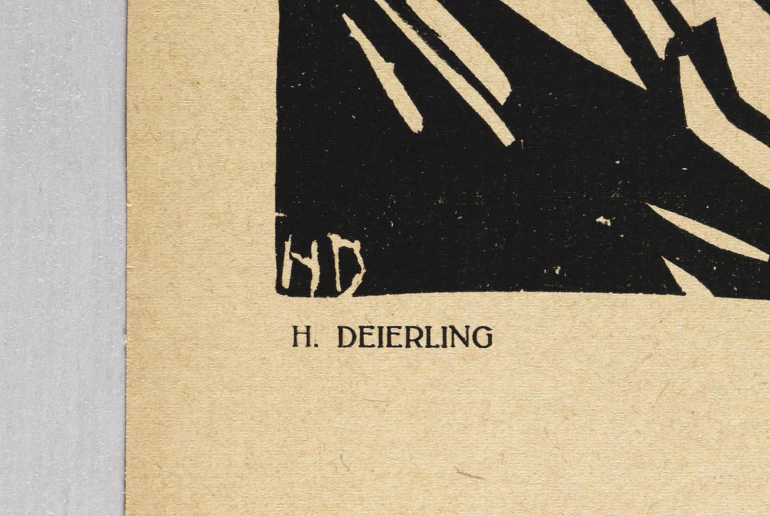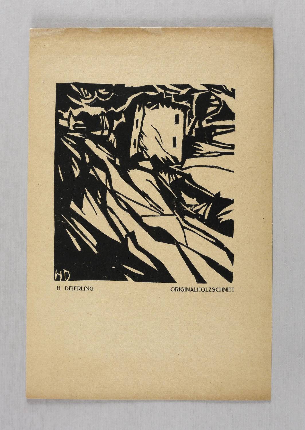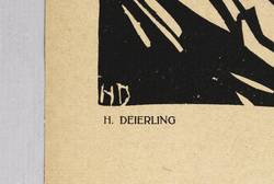 Aus: Heinrich Harry Deierling, Wilhelm Kohlhoff & Ernst Fritsch, Impression Expression. Ausstellungskatalog (Berlin: Kunstsalon Angerstein 1914). – Nicht handsigniert. Im Druckstock lins unten Monogramm: ″HD″. Unterhalb der Darstellung typografisch bezeichnet: ″H: DEIERLLING / ORIGINALHOLZSCHNITT″. Verso kleine Sammlernotiz. – Originalgrafische Beilage für den Katalog der Ausstellung ″Impression Expression″ im Kunstsalon Angerstein in Berlin 1914. – Originalrandiges Exemplar. Papier altersbedingt gedunkelt. Keine Schäden. Recht guter Zustand.